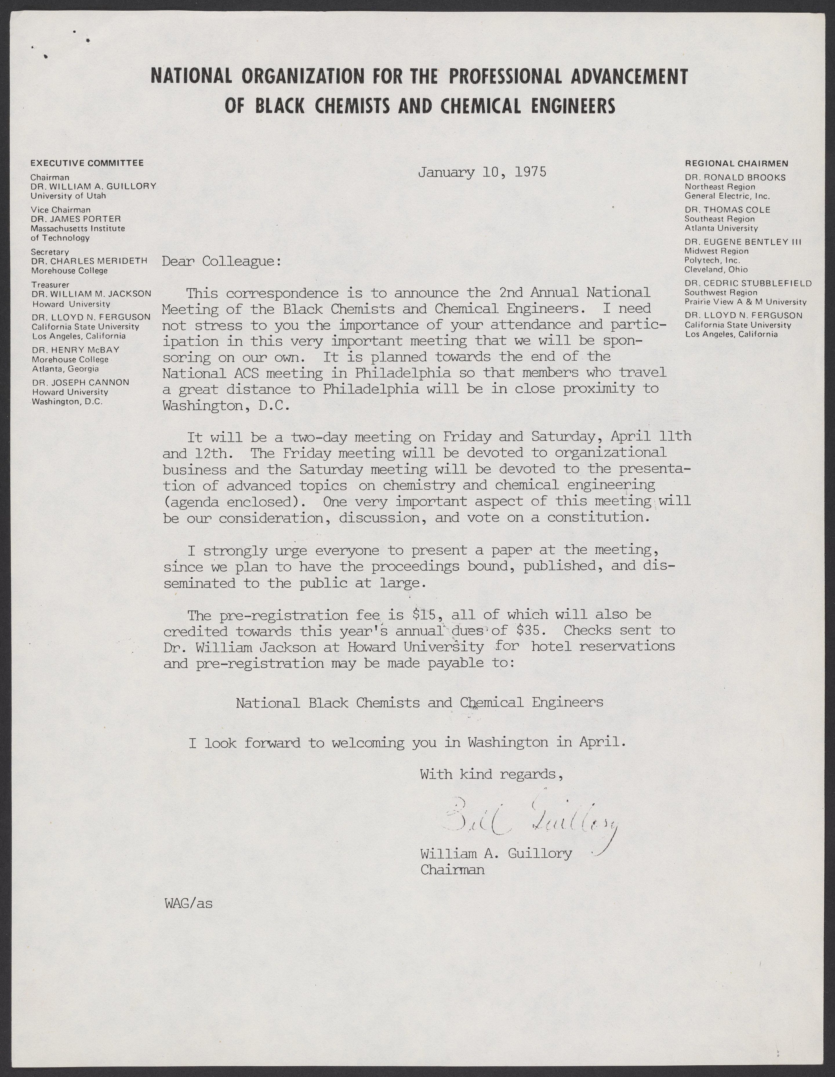 Guillory, William A., and National Organization for Black Chemists and Chemical Engineers. “Letter from William A. Guillory, January 10, 1975,” January 10, 1975. William A. Lester, Jr. Papers, Box 44, Folder 19. Science History Institute. Philadelphia. https://digital.sciencehistory.org/works/eyivhk8.