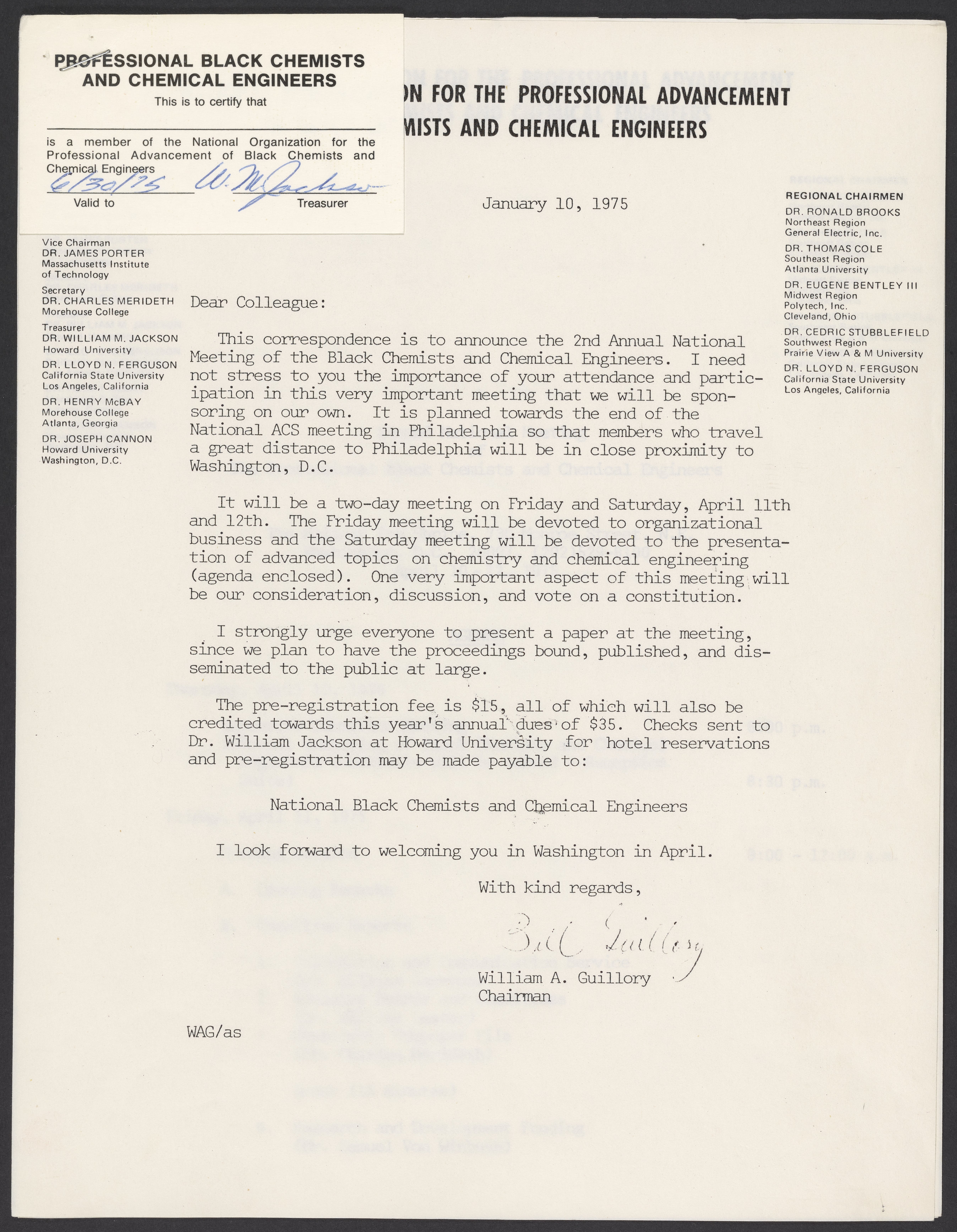 Guillory, William A., and National Organization for Black Chemists and Chemical Engineers. “Letter from William A. Guillory, January 10, 1975,” January 10, 1975. William A. Lester, Jr. Papers, Box 44, Folder 19. Science History Institute. Philadelphia. https://digital.sciencehistory.org/works/eyivhk8.