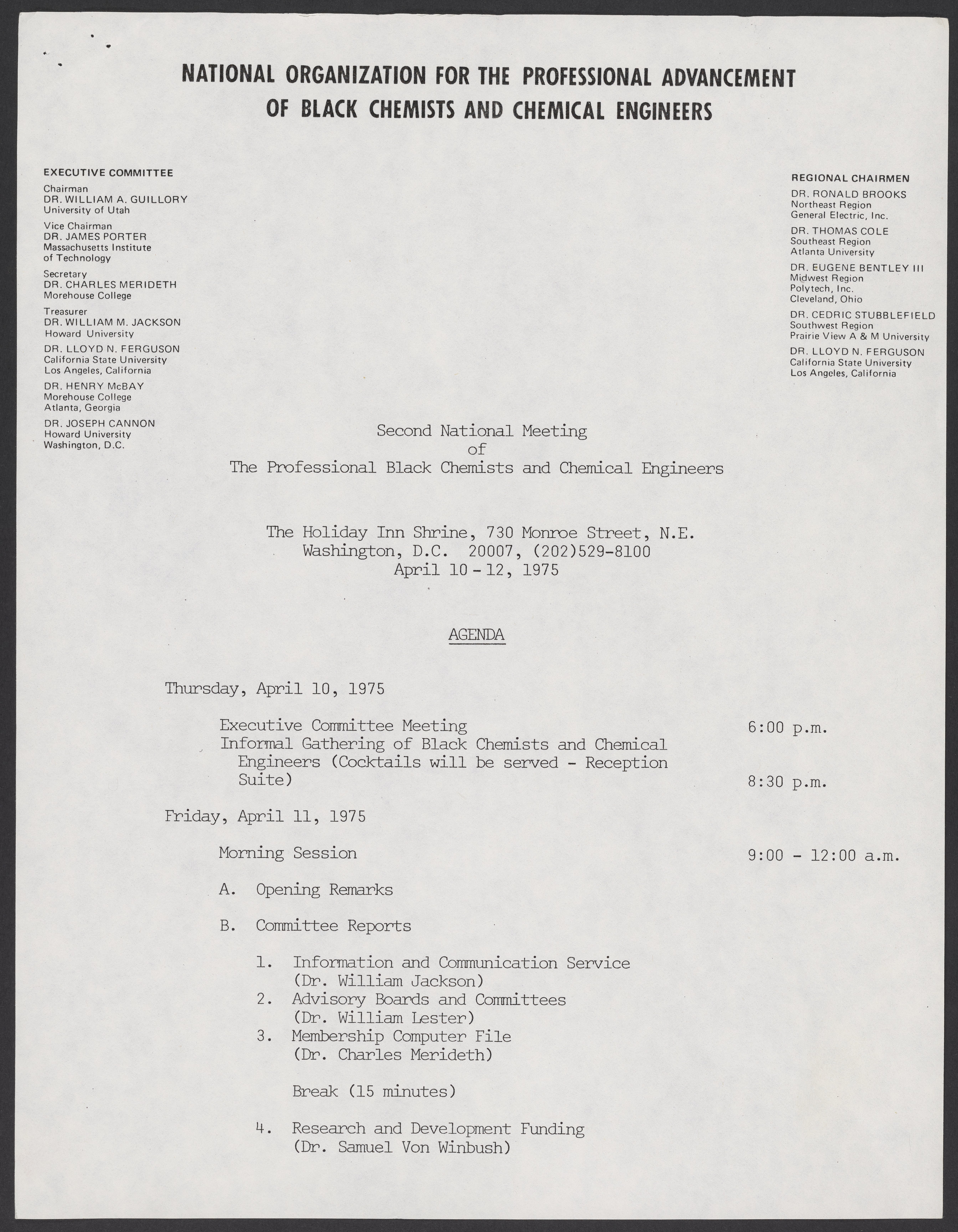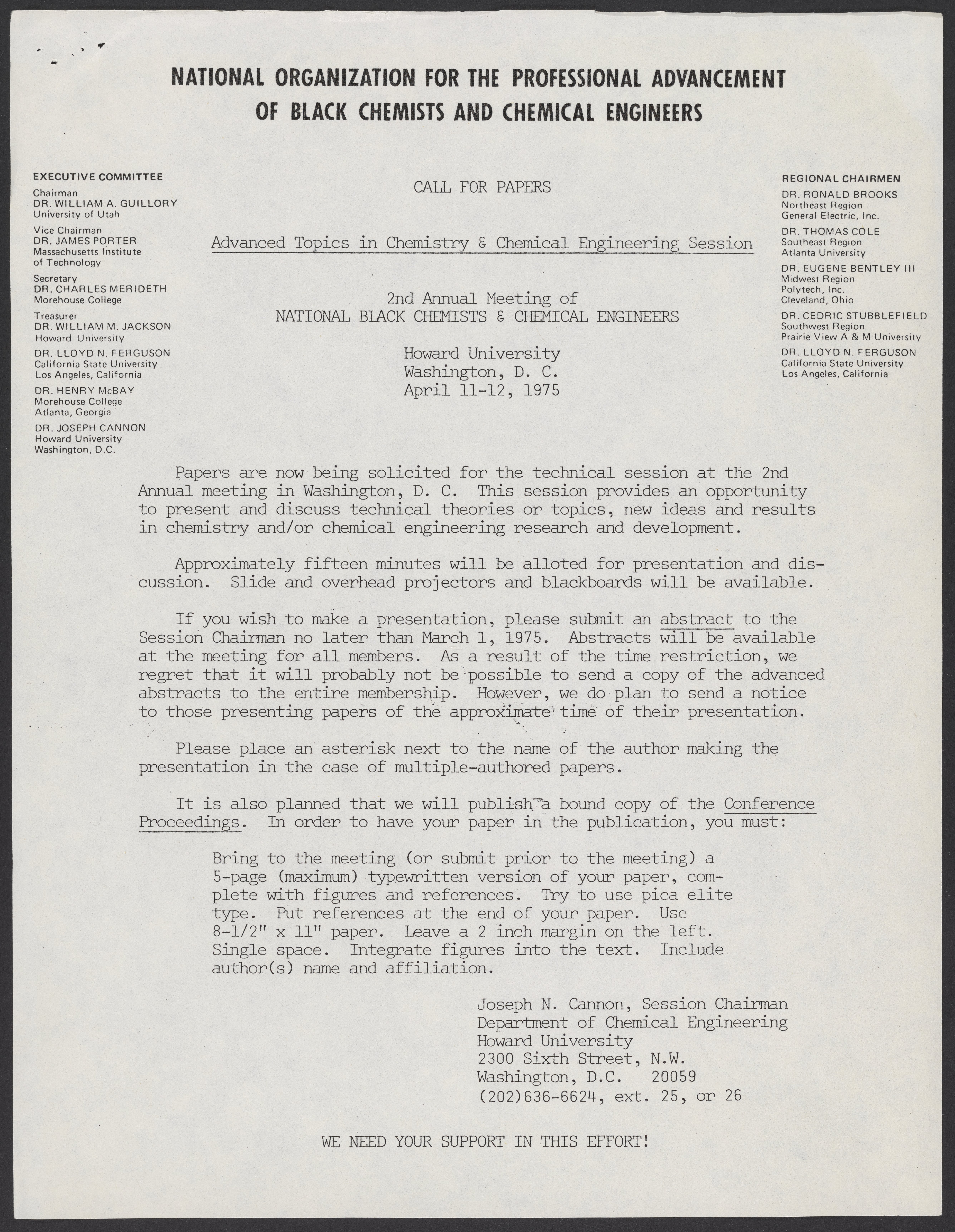 Small JPG1200 x 1545px — 278 KBLarge JPG2880 x 3707px — 1.4 MBFull-sized JPG5390 x 6938px — 4.9 MBOriginal fileTIFF — 5390 x 6938px — 107 MBWilliam A. Guillory, announces the 2nd Annual National Meeting of the Black Chemists and Chemical Engineers, held by the National Organization for the Professional Advancement of Black Chemists and Chemical Engineers (NOBCChE). Attached to the announcement is an agenda for the conference, and a call for papers to present.