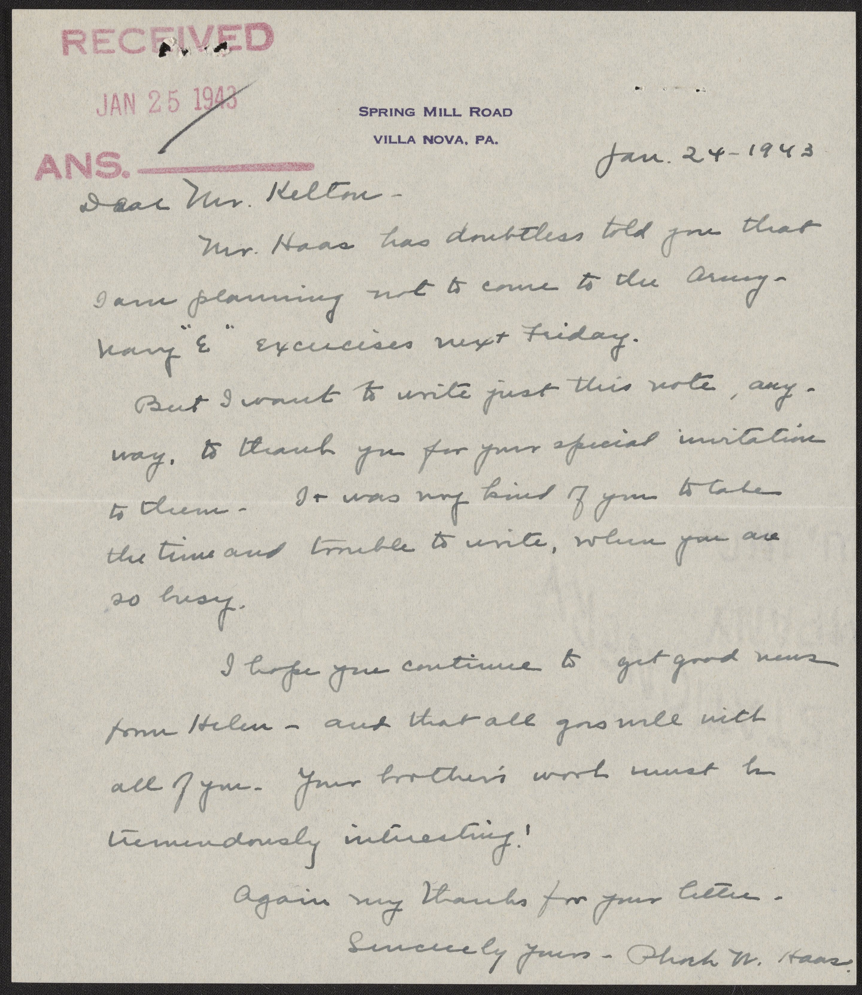Waterman Haas, Phoebe. “Letter from Phoebe Haas to Stanton C. Kelton, January 24, 1943,” January 24, 1943. Rohm & Haas Company Archives, Box 5, Folder 8. Science History Institute. Philadelphia. https://digital.sciencehistory.org/works/f0cfxpi.