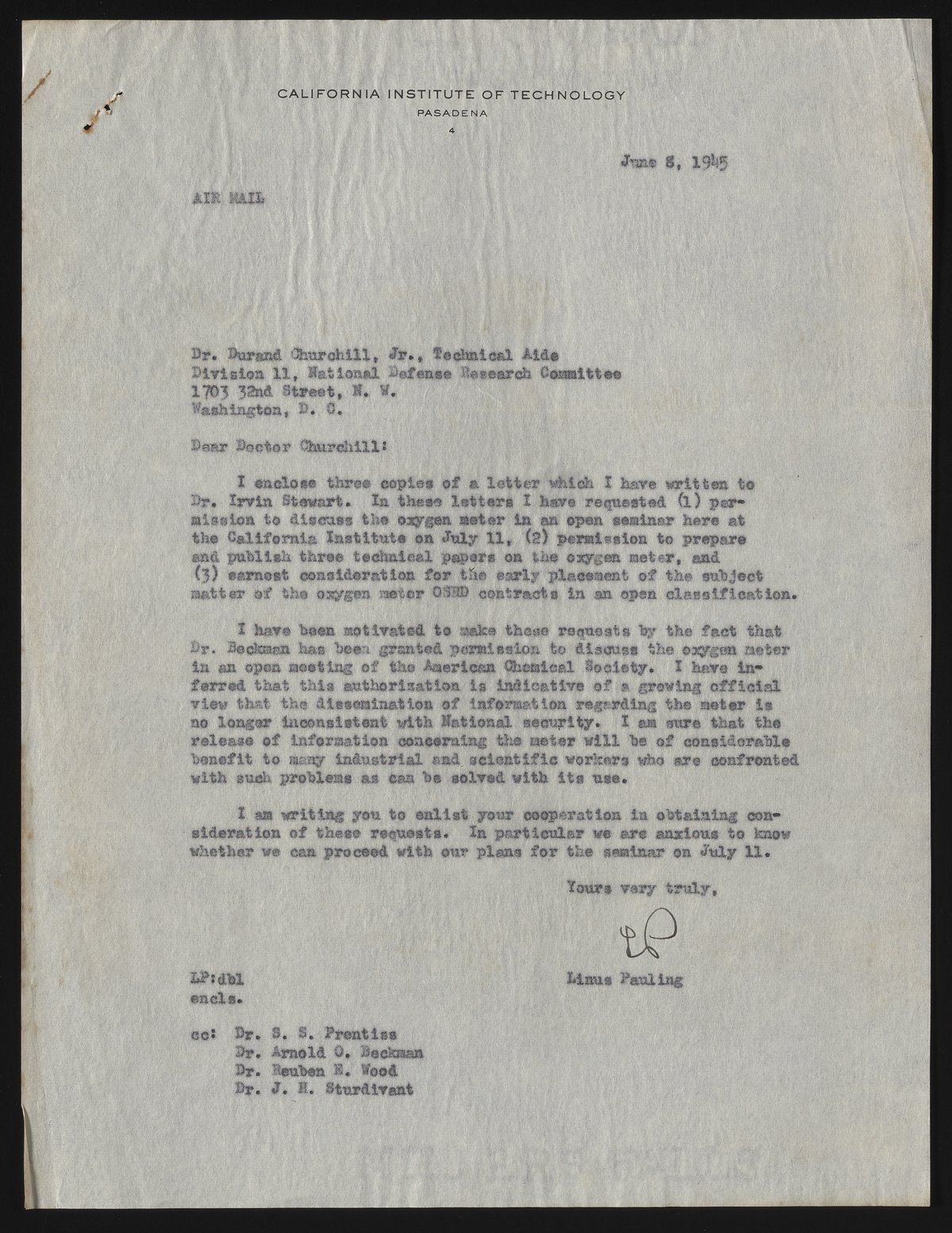 Pauling, Linus. “Letter from Linus Pauling to Durand Churchill, Jr.,” June 8, 1945. Beckman Historical Collection, Box 19, Folder 9. Science History Institute. Philadelphia. https://digital.sciencehistory.org/works/f1881m81j.