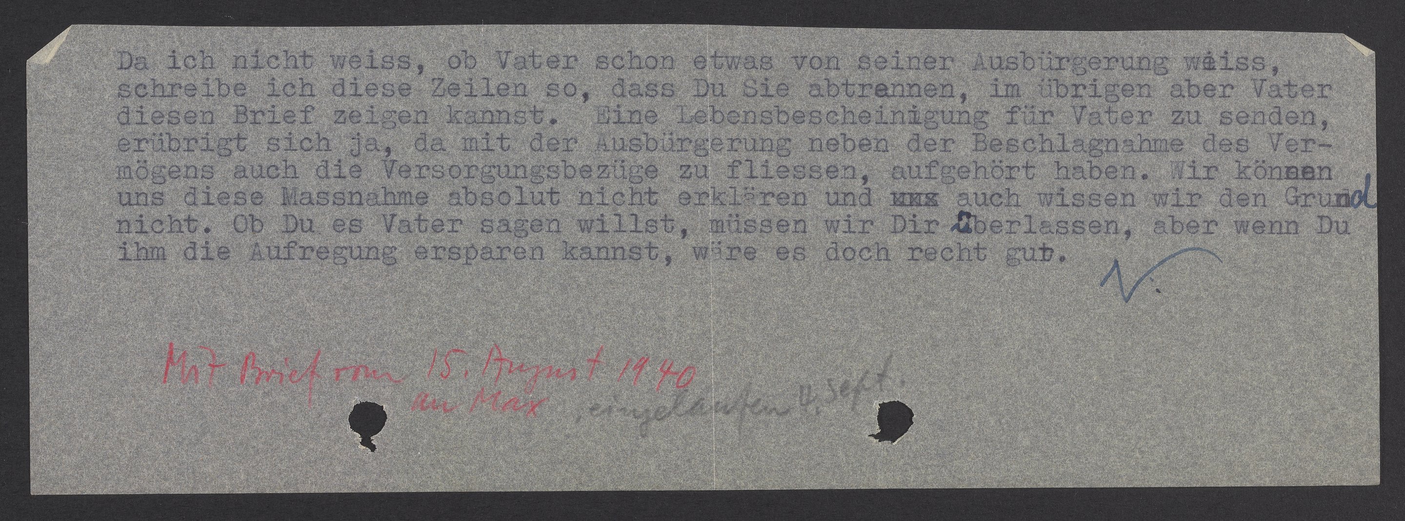 Da ich nicht weiss, ob Vater schon etwas von seiner Ausbürgerung weiss, schreibe ich diese Zeilen so, dass Du sie abtrennen, im übrigen aber Vater diesen Brief zeigen kannst. Eine Lebensbescheinigung für Vater zu senden, erübrigt sich ja, da mit der Ausbürgerung neben der Beschlagnahme des Vermögens auch die Versorgungsbezüge zu fliessen, aufgehört haben. Wir können uns diese Massnahme absolut nicht erklären und auch wissen wir den Grund nicht. Ob Du es Vater sagen willst, müssen wir Dir überlassen, aber wenn Du ihm die Aufregung ersparen kannst, wäre es doch recht gut.
