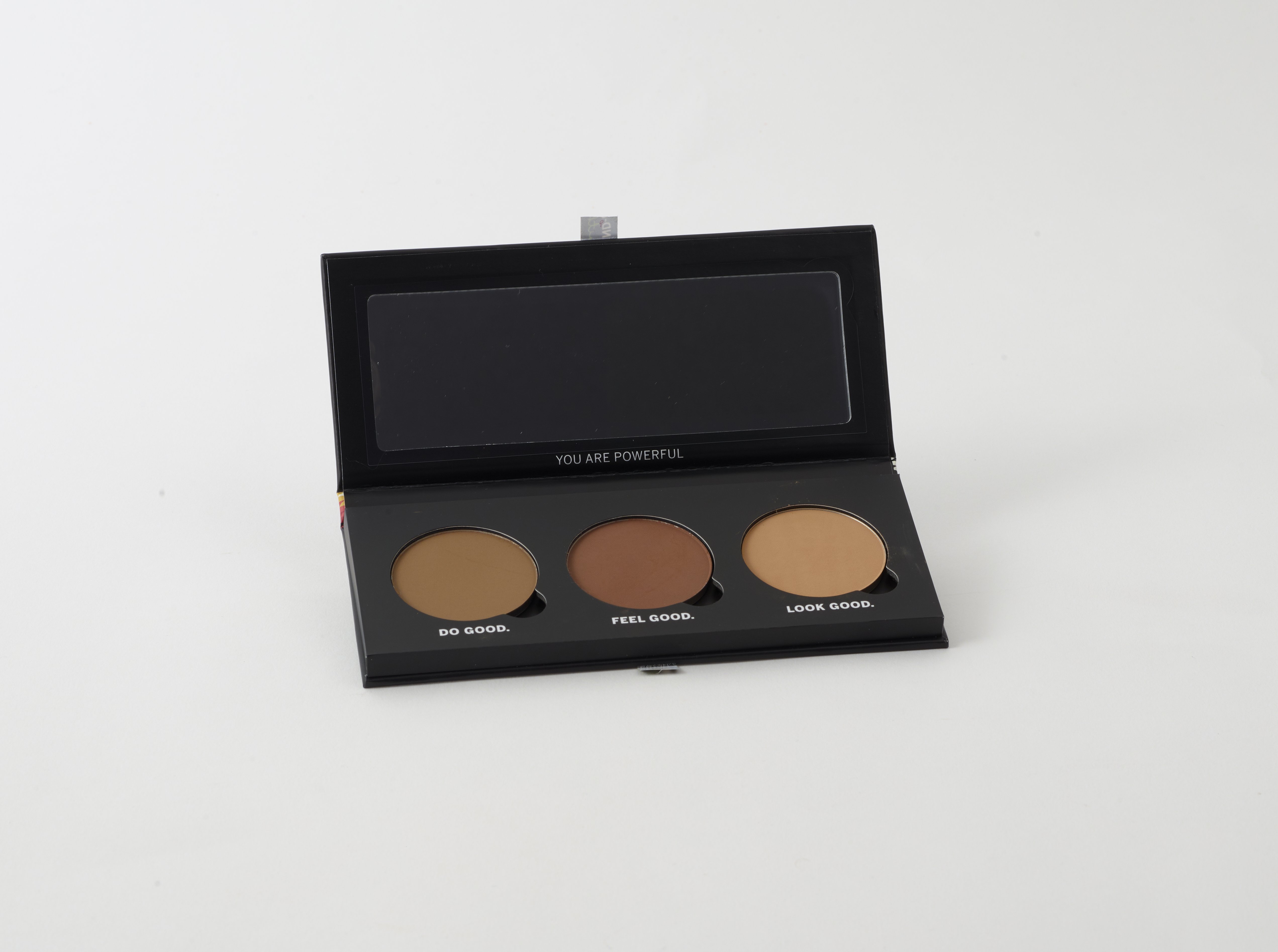 Small JPG1200 x 894px — 27.5 KBLarge JPG2880 x 2144px — 125 KBFull-sized JPG5086 x 3787px — 413 KBOriginal fileTIFF — 5086 x 3787px — 55.2 MBA black face powder palette manufactured by the Cheekbone Beauty company. Three powders are included in the palette, a matte contour, bronzer, and highlighter, each in the tone "Deep Warm" with the words "DO GOOD.," "FEEL GOOD.," and "LOOK GOOD." printed beneath each powder respectively. The palette also includes a mirror, under which reads "YOU ARE POWERFUL."