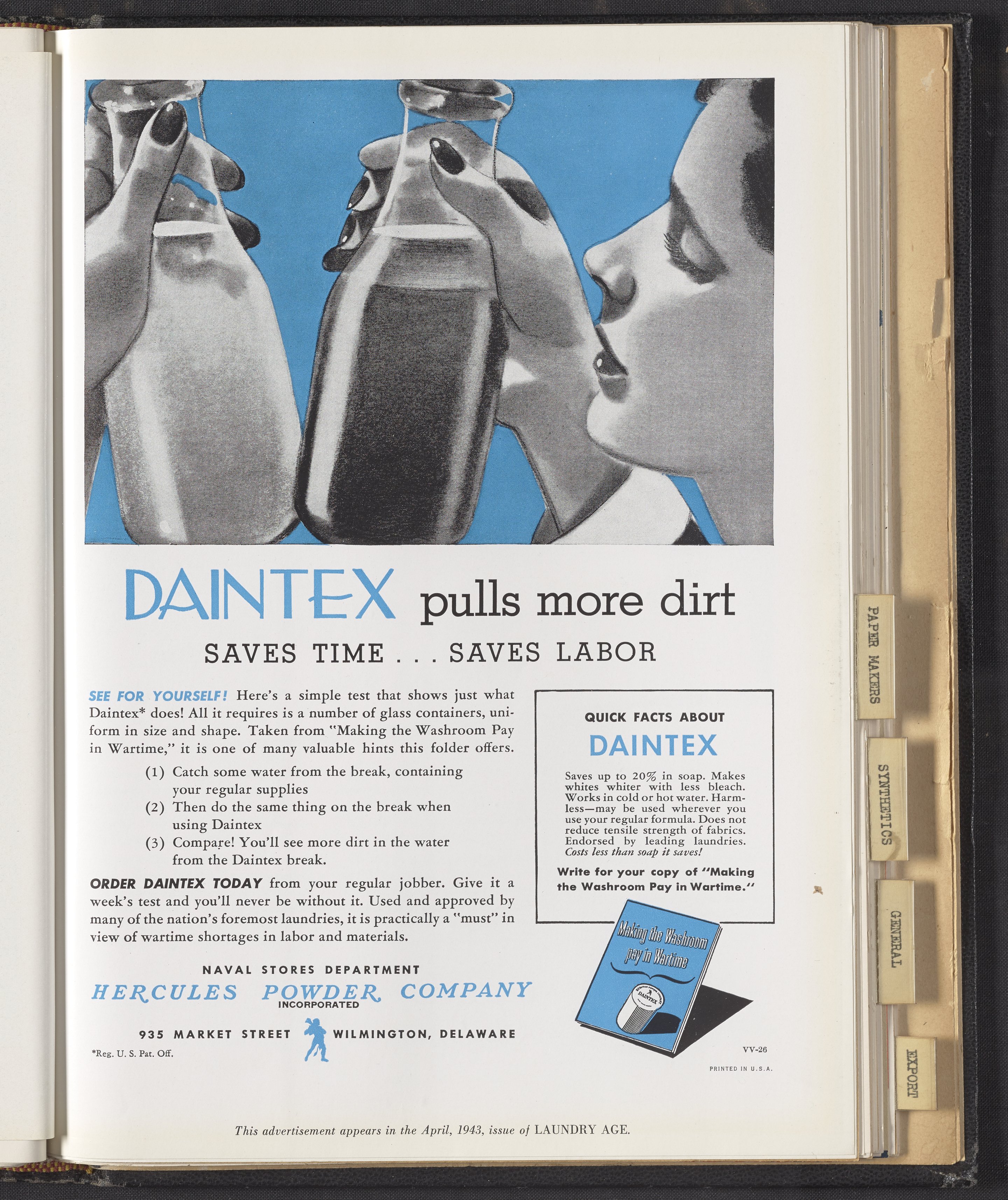 Hercules Incorporated. “Daintex Pulls More Dirt, Saves Time...Saves Labor.” 1943 Hercules Advertisements, 1943. Records of Hercules Incorporated, Volume 1943. Science History Institute. Philadelphia. https://digital.sciencehistory.org/works/f7623d24d.