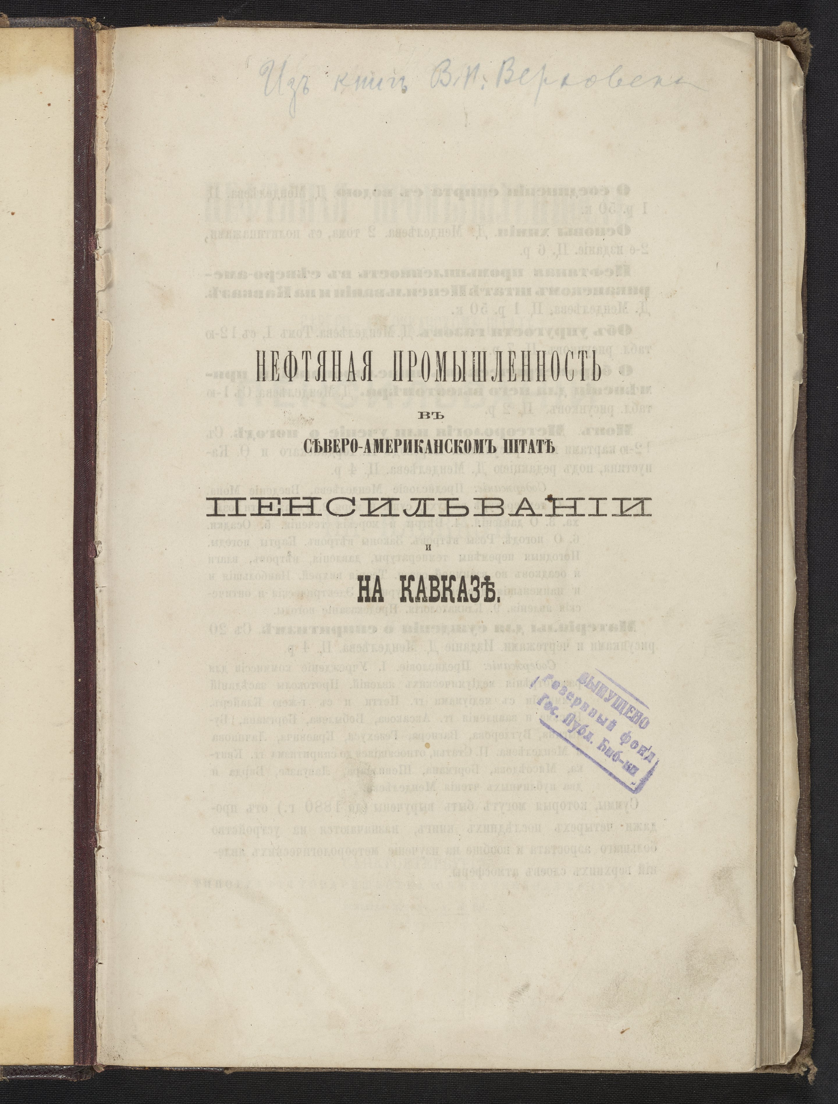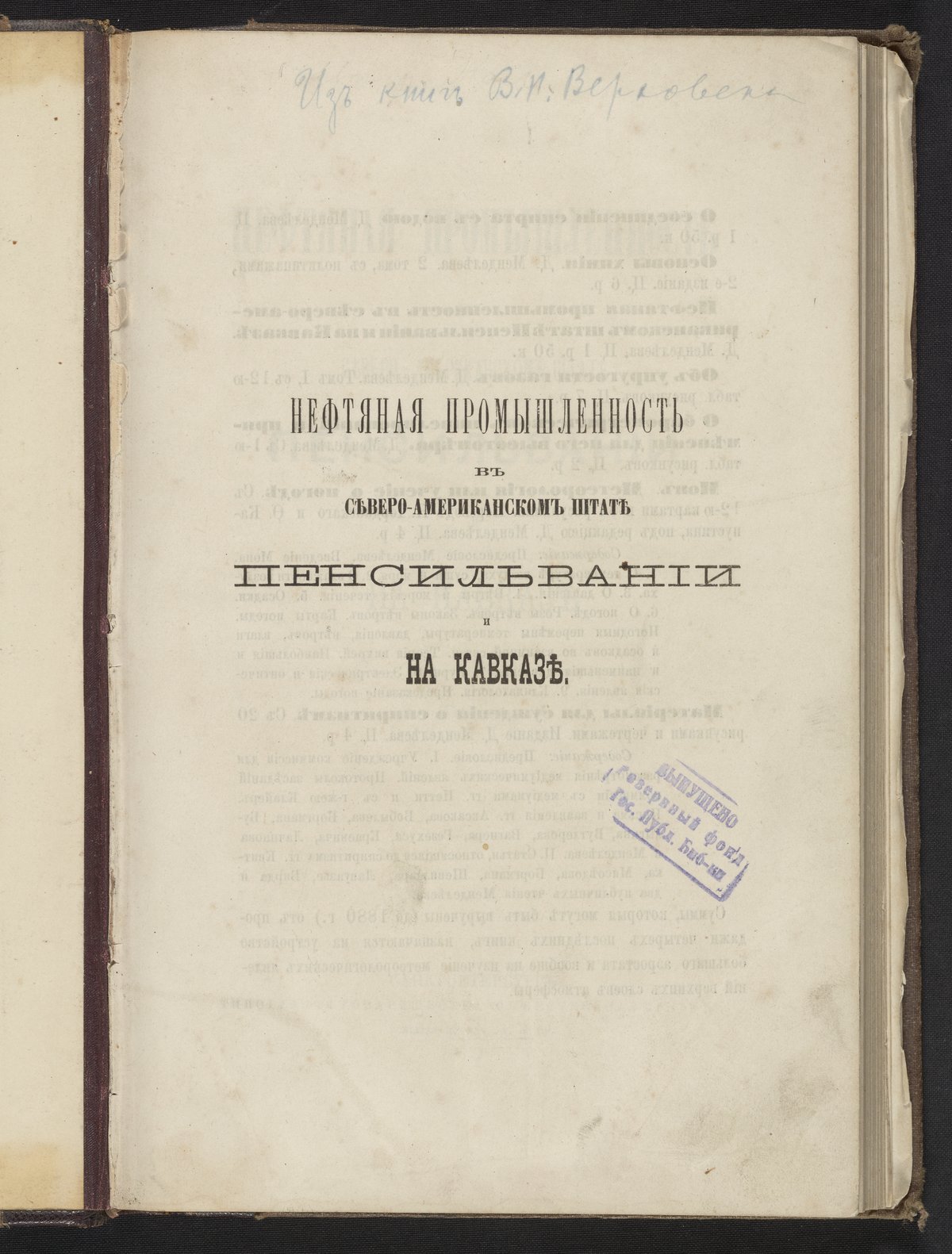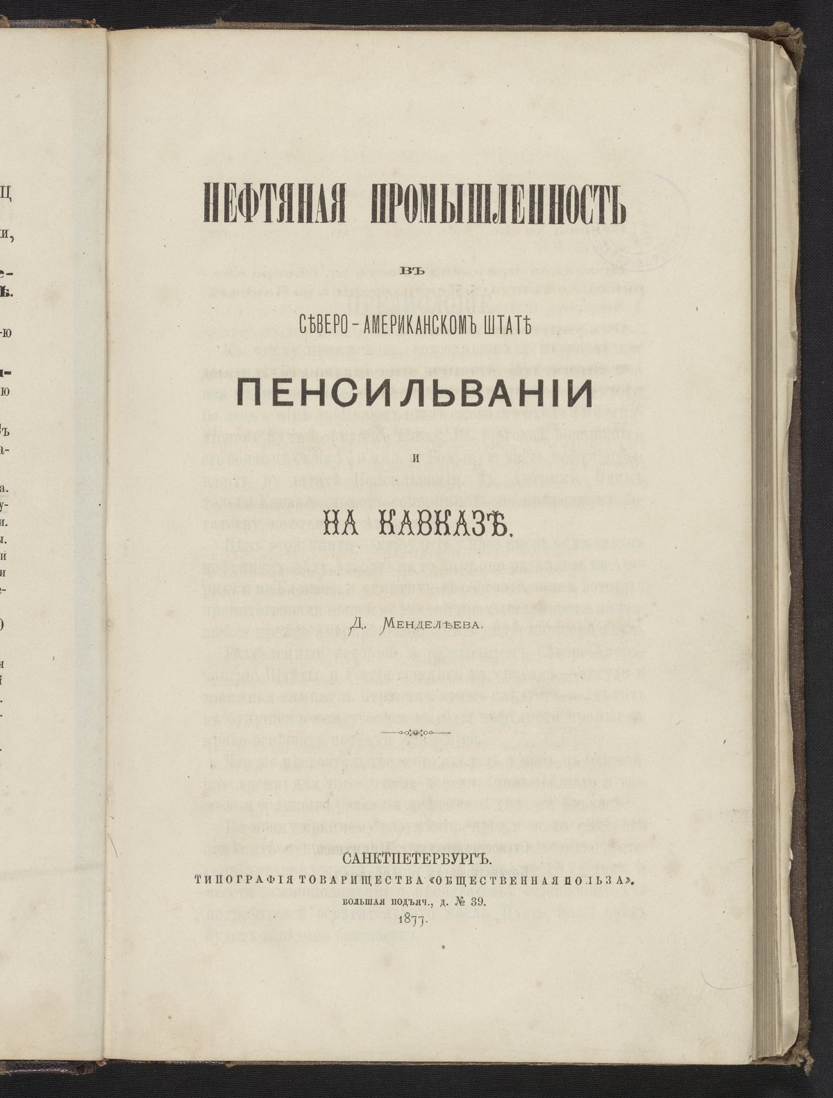 Mendeleyev, Dmitry Ivanovich. Neft︠i︡ana︠i︡a Promyshlennostʹ v s︠i︡evero-Amerikanskom shtat︠i︡e Pensilʹvanīi i Na Kavkaze. Saint Petersburg, Russia (Federation): Tipografia tovaritchestva Obshchestvenna︠i︡a polʹza, 1877. https://digital.sciencehistory.org/works/fagrxsp.