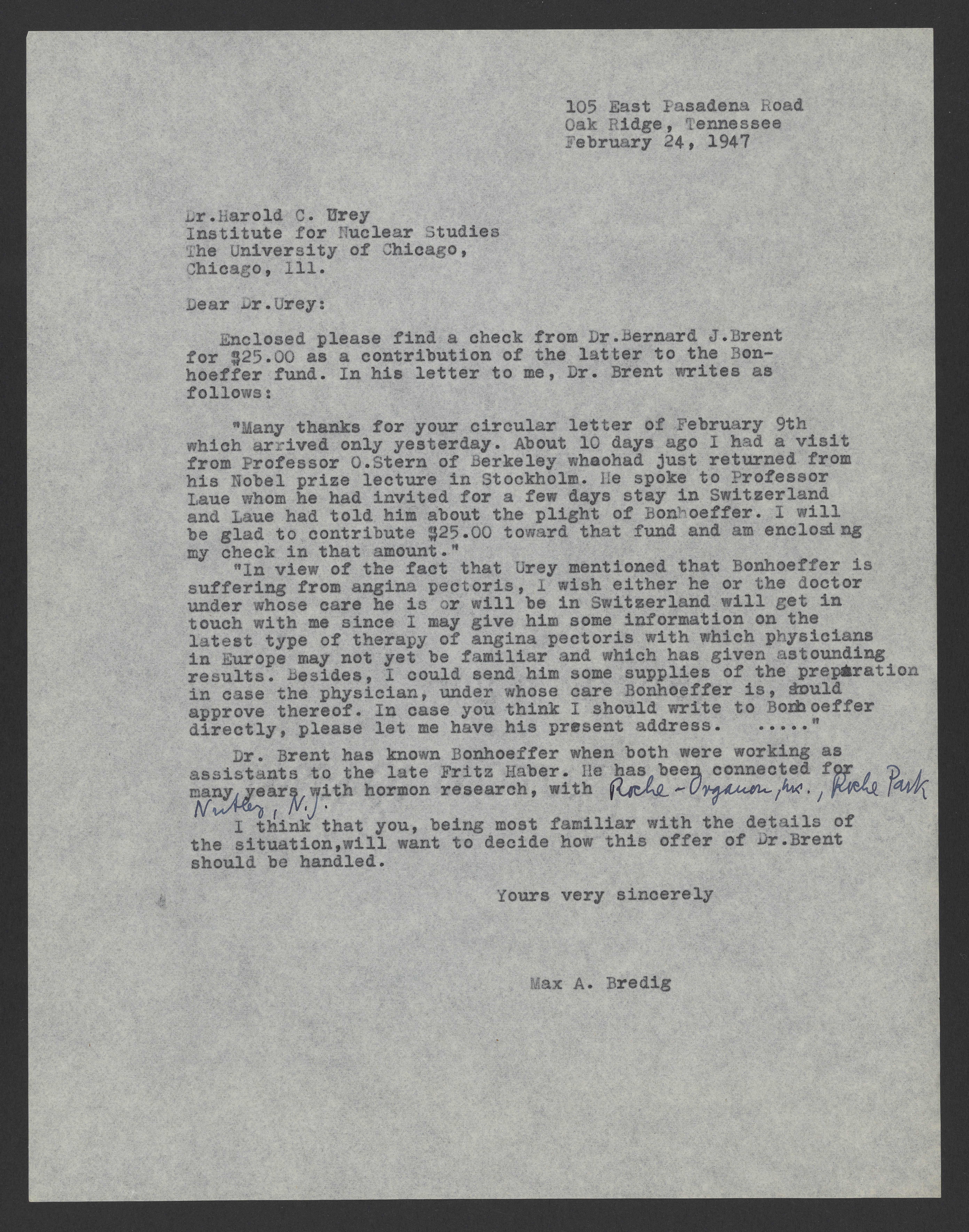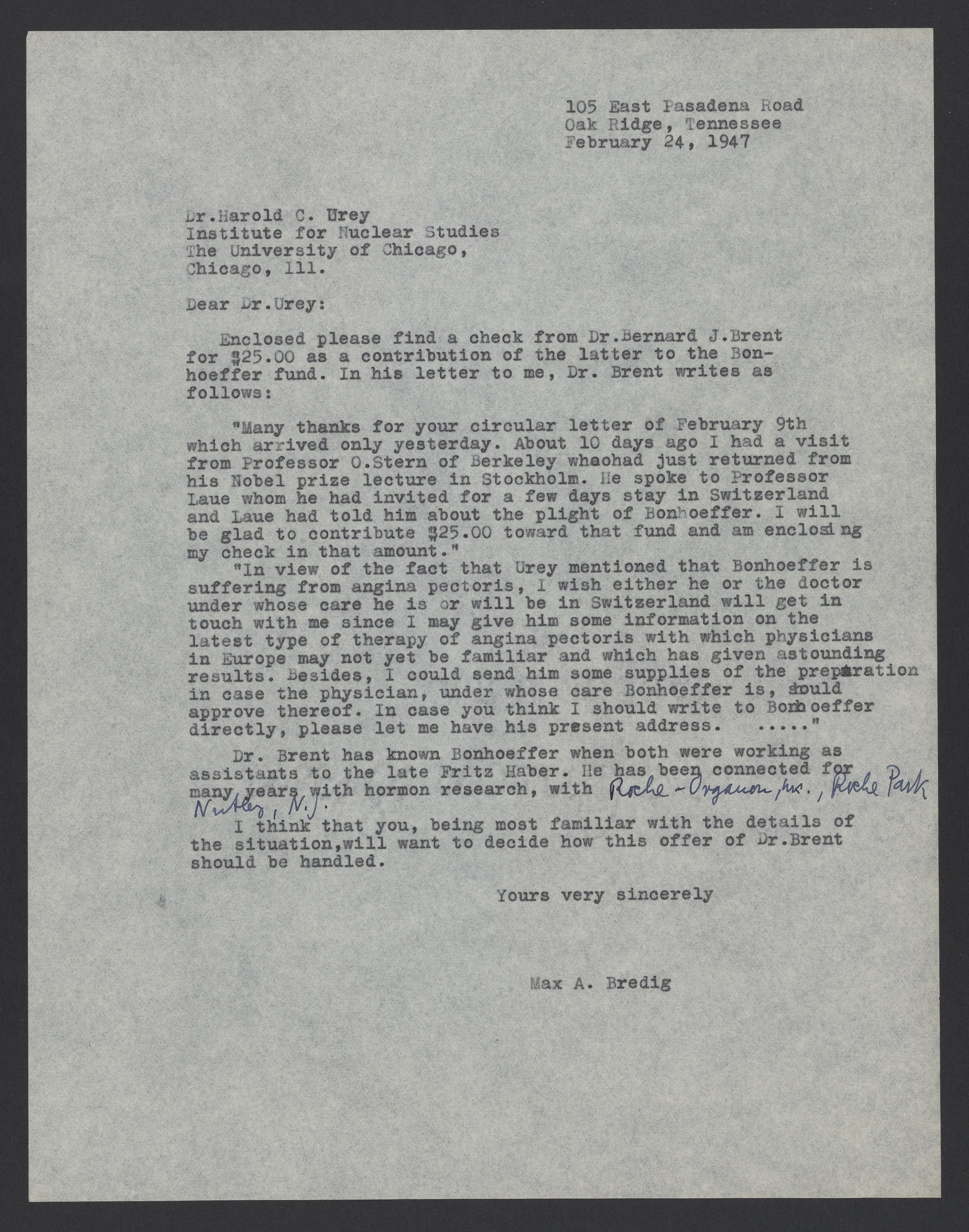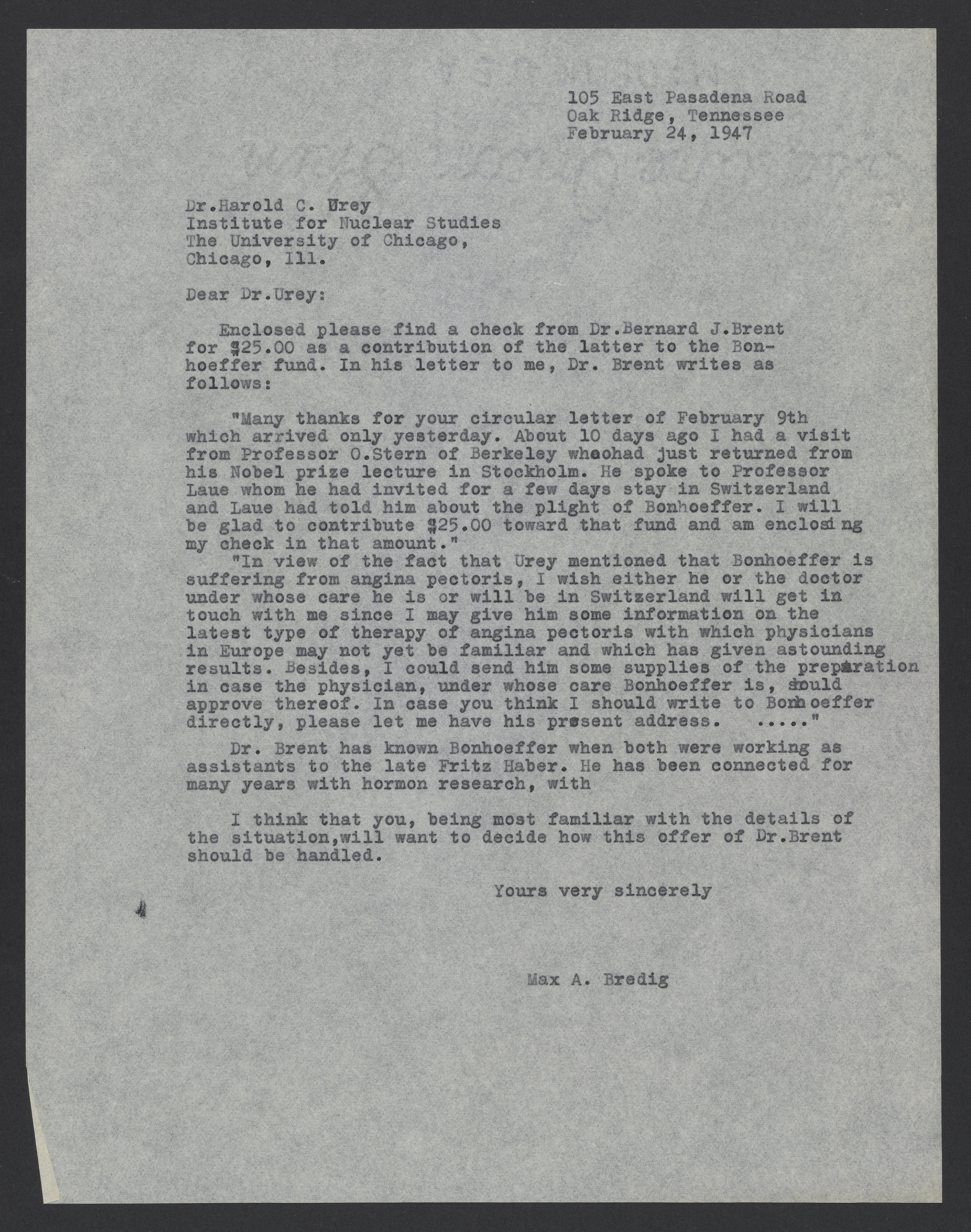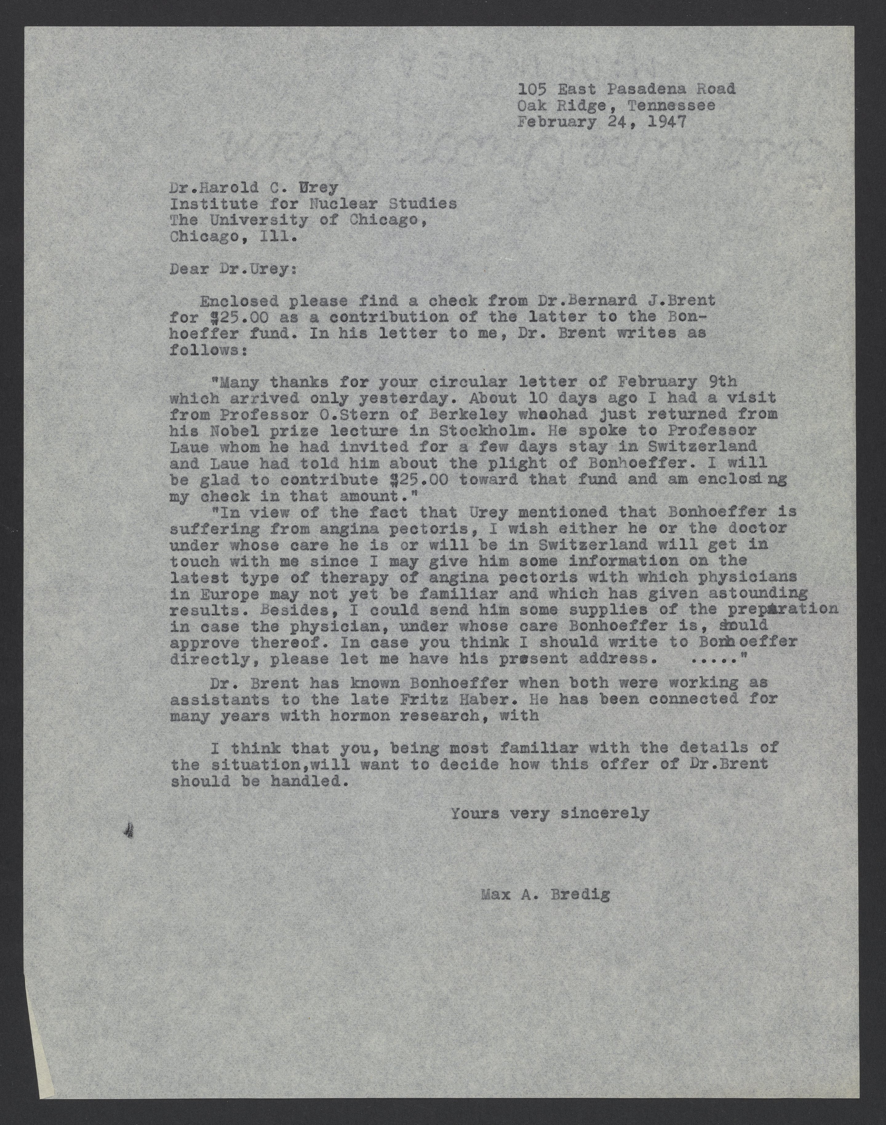 Small JPG1200 x 1526px — 371 KBLarge JPG2880 x 3663px — 2.4 MBFull-sized JPG5568 x 7081px — 8.3 MBOriginal fileTIFF — 5568 x 7081px — 113 MBMax Bredig (1902-1977) forwards a check and message from Bernard J. Brent in contribution to medical care for Karl-Friedrich Bonhoeffer (1899-1957).