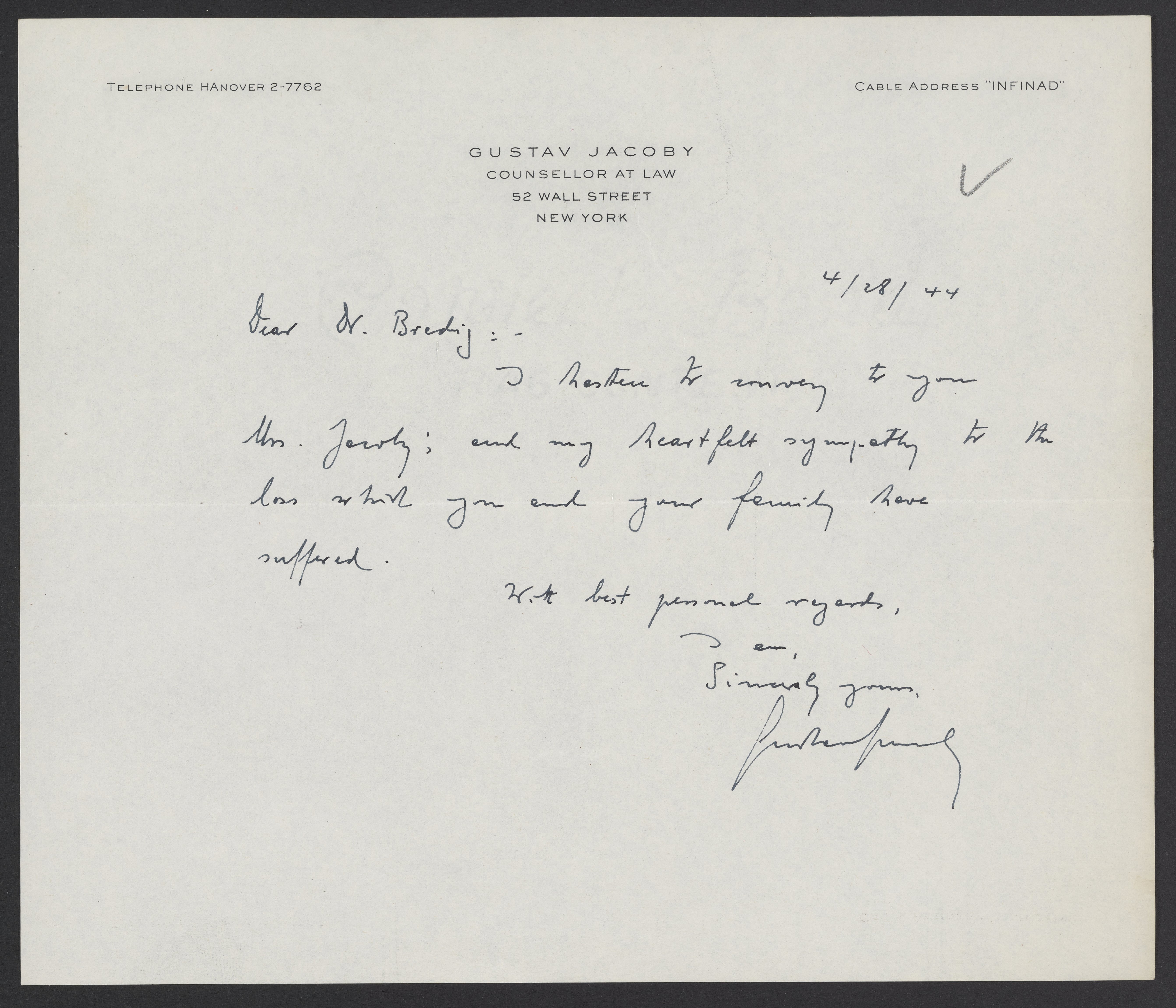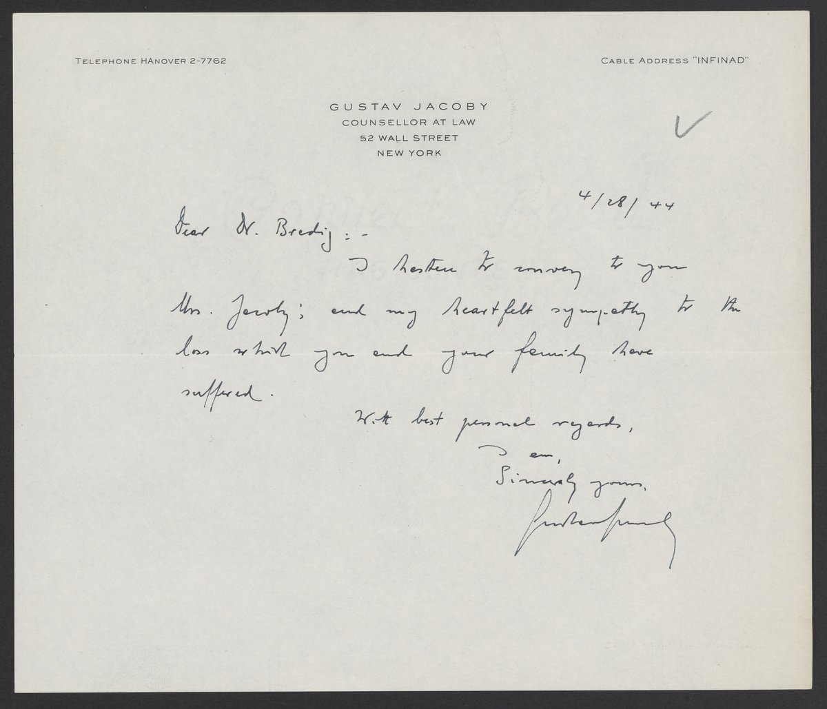 Jacoby, Gustav. “Letter of Condolence from Gustav Jacoby to Max Bredig,” April 28, 1944. Papers of Georg and Max Bredig. Science History Institute. Philadelphia. https://digital.sciencehistory.org/works/favc3ih.