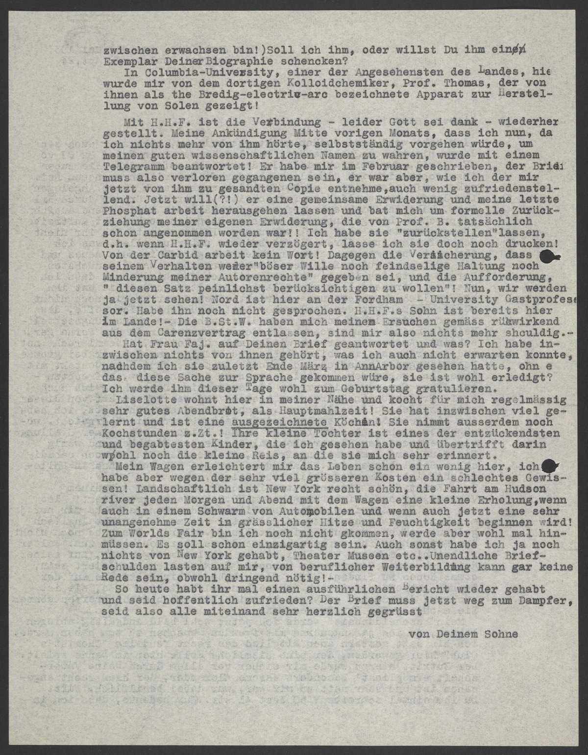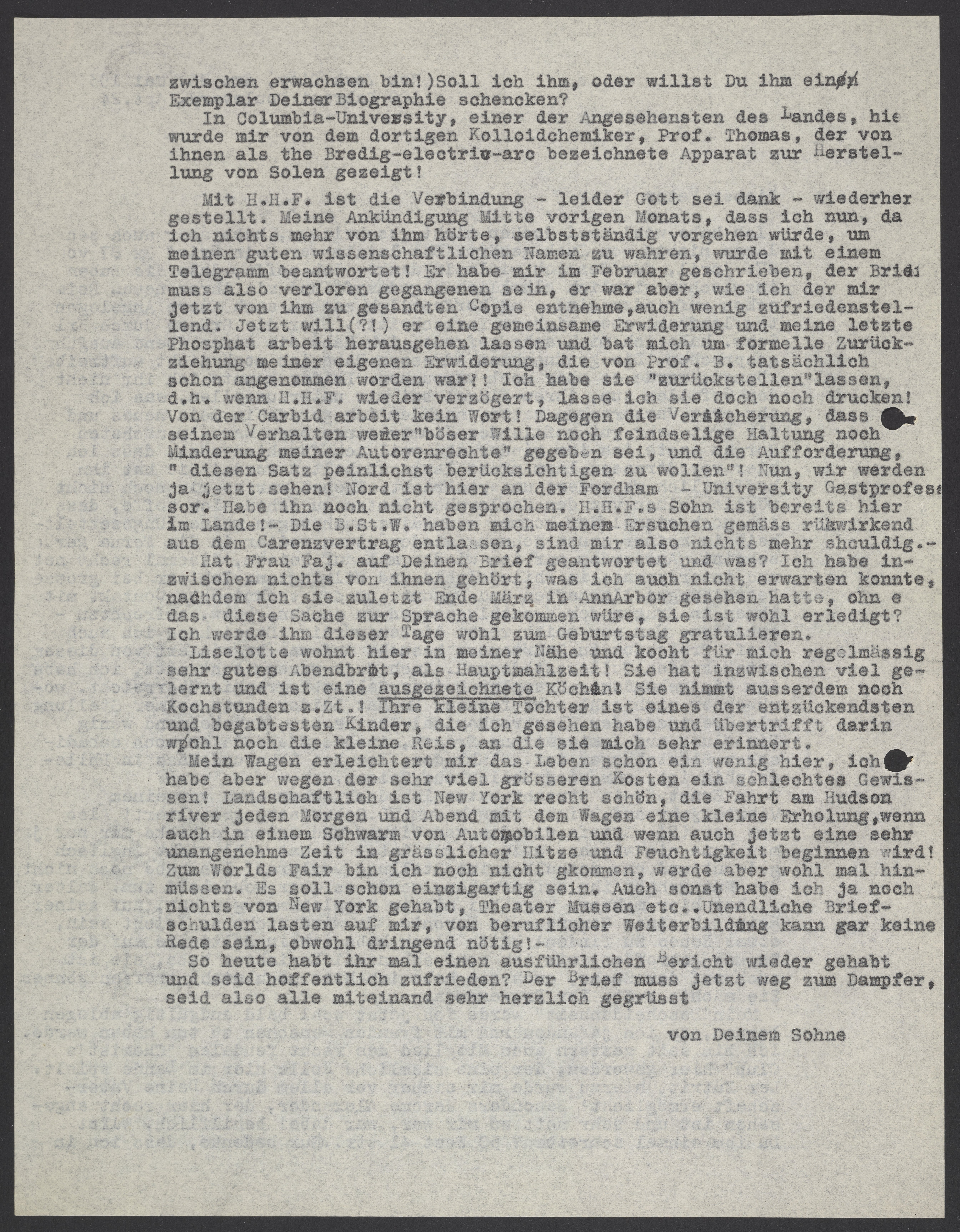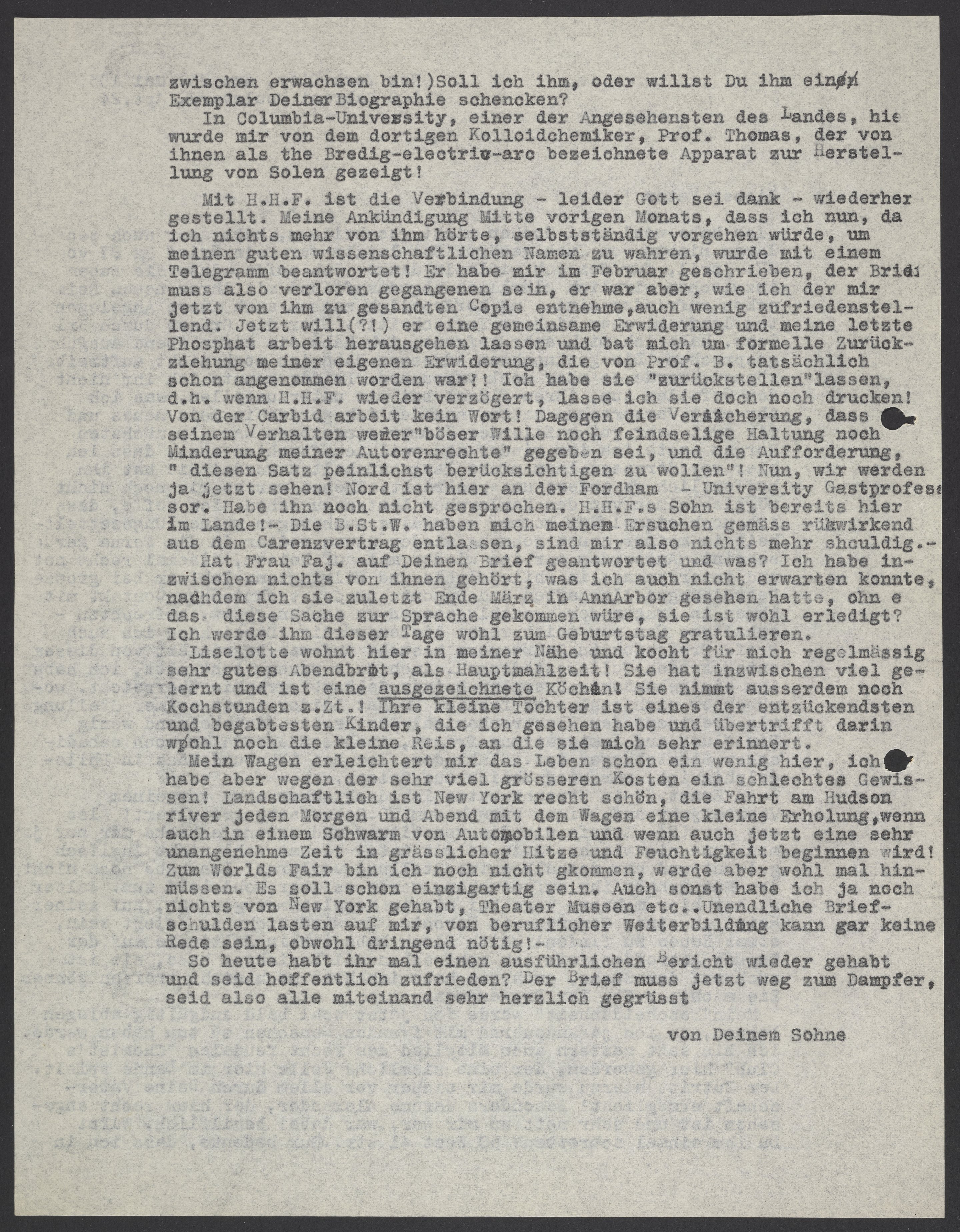 Mit H.H.F ist die Verbindung – leider Gott – sei dank – wiederhergestellet. Meine Ankündigung Mitte vorigen Monats, dass ich nun, da ich nichts mehr von ihm hörte, selbständig vorgehen würde, um meinen guten wissenschaftlichen Namen zu wahren, wurde mit einem Telegramm beantwortet! Er habe mir im Februar geschrieben, der Brief muss also verloren gegangen sein, er war aber, wie ich der mir jetzt von ihm zu gesandten Copie entehme, auch wenig zufriedenstellend. Jetzt will (?!) er eine geminsame Erwiderung und meine letzte Phosphat arbeit herausgehen lassen und bat mich um formelle Zurückziehung meiner eigenen Erwiderung, die von Prof. B. tatsächlich schon angenommen worden war!! Ich habe sie "zurückstellen" lassen, d.h. wenn H.H.F wieder verzögert, lasse ich sie doch noch drucken! Von der Carbid arbeit kein Wort! Dagegen die Versicherung, dass seinem Verhalten weder "böser Wille noch feindselige Haltung noch Minderung meiner Autorenrechte" gegeben sei, und die Aufforderung "diesen Satz peinlichst berücksichtigen zu wollen"! Nun wir werden ja jetzt sehen! Nord ist hier an der Fordham-University Gastprofessor. Habe ihn noch nicht gesprochen. H.H.F.s Sohn ist bereits hier im Lande! – B.St.W. haben mich meinem Ersuchen gemäss rückwirkend aus dem Carenzvertrag entlassen, sind mir also nichts mehr schuldig.