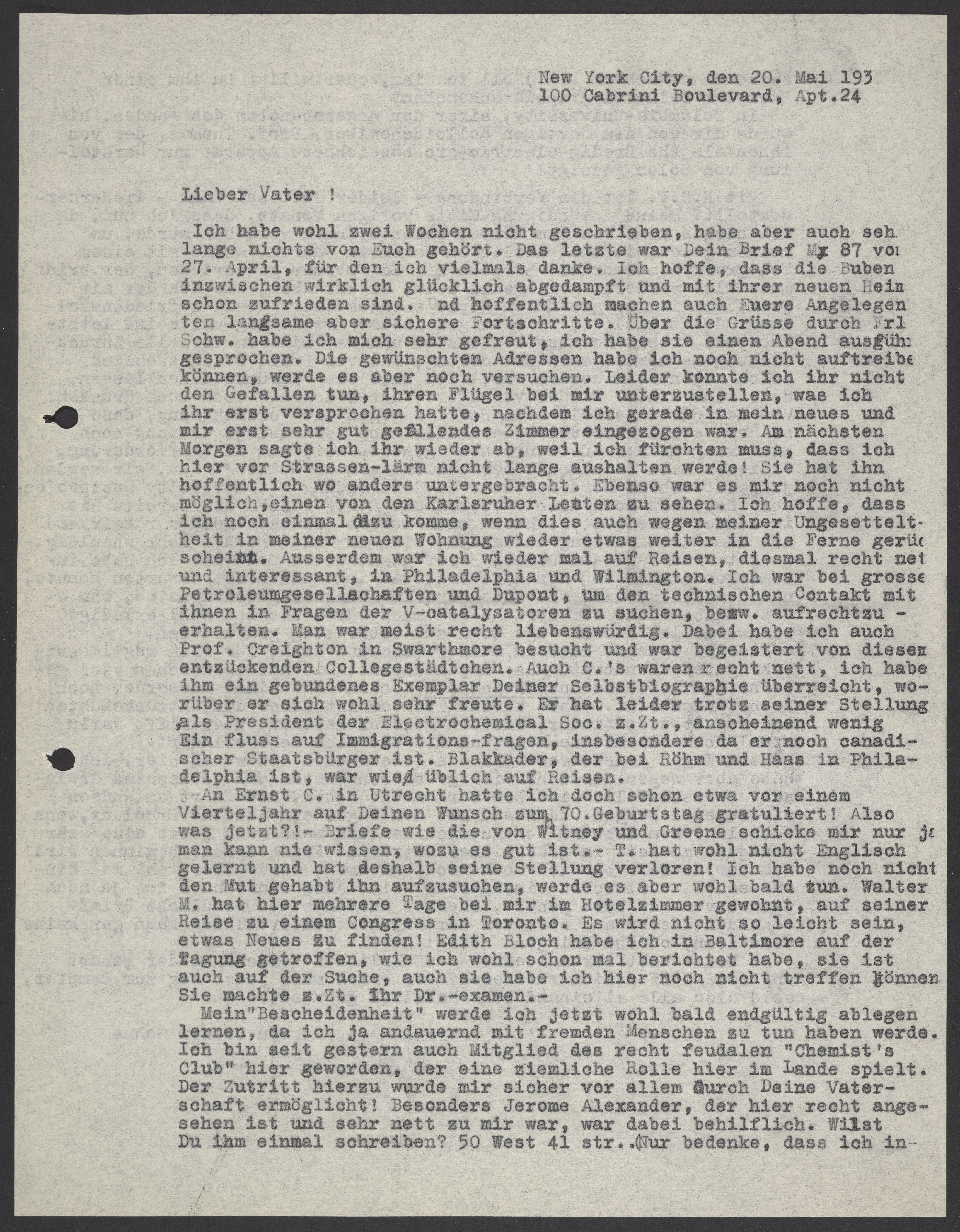 Ich habe wohl zwei Wochen nicht geschrieben, habe aber sehr lange nichts von Euch gehört. Das letzte war Dein Brief Mx 87, für den ich vielmals danke. Ich hoffe, dass die Buben inzwischen wirklich glücklich abgedampft mit ihrer neuen Heimat schon zufrieden sind. Und hoffentlich machen auch Euere Angelegenheiten langsame aber sichere Fortschritte. Über die Grüsse durch Frl. Schw. habe ich mich sehr gefreut, ich habe sie einen Abend ausführlich gesprochen. Die gewünschten Adressen habe ich noch nicht auftreiben können, werde es aber noch versuchen. Leider konnte ich ihr nicht den Gefallen tun, ihren Flügel bei mir unterzustellen, was ich ihr erst versprochen hatte, nachdem ich gerade in mein neues und mir erst sehr gut gefallendes Zimmer eingezogen war. Am nächsten Morgen sagte ich ihr wieder ab, weil ich fürchten muss, dass ich hier von Strassen-lärm nicht lange aushalten werde! Sie hat ihn hoffentlich wo anders untergebracht. Ebenso war es mir noch nicht möglich, einen von Karlsruher Leuten zu sehen. Ich hoffe, dass ich noch einmal dazu komme, wenn dies auch wegen meiner Ungesetteltheit in meiner neuen Wohnung wieder etwas weiter in die Ferne gerückt scheint. Ausserdem war ich wieder mal auf Reisen, diesmal recht nett und interessant, in Philadelphia und Wilmington. Ich war bei grossen Petroleumgesellschaften und Dupont, um den technischen Contakt mit ihnen in Fragen der V-catalysatoren zu suchen, bezw. aufrechtzuerhalten. Man war meist recht liebwürdig. Dabei habe ich auch Prof. Creighton in Swarthmore besucht und war begeistert von diesem entzückenden Collegestädtchen. Auch C.‘s waren recht nett, ich habe ihm ein gebundenes Exemplar Deiner Selbstbiographie überreicht, worüber er sich wohl sehr freute. Er hat leider trotz seiner Stellung als Preisdent der Eletrochemical Soc. z.Zt., anscheindend wenig Einfluss auf Immigrations-fragen, insbesondere da er noch canadischer Staatbürger ist. Blakkader, der bei Röhm und Haas ind Philadelphia ist, war wie üblich auf Reisen.