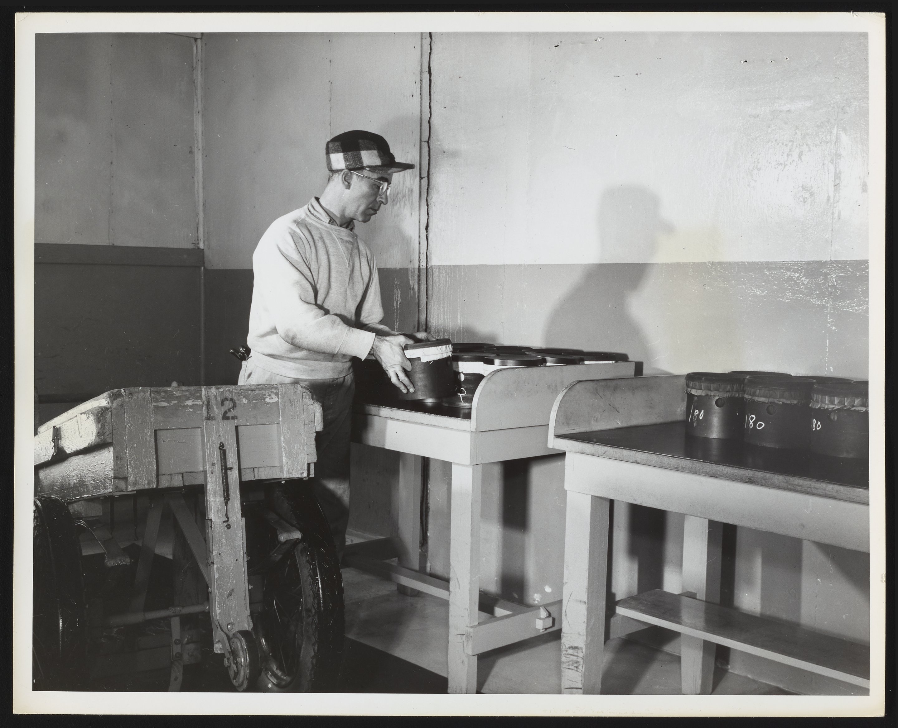 General view of employee James (Jay) Fiore transferring dry powder from the dry house to the mix house at the Hercules Powder Company plant in Port Ewen, New York. Notably, the powder, which was used in the manufacture of electric blasting caps, was always transferred and rested in rubber in order to avoid the hazard of metal, which might cause a spark or a shock.