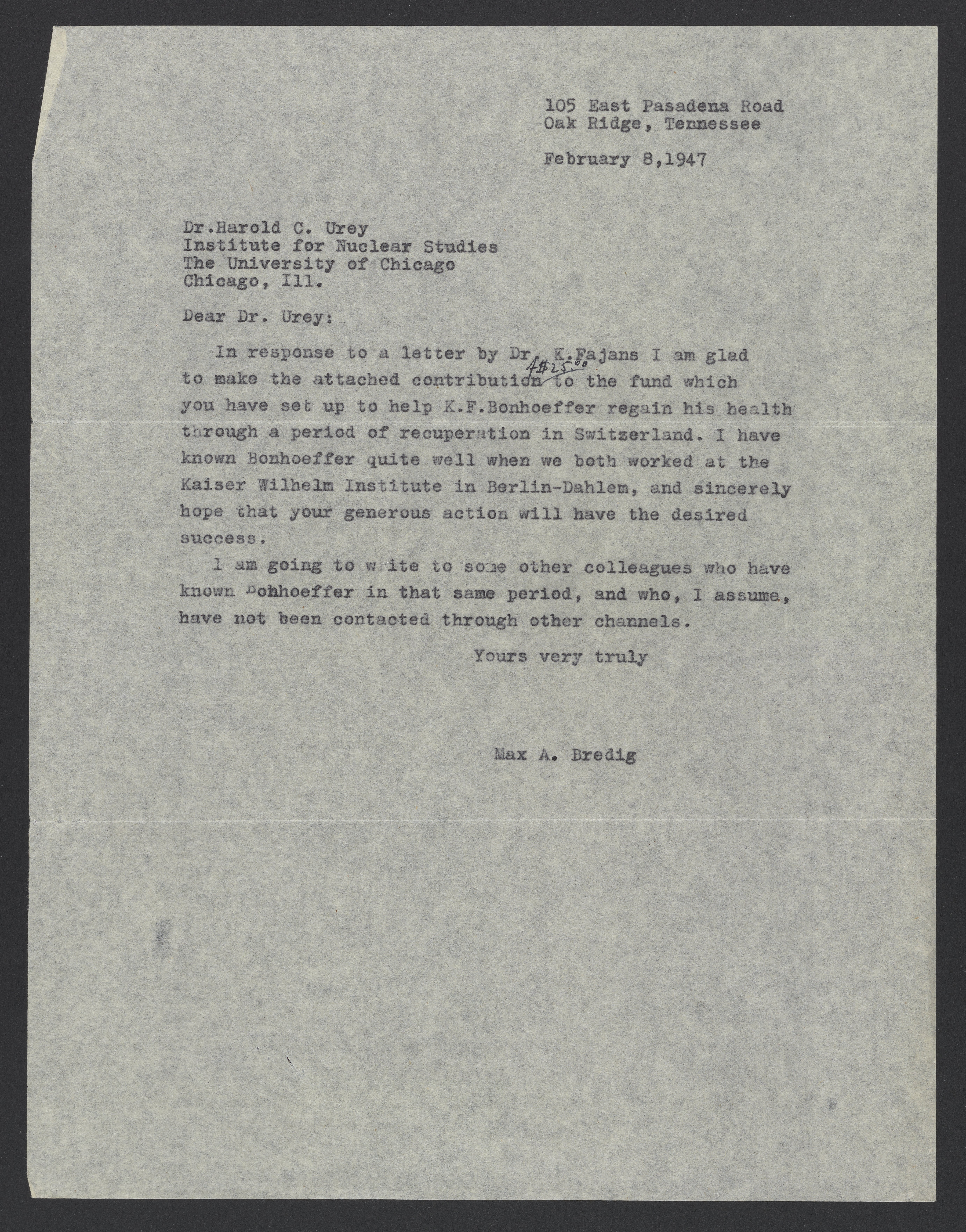 Max Bredig (1902-1977) contributes $25.00 to help Karl Friedrich Bonhoeffer (1899-1957) recover from angina pectoris (chest pain). Bredig tells Harold C. Urey (1893-1981) that he will write to other colleagues who know Bonhoeffer in hopes they will help as well.