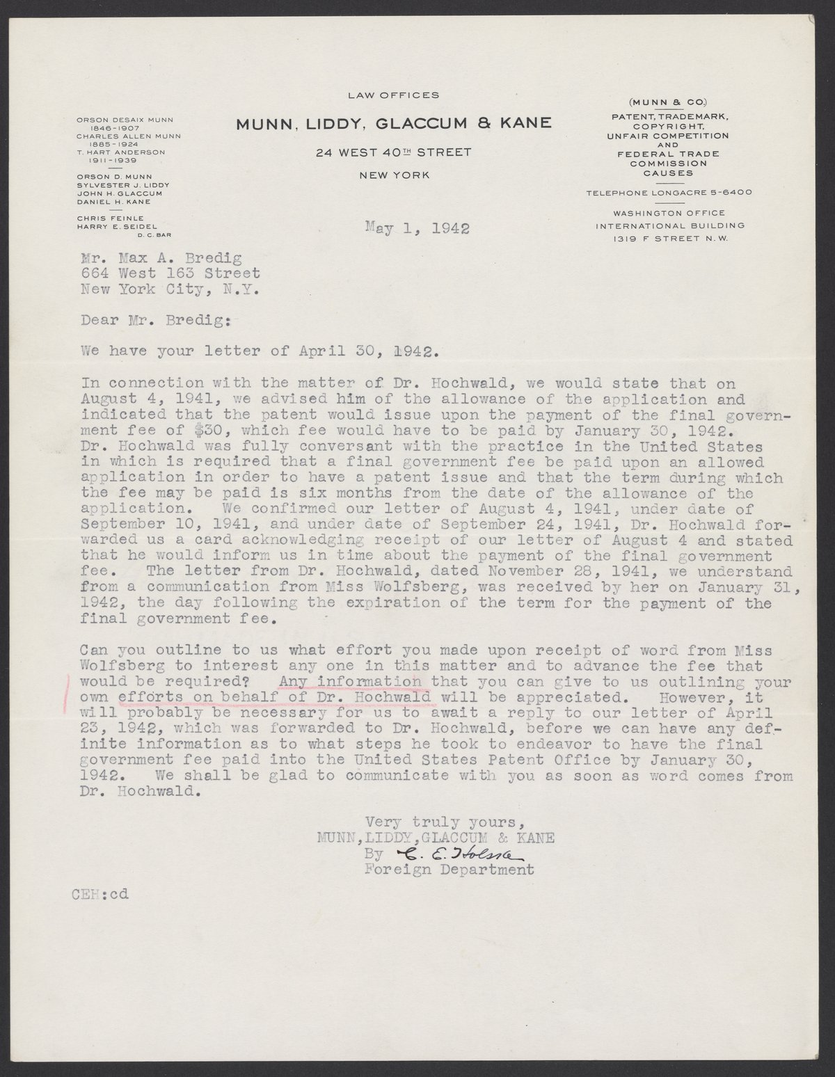 Letter from Clarence E. Holske to Max Bredig, May 1, 1942