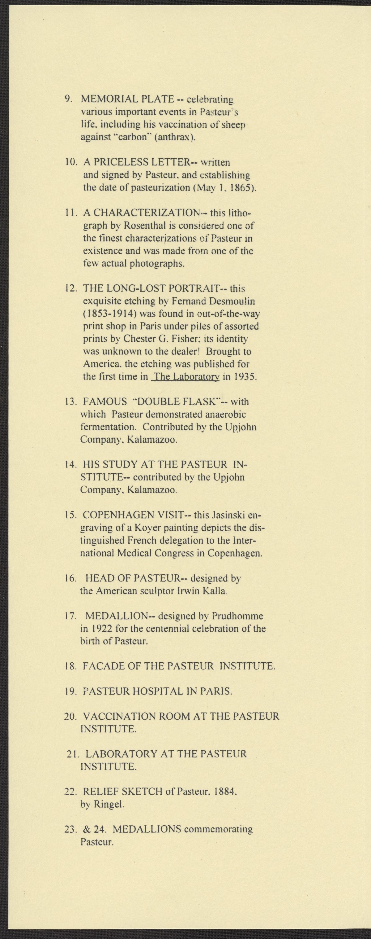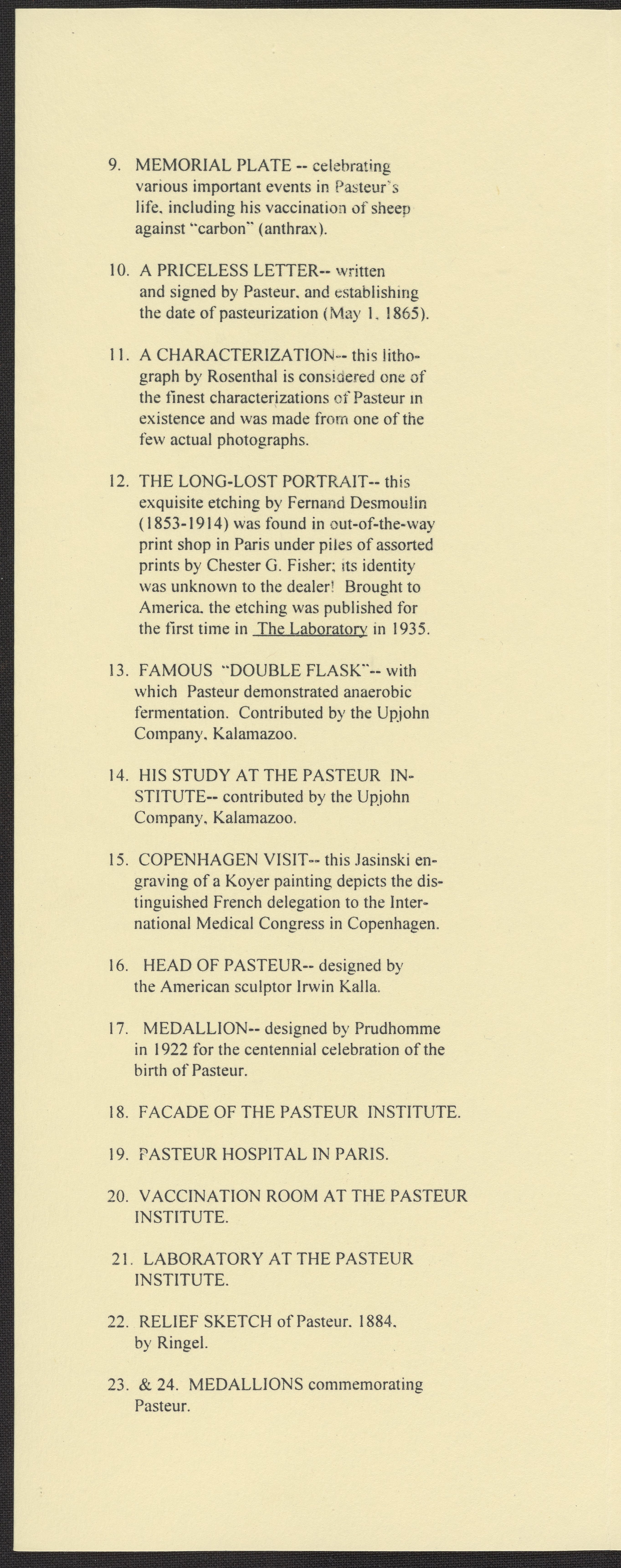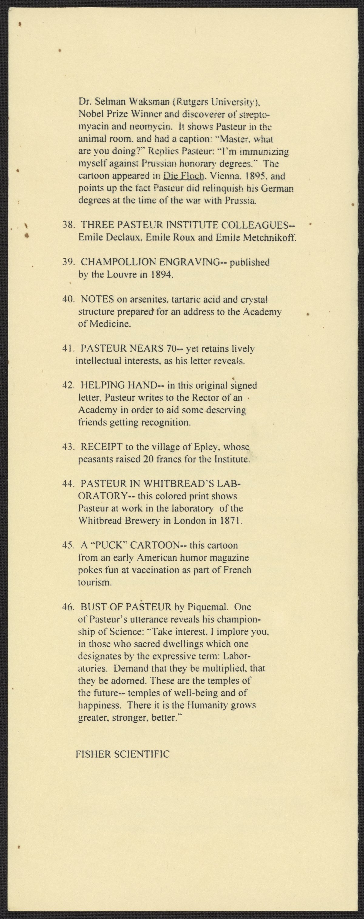 Small JPG1200 x 3031px — 549 KBFull-sized JPG2726 x 6886px — 2.6 MBOriginal fileTIFF — 2726 x 6886px — 53.7 MBCatalog for an exhibition of materials related to Louis Pasteur (1822-1895) believed to have been exhibited at the Fisher Scientific Company. Several entries have been digitized and can be found within the Fisher Pasteur Memorial Collection.