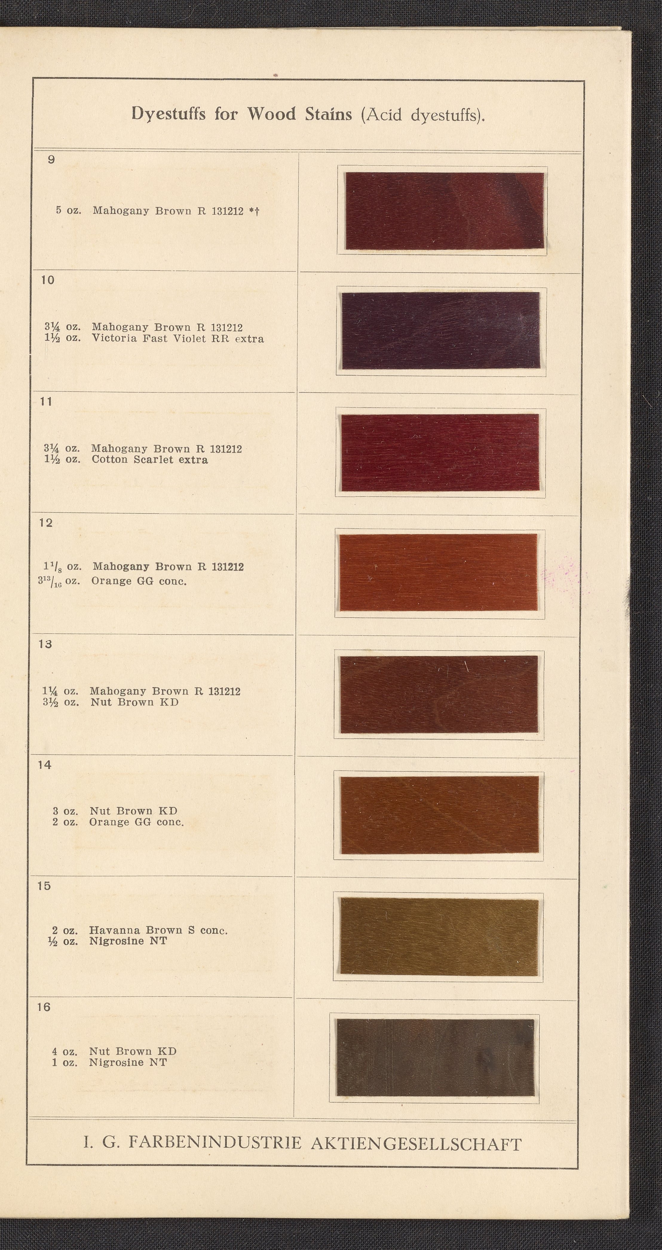 Small JPG1200 x 1992px — 868 KBFull-sized JPG2545 x 4225px — 3.2 MBOriginal fileTIFF — 2545 x 4225px — 30.8 MBSample book for dyeing solutions on wood from the Interessengemeinschaft Farbenindustrie Aktiengesellschaft, a German chemical and pharmaceutical conglomerate. Contains dyeing instructions and sixty-four mounted wood samples on accordion-folded pages. Digital content includes all pages and a representative image of the full foldout.