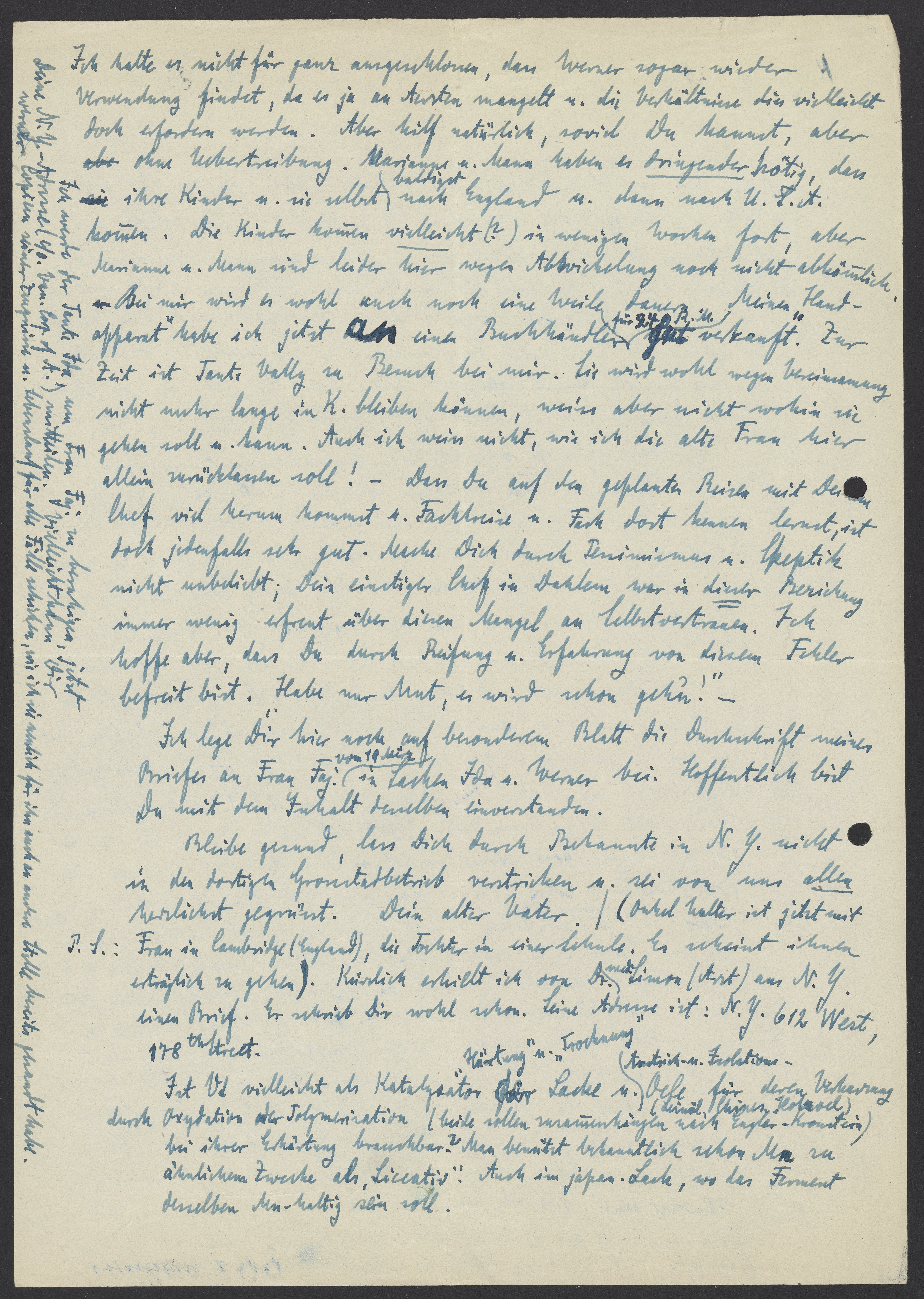 Bleibe gesund, lass Dich durch Bekannte in N.Y. nicht in den dortigen Grosstadtbetrieb verstrichen u. sei von uns allen herzlich gegrüsst. Dein alter Vater. /