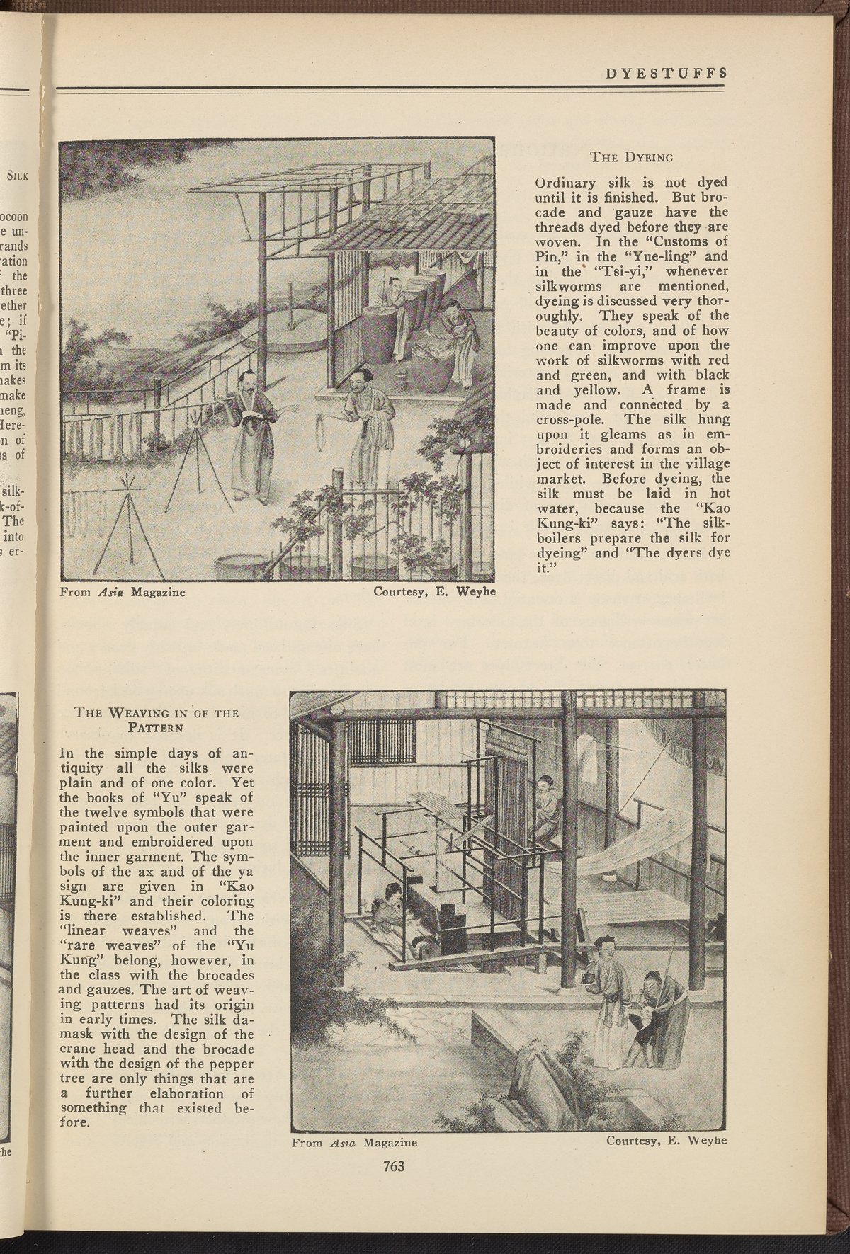 The journal contains reprints of select articles from periodicals in the dyeing and textile fields. This issue focuses on silk dying. Contains articles such as An Old Chinese Story of the Origin of Silk from The American Magazine on the Orient; "National" Dyes for the Silk Trade by Louis J. Matos; Dyeing Artificial Silk from The Textile Recorder; Buffalo Dye Plant Endeavors to Set High Standards of Production by M. D. C. Crawford from The Daily News Record; and Waterproofing Artificial Silk from Textiles. This issue includes black and white printed illustrations. Digitized content does not include the final page of the issue due the fragility of the physical work.