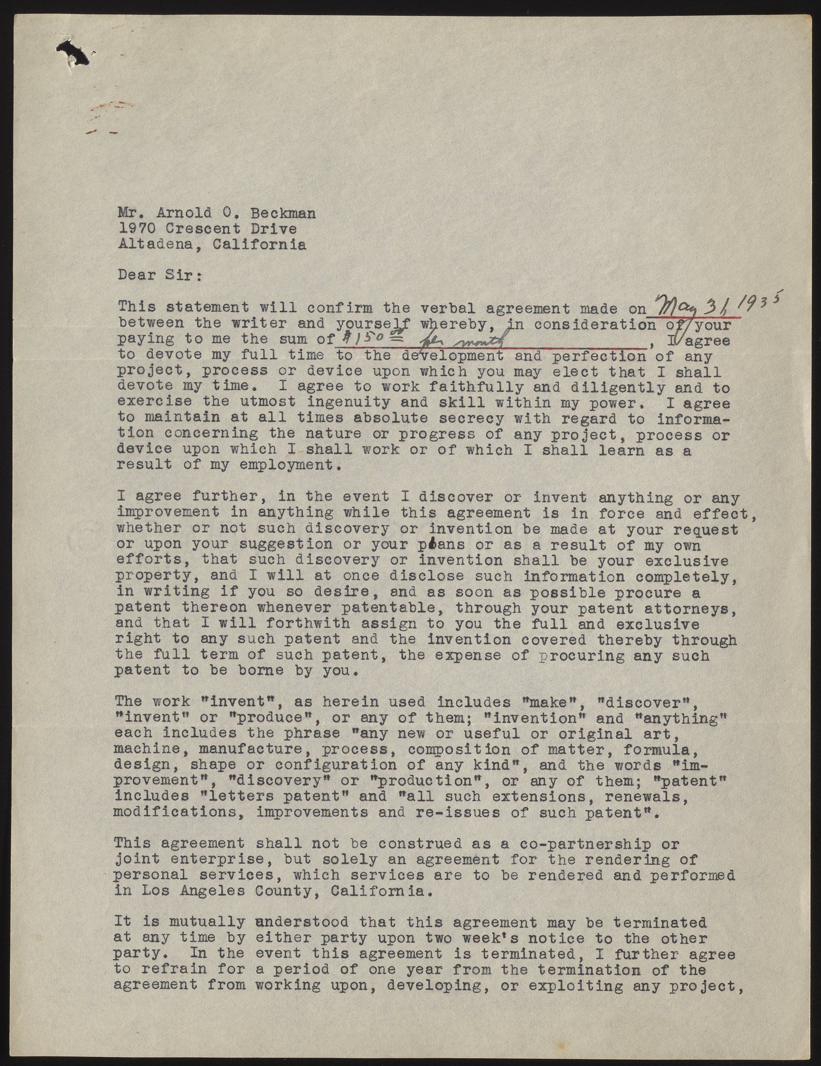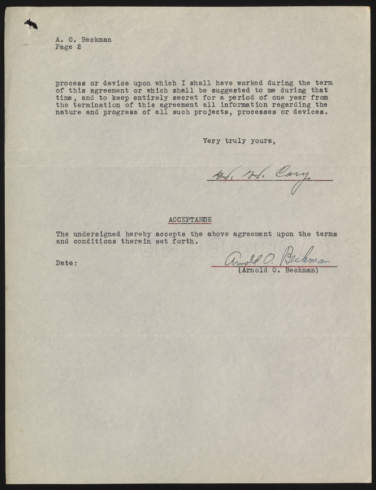 Small JPG1200 x 1558px — 419 KBFull-sized JPG2634 x 3419px — 1.7 MBOriginal fileTIFF — 2634 x 3419px — 25.8 MBThe contract outlines details (including salary, confidentiality, and intellectual property rights) of Howard Cary's work for Arnold Beckman.