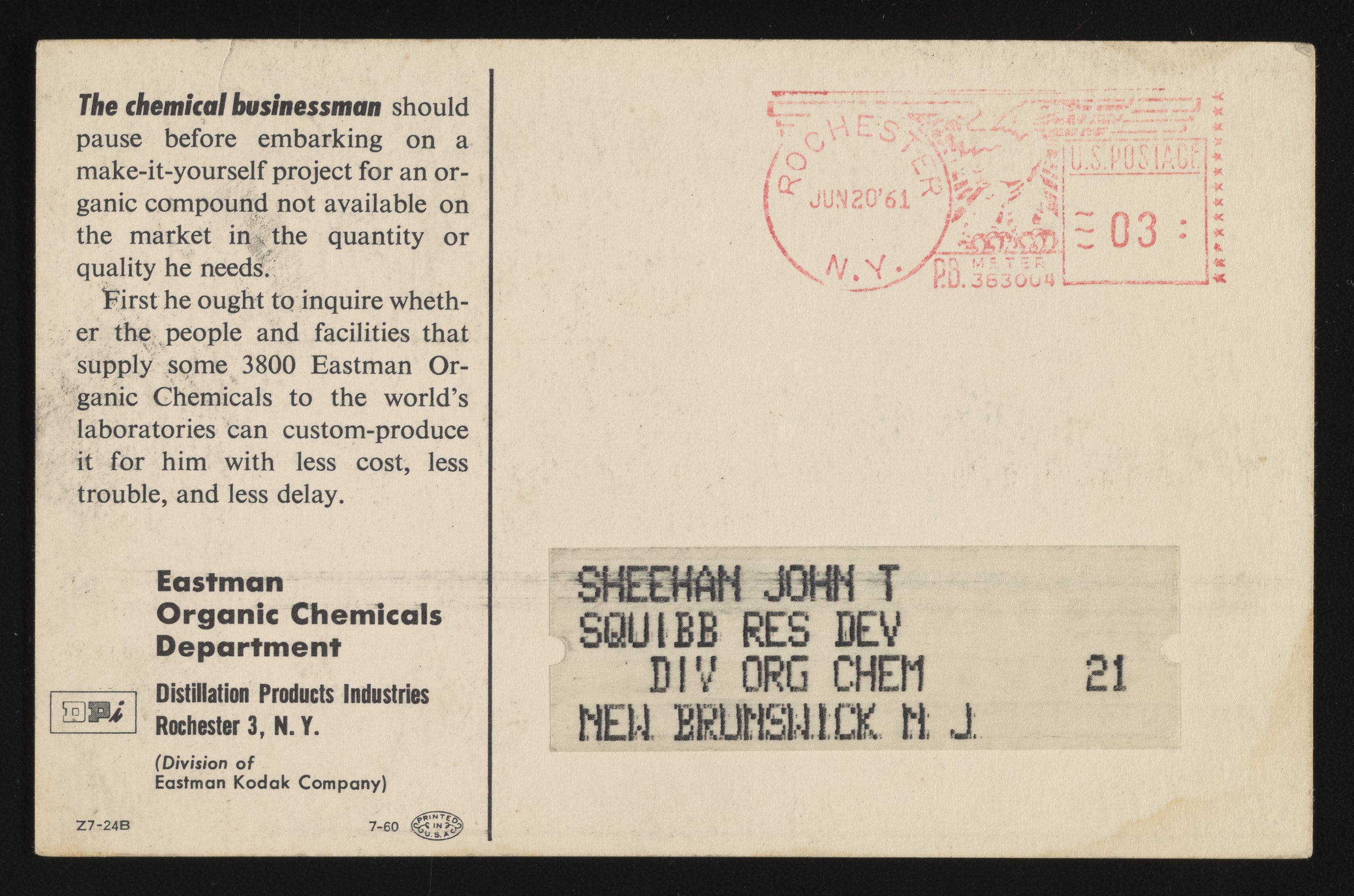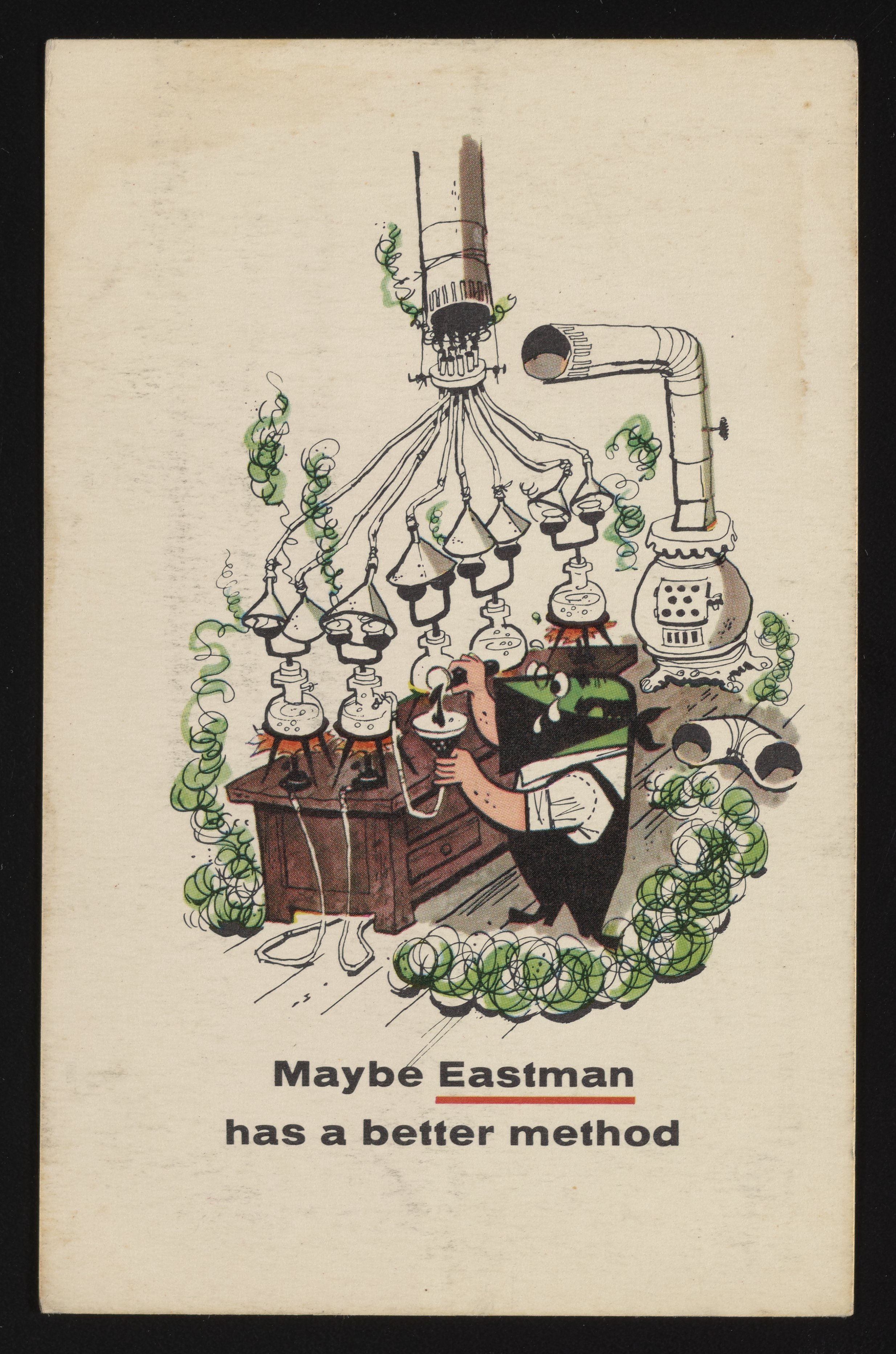 Front and back of an illustrated color postcard advertising the products and services of the Eastman Organic Chemicals Department (Division of the Eastman Kodak Company). The postcard features a humorous depiction of a man surrounded by green smoke while attempting to brew his own chemicals. Postmarked from Rochester, New York, the postcard also includes a brief summary of Eastman’s available stock of chemical compounds as they pertain to the “chemical businessman.”