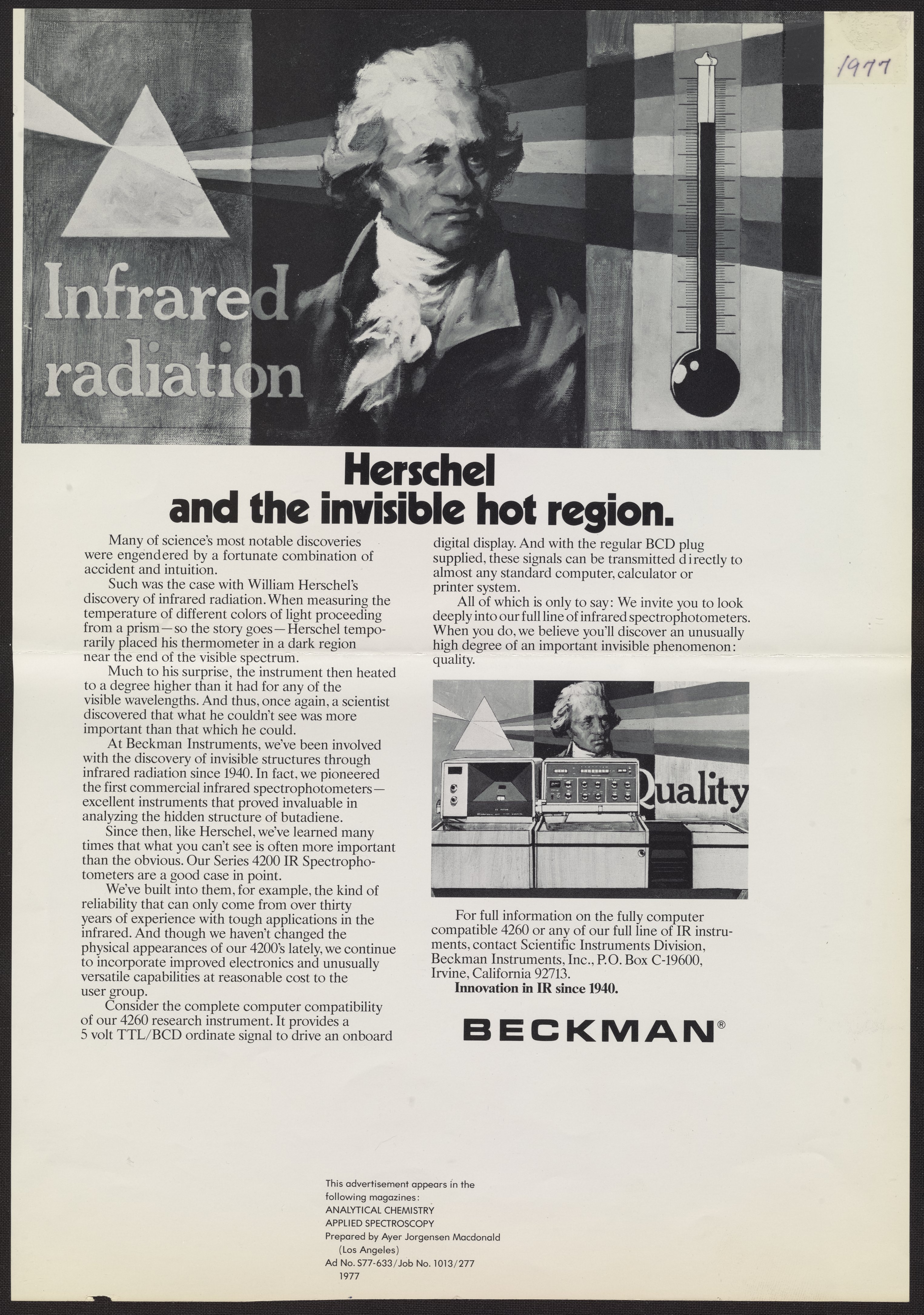 This advertisement for the series 4200 IR Spectrophotometer connects the work that Beckman Instruments is doing to the work of William Herschel, the British astronomer who discovered infrared radiation in 1800.