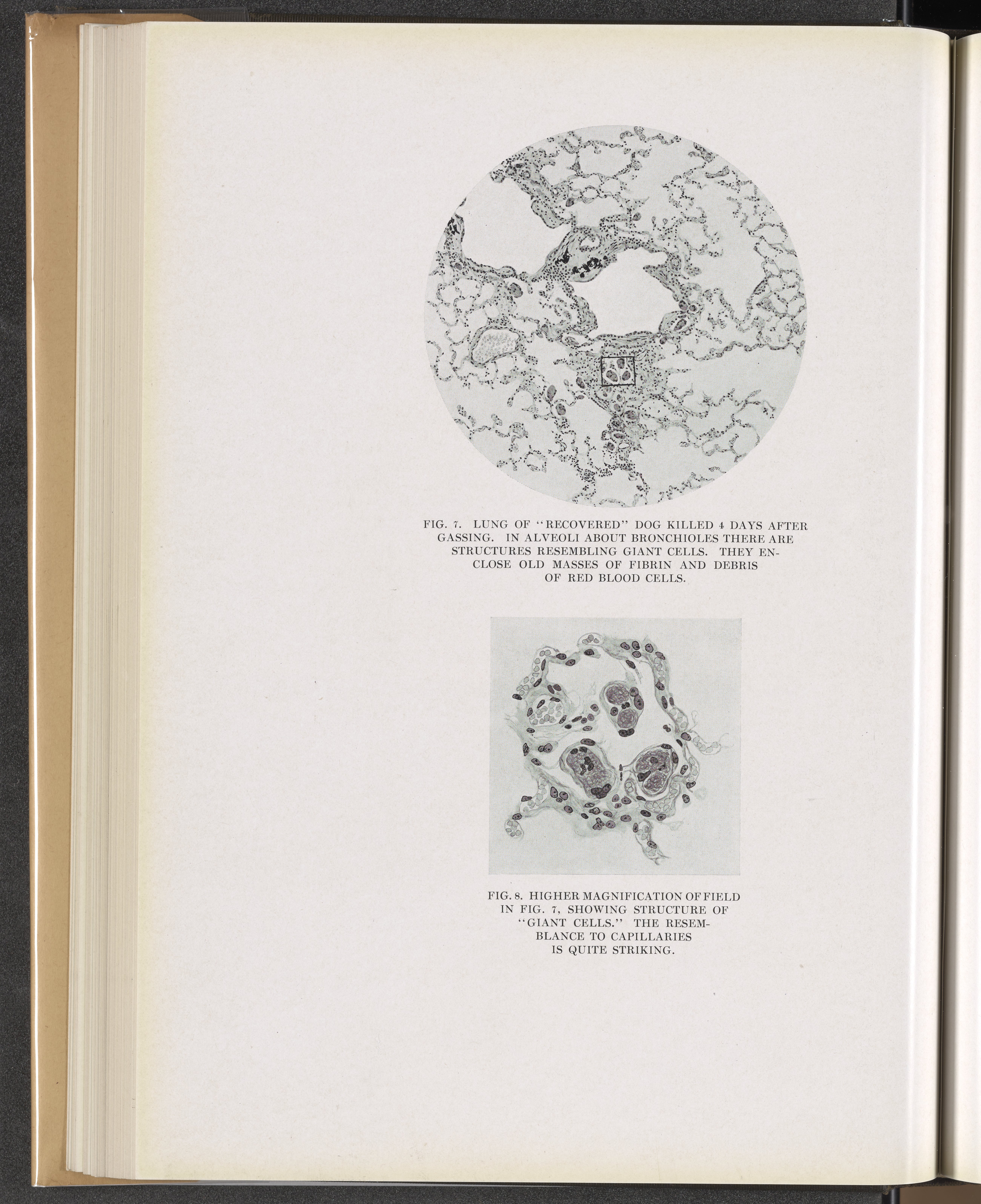 Winternitz, M. C. (Milton C.). “Fig. 7: Lung of ‘Recovered’ Dog Killed 4 Days after Gassing. Fig. 8: Higher Magnification of Field in Fig. 7, Showing Structure of ‘Giant Cells.".” Collected Studies on the Pathology of War Gas Poisoning. New Haven, Connecticut: Yale University Press, 1920. https://digital.sciencehistory.org/works/fq977t95h.