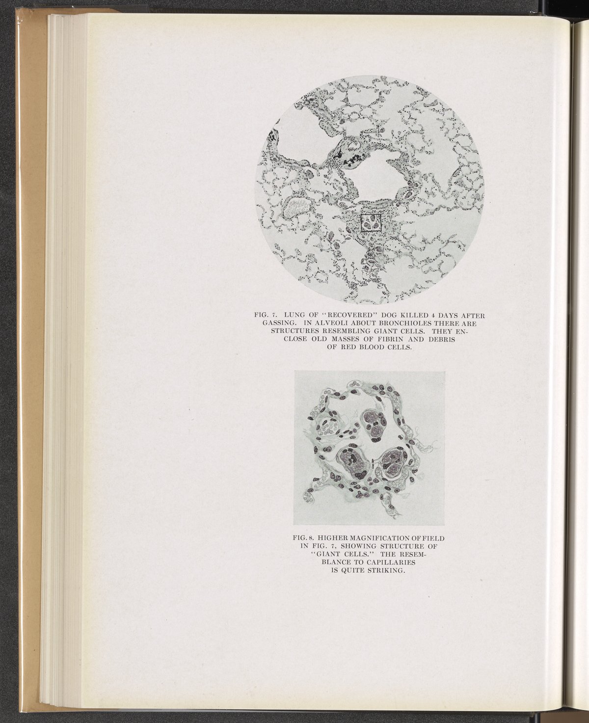 Fig. 7: Lung of "recovered" dog killed 4 days after gassing. Fig. 8: Higher magnification of field in Fig. 7, showing structure of "giant cells."
