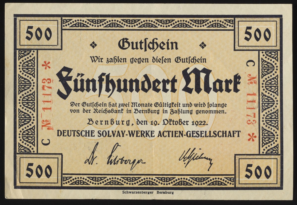 Small JPG1200 x 829px — 303 KBLarge JPG2880 x 1991px — 1.5 MBFull-sized JPG3908 x 2701px — 2.4 MBOriginal fileTIFF — 3908 x 2701px — 30.3 MBThis Fünfhundert Mark Gutschein, or five hundred Mark voucher, was issued by Deutsche Solvay-Werke Actien-Gesellschaft. Styled after a banknote, this company scrip includes the company seal and a Bezahlt, or paid, cancellation stamp on the verso. Paper features a watermark design.