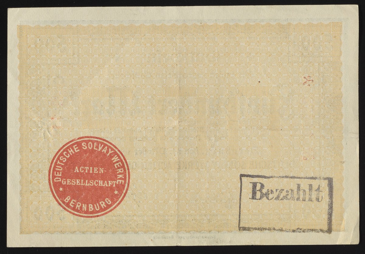 “Deutsche Solvay-Werke Actien-Gesellschaft Fünfhundert Mark Gutschein.” Bernburg, Germany: Schwarzenberger, October 19, 1922. Robert J. Bauman collection. Science History Institute. Philadelphia. https://digital.sciencehistory.org/works/fq977v63f.