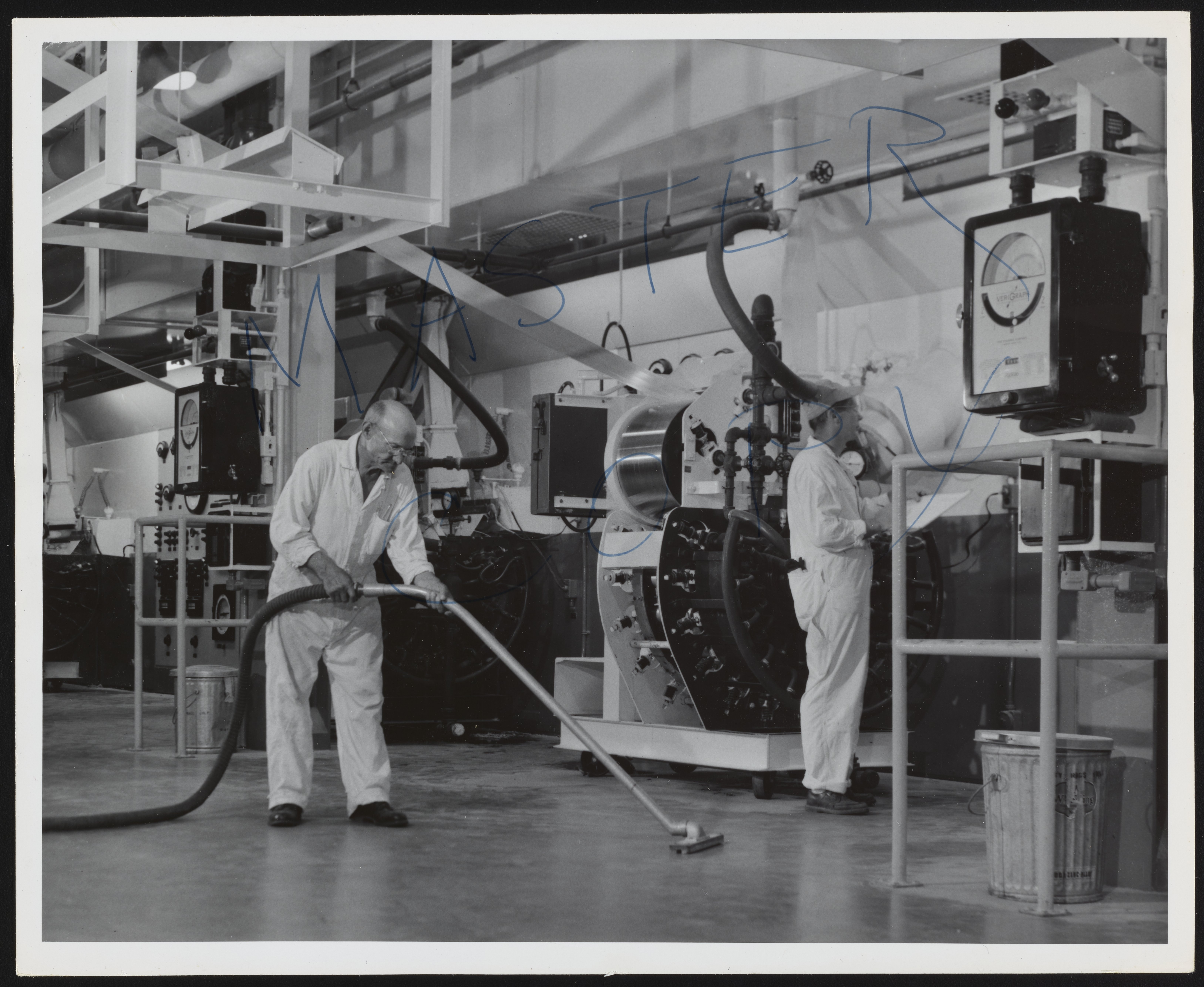 General view of unidentified employees at work in the Styron manufacturing facilities at the Dow Chemical Company plant located in Midland, Michigan. A Styron belt (also known as a ribbon) is visible being extruded from a machine at center. Styron is the trade name for Styrenic plastics historically manufactured and sold by the Dow Chemical Company for a variety of consumer applications, including packaging and food service, appliances, and other plastic wares.