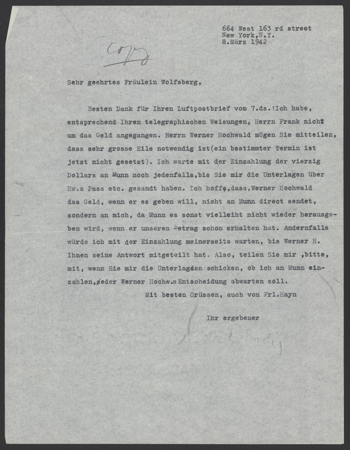 Letter from Max Bredig to Ilse Wolfsberg, March 8, 1942
