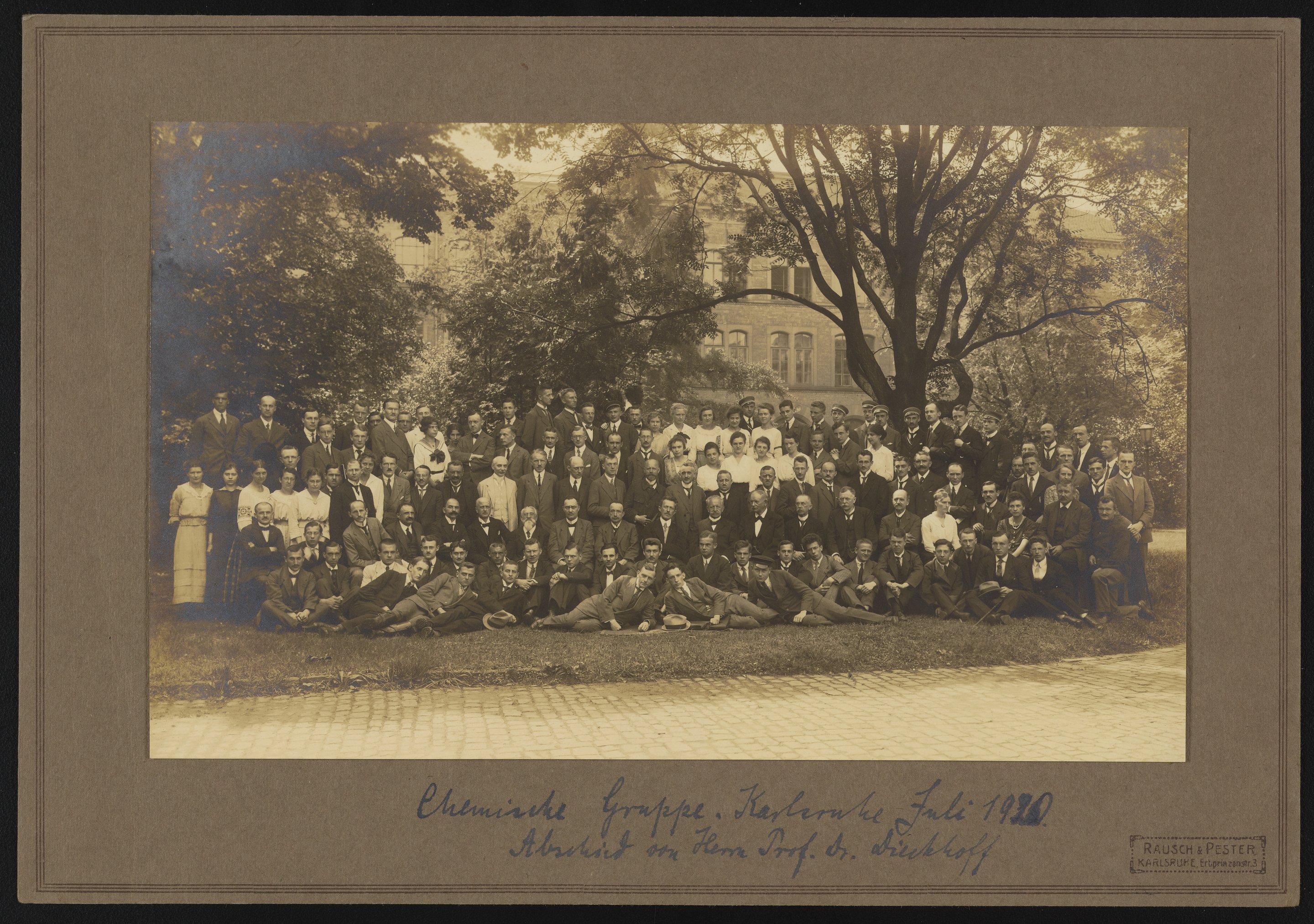 Black and white photograph of a large group identified as the Karlsruhe Chemistry Group, gathered for the occasion of throwing a goodbye party for an Emil Dieckhoff.