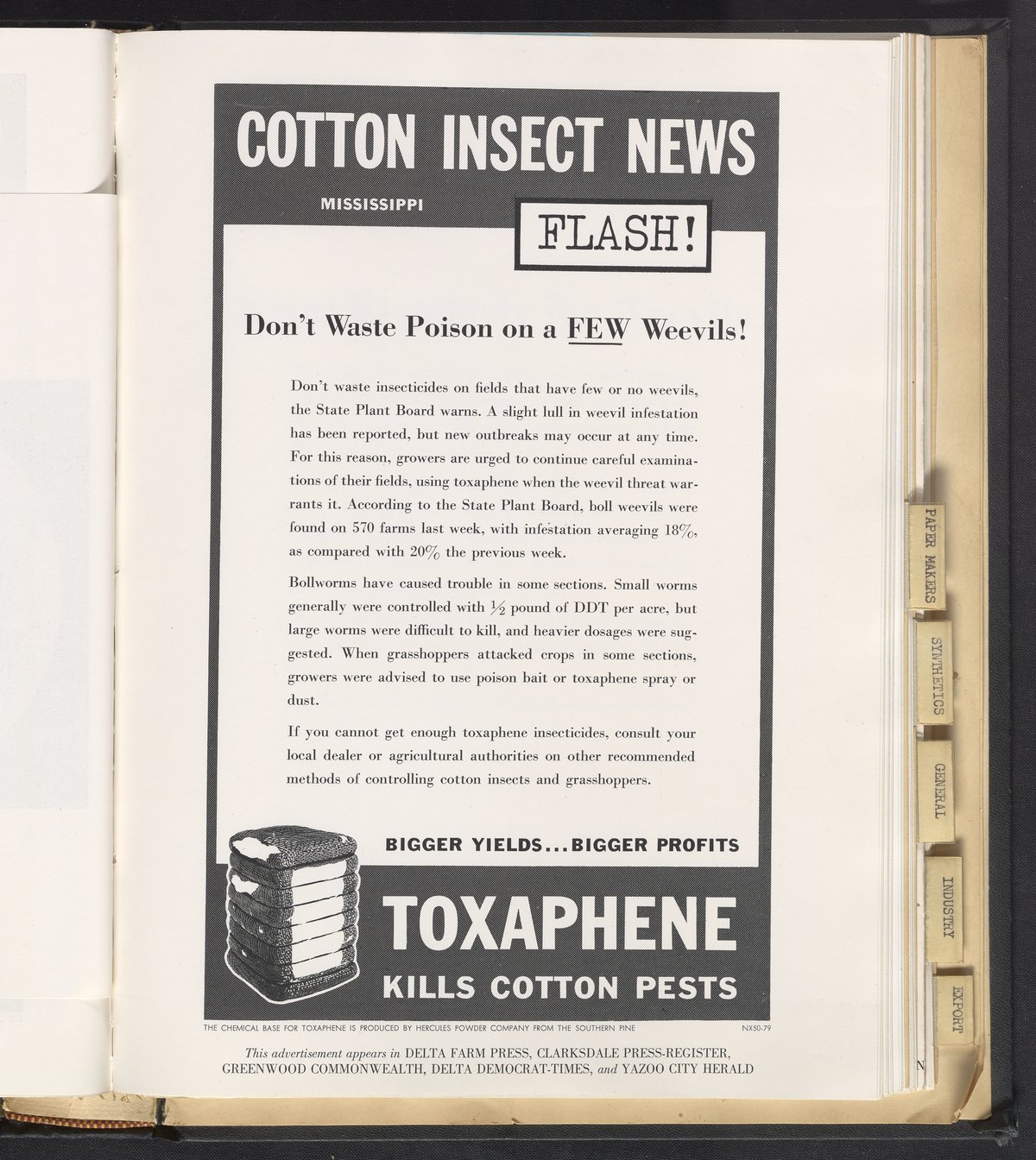 Print advertisement for toxaphene produced by Hercules Powder Company reads "Cotton Insect News Flash! Mississippi" with a bale of cotton alongside the toxaphene tagline that reads "kills cotton pests." Accompanying paragraph discusses the use of toxaphene to combat the year's predicted cotton insect infestations. This advertisement appeared in Delta Farm Press, Clarksdale Press-Register, Greenwood Commonwealth, Delta Democrat-Times, and Yazoo City Herald.