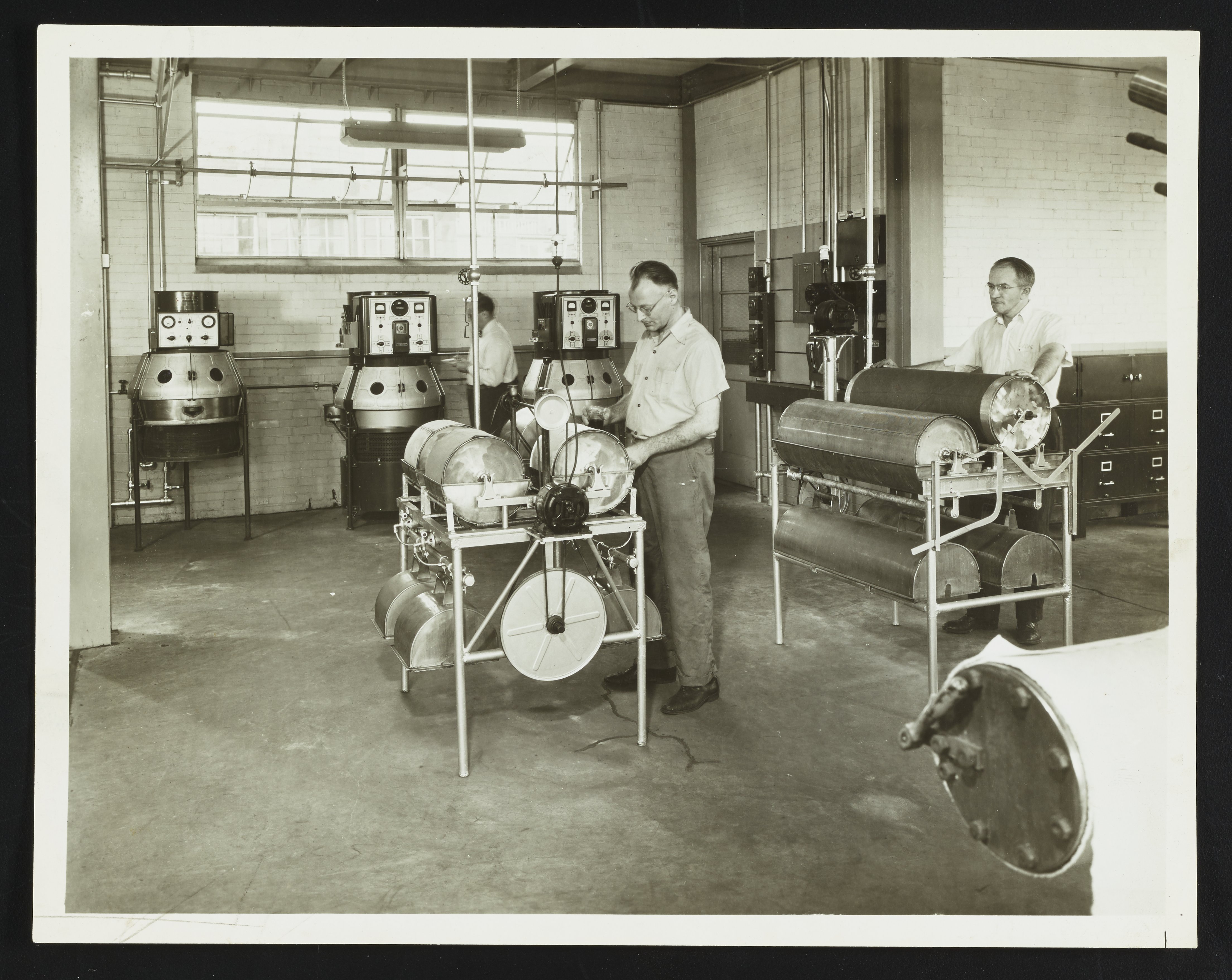 General view of assorted machinery in the Customer Service and Quality Control Laboratory at the Althouse Chemical Company plant in Reading, Pennsylvania. At center, employees Robert Wither (left) and Carroll Dick (right) are seen examining machines used to roll fabric through a trough of dye for the application of dyestuffs. Several Weather-O-Meter and Fade-O-Meter machines, used to test the durability and light-fastness of dyed fabric, are visible in the background, along with an unidentified employee.