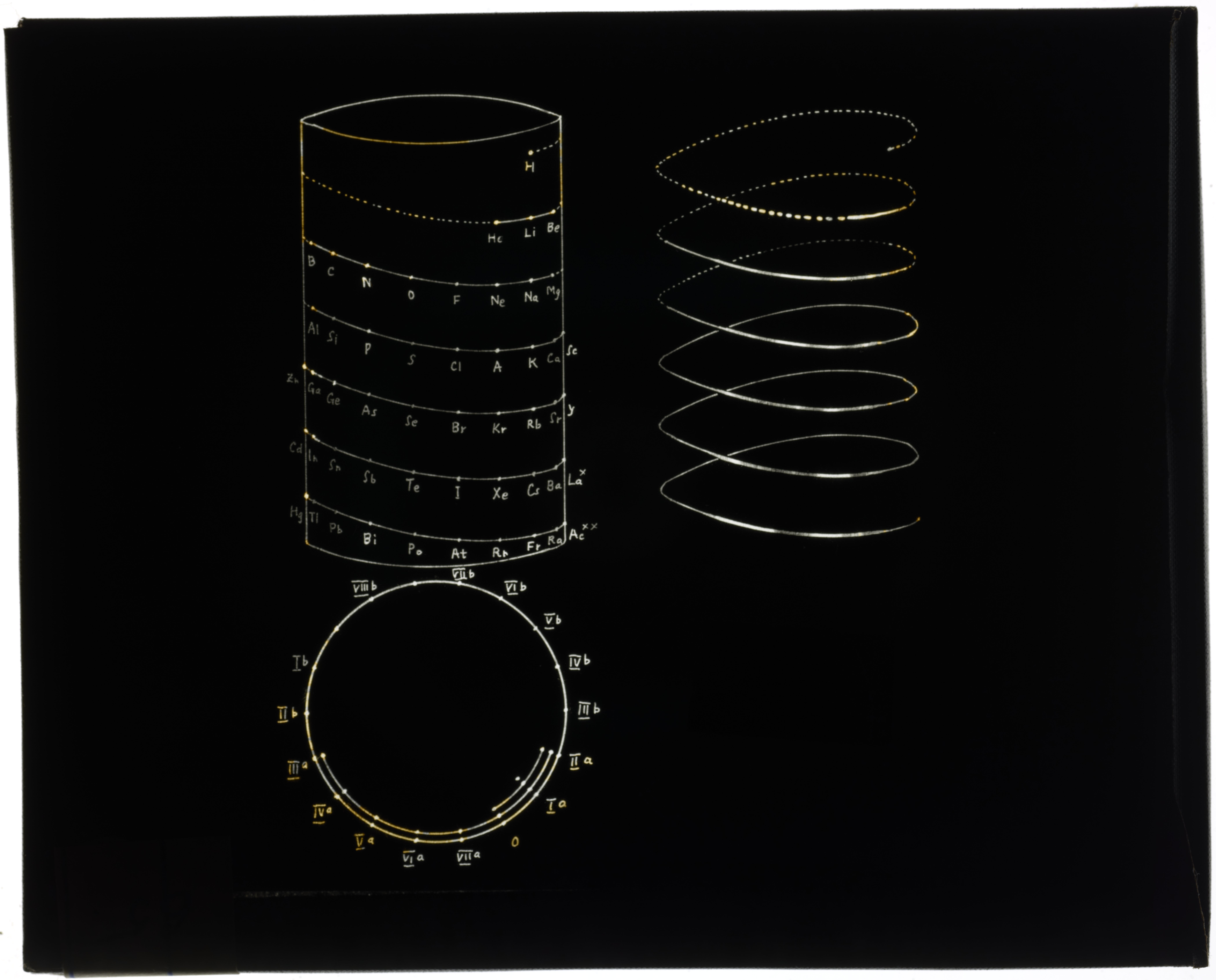 Periodic table in style of helix wound on three main stepwise cylinders1916 (Original design), Circa 1957 (Date attributed to slide)