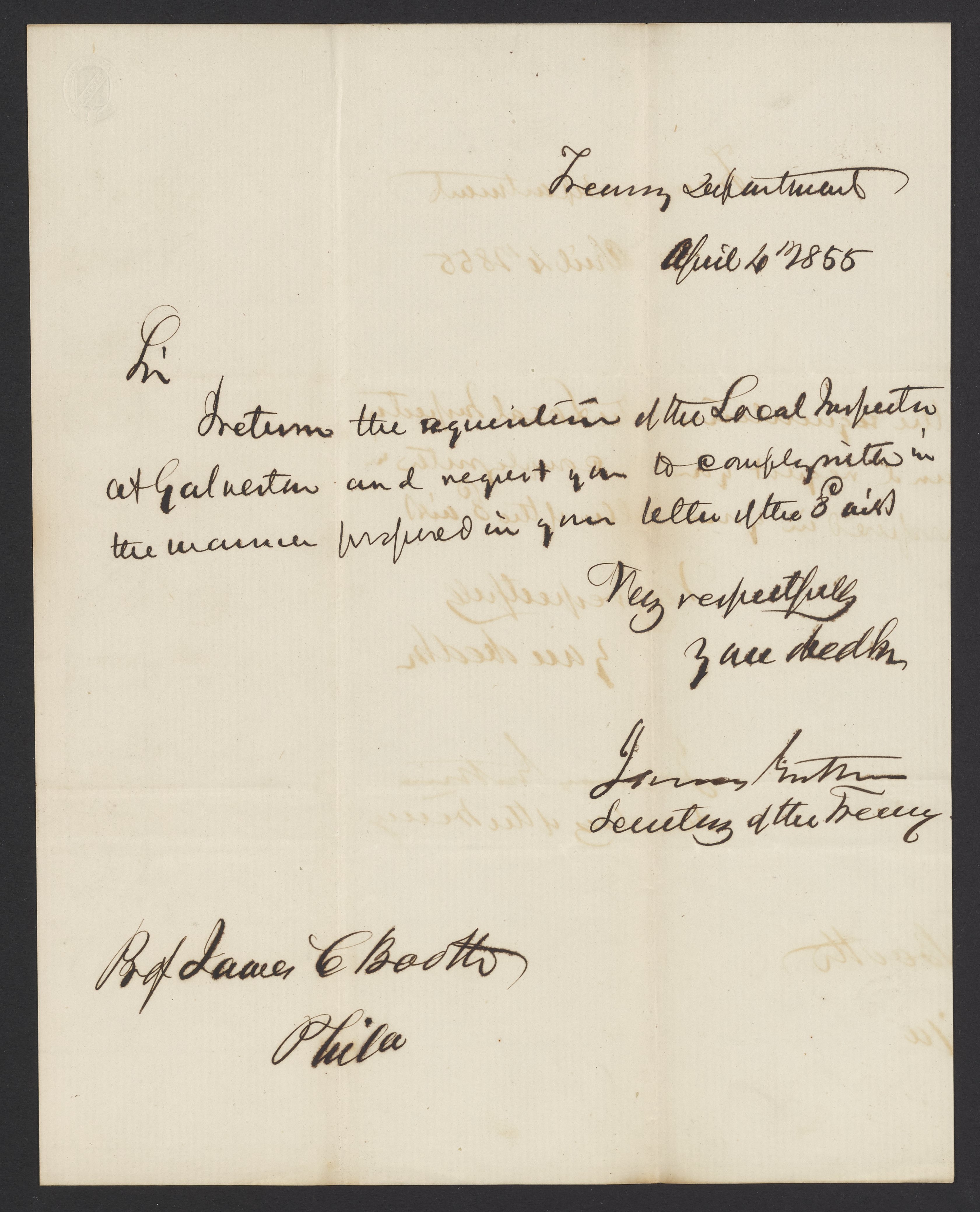 Small JPG1200 x 1483px — 192 KBLarge JPG2880 x 3560px — 1.1 MBFull-sized JPG3361 x 4154px — 1.4 MBOriginal fileTIFF — 3361 x 4154px — 40.0 MBJames B. Guthrie (1792 - 1869), United States Secretary of the Treasury from 1853-1857, writes to James Curtis Booth (1810-1888) concerning requisitions.