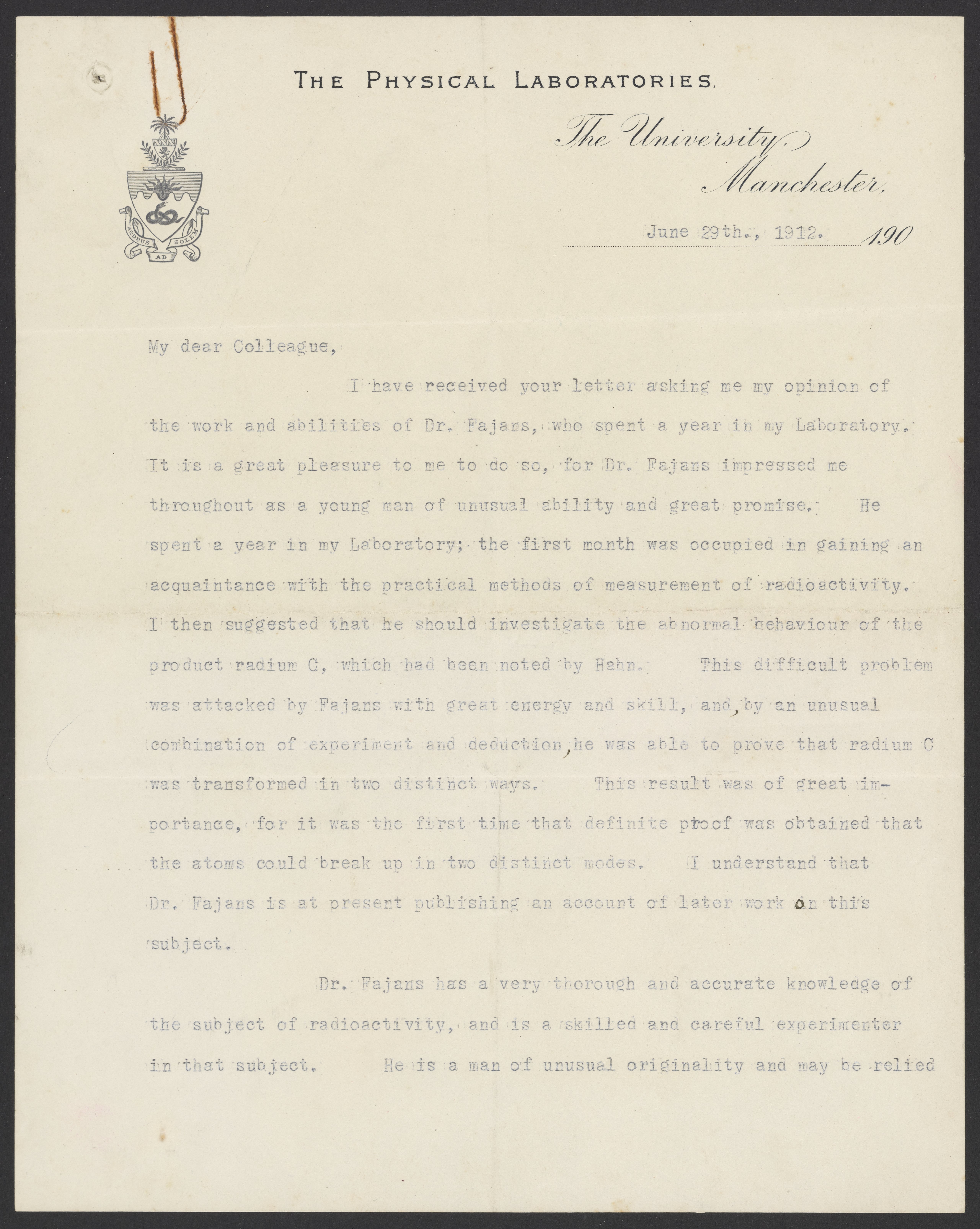 Small JPG1200 x 1504px — 198 KBLarge JPG2880 x 3610px — 1.1 MBFull-sized JPG5122 x 6420px — 3.3 MBOriginal fileTIFF — 5122 x 6420px — 94.1 MBErnest Rutherford (1871-1937) provides Georg Bredig (1868-1944) with a reference for Kasimir Fajans (1887-1975). Rutherford speaks to Fajans' work in his laboratory, his work ethic, and his qualifications to work with Bredig.