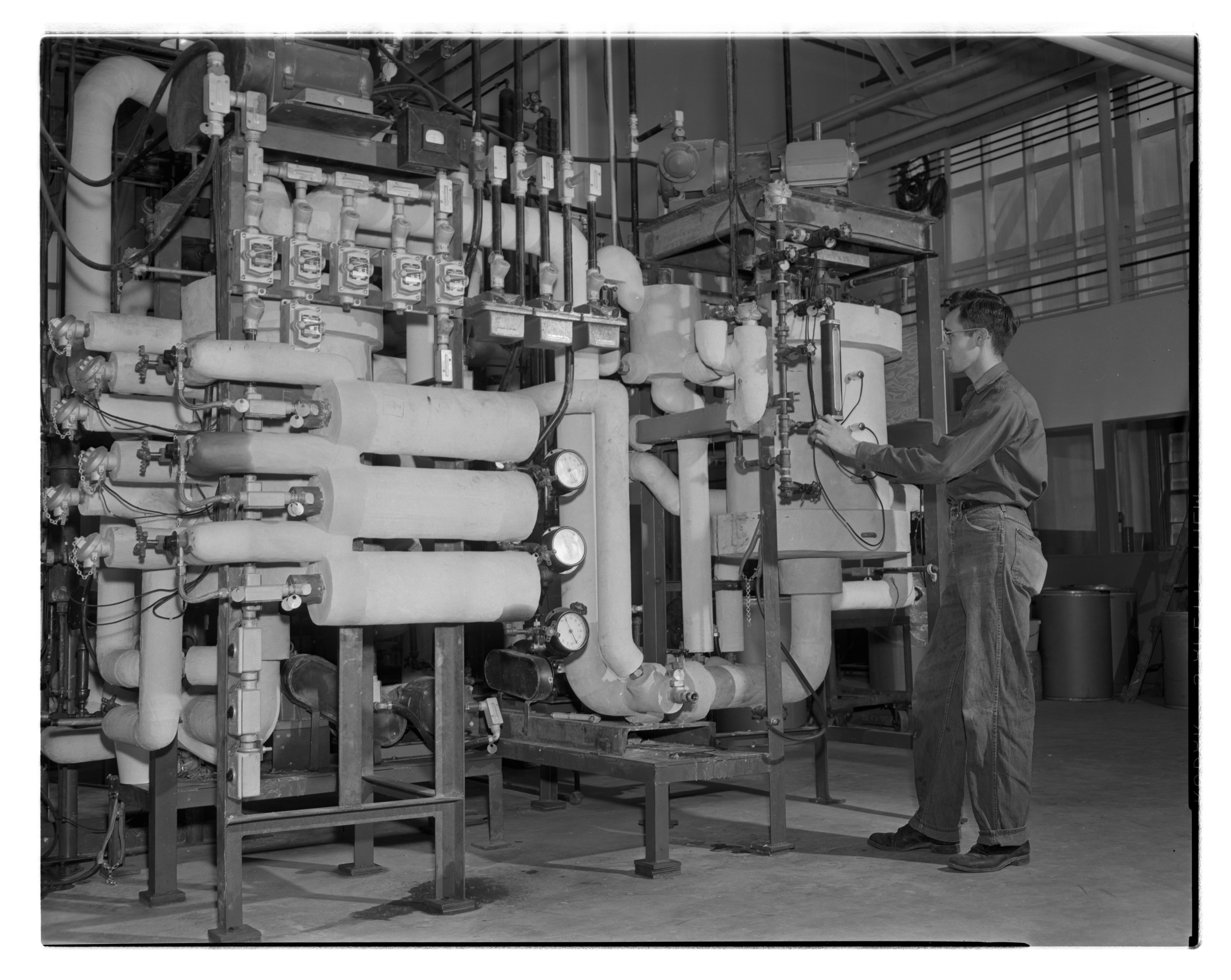 Willard King working with pilot plant apparatus at Dow Plastics Production Laboratory
