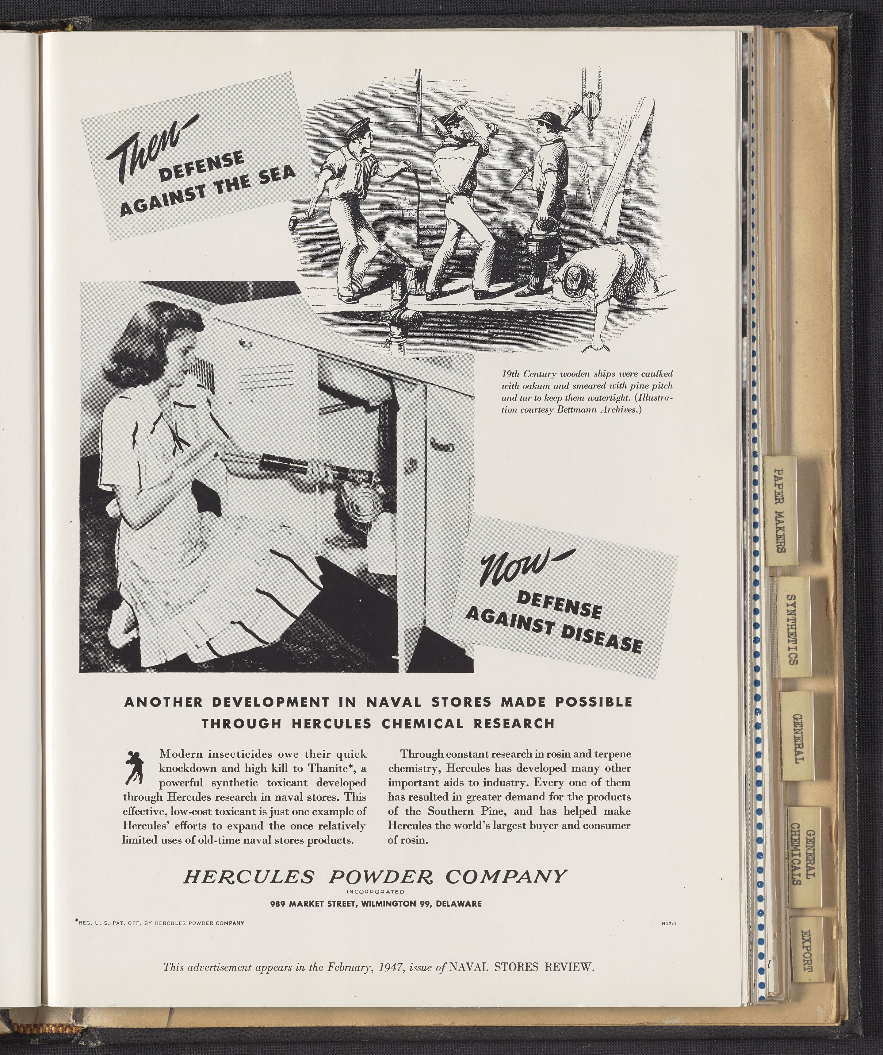 Hercules Incorporated. “Then, Defense Against the Sea...Now, Defense Against Disease.” 1947 Hercules Advertisements, 1947. Records of Hercules Incorporated, Volume 1947. Science History Institute. Philadelphia. https://digital.sciencehistory.org/works/g158bj02r.
