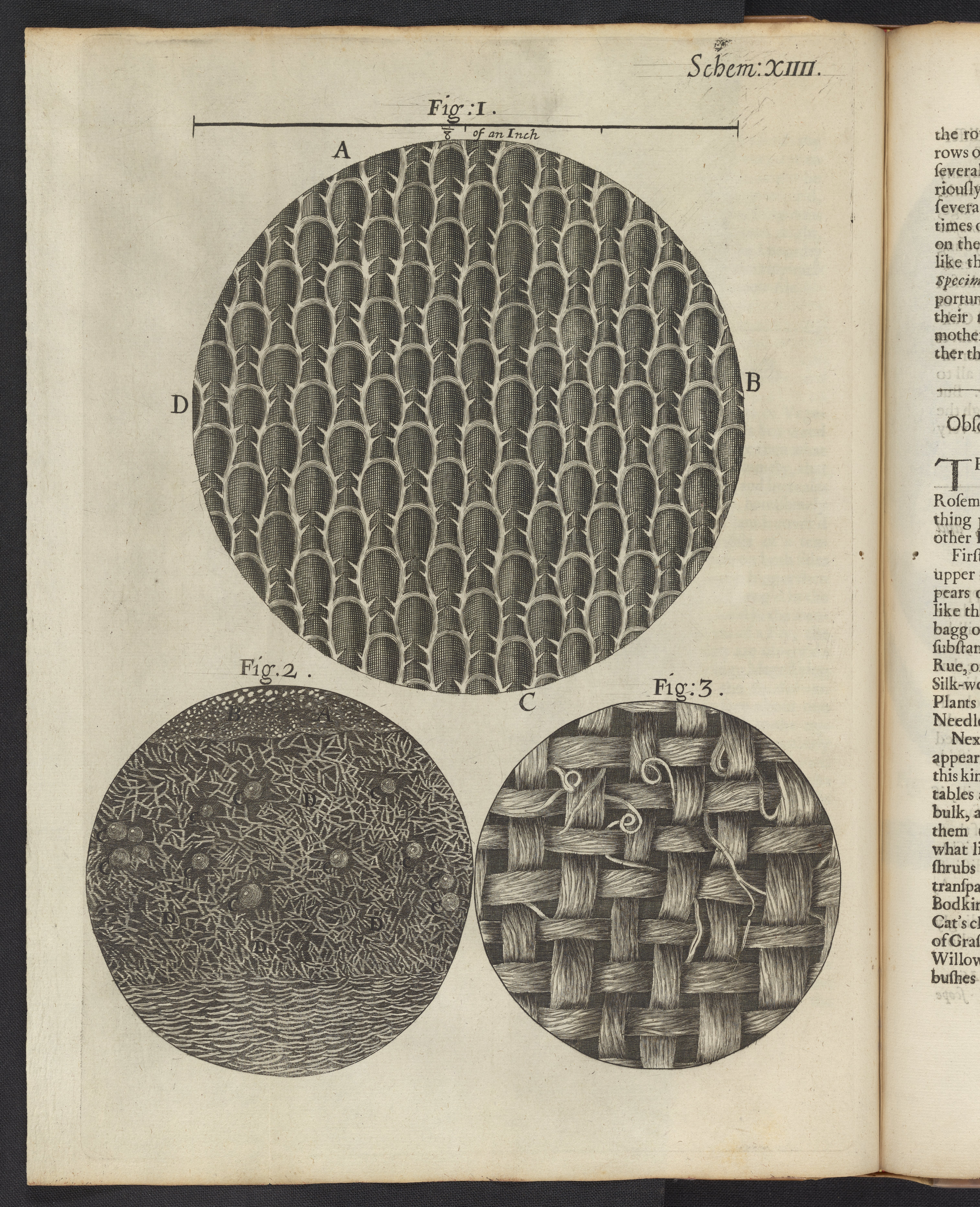 Hooke, Robert. “Microscopic View of Seaweed, Rosemary, and Other Leaves.” In Micrographia : or, Some Physiological Descriptions of Minute Bodies Made by Magnifying Glasses. With Observations and Inquiries Thereupon. London, England: J. Allestry, 1665. https://digital.sciencehistory.org/works/g158bj384.