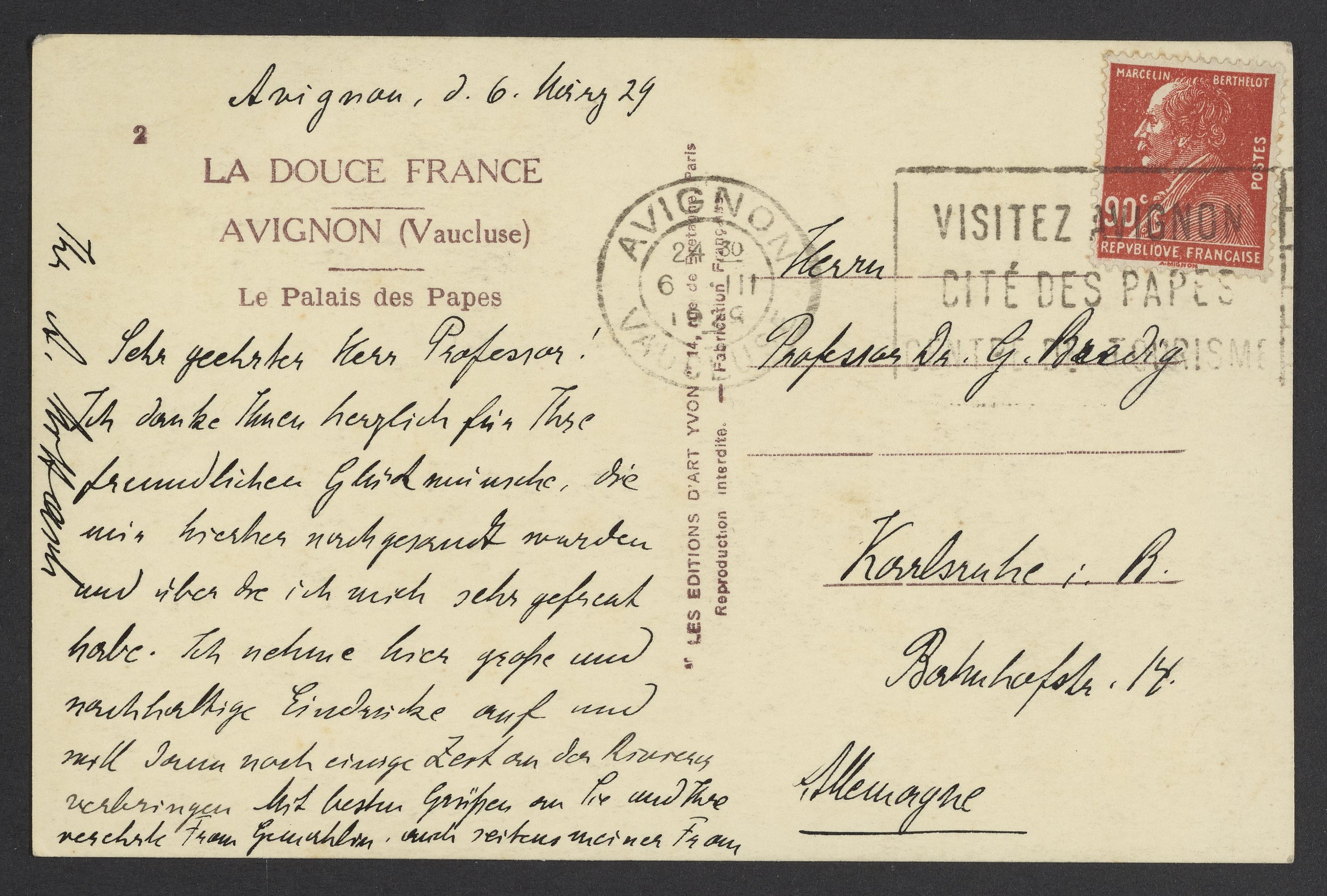 Postcard from Alwin Mittasch to Georg Bredig, 1929