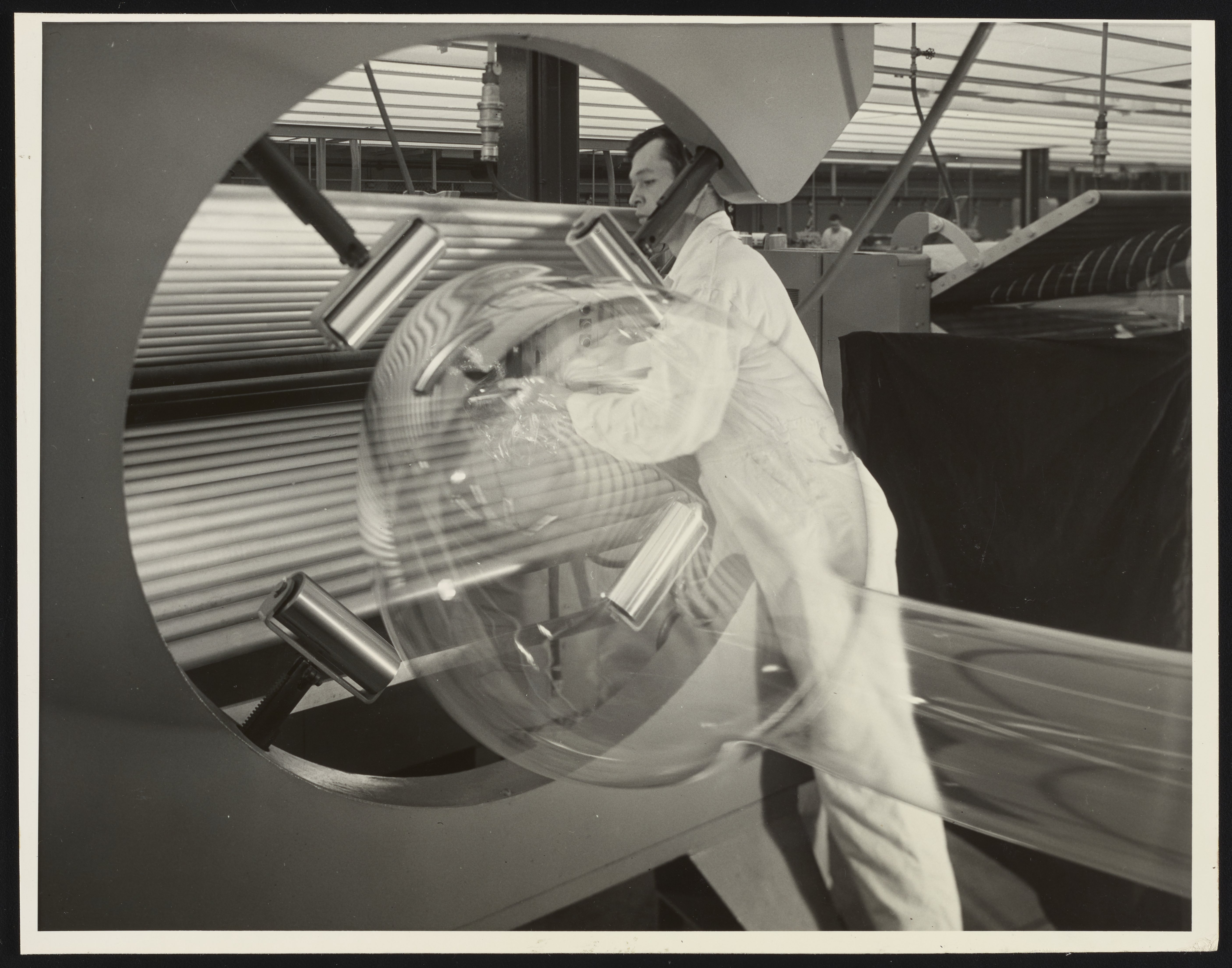 General view of an unidentified employee handling a saran bubble as it is extruded from a machine during the production of saran film at the Dow Chemical Company plant in Midland, Michigan. During production, the film passed through a series of rollers, which deflated the bubbles and prepared the film for winding on rolls. Initially developed for the U.S. Army to wrap arms and equipment for transport during World War II, saran plastic was subsequently developed and marketed as Saran Wrap for household use.