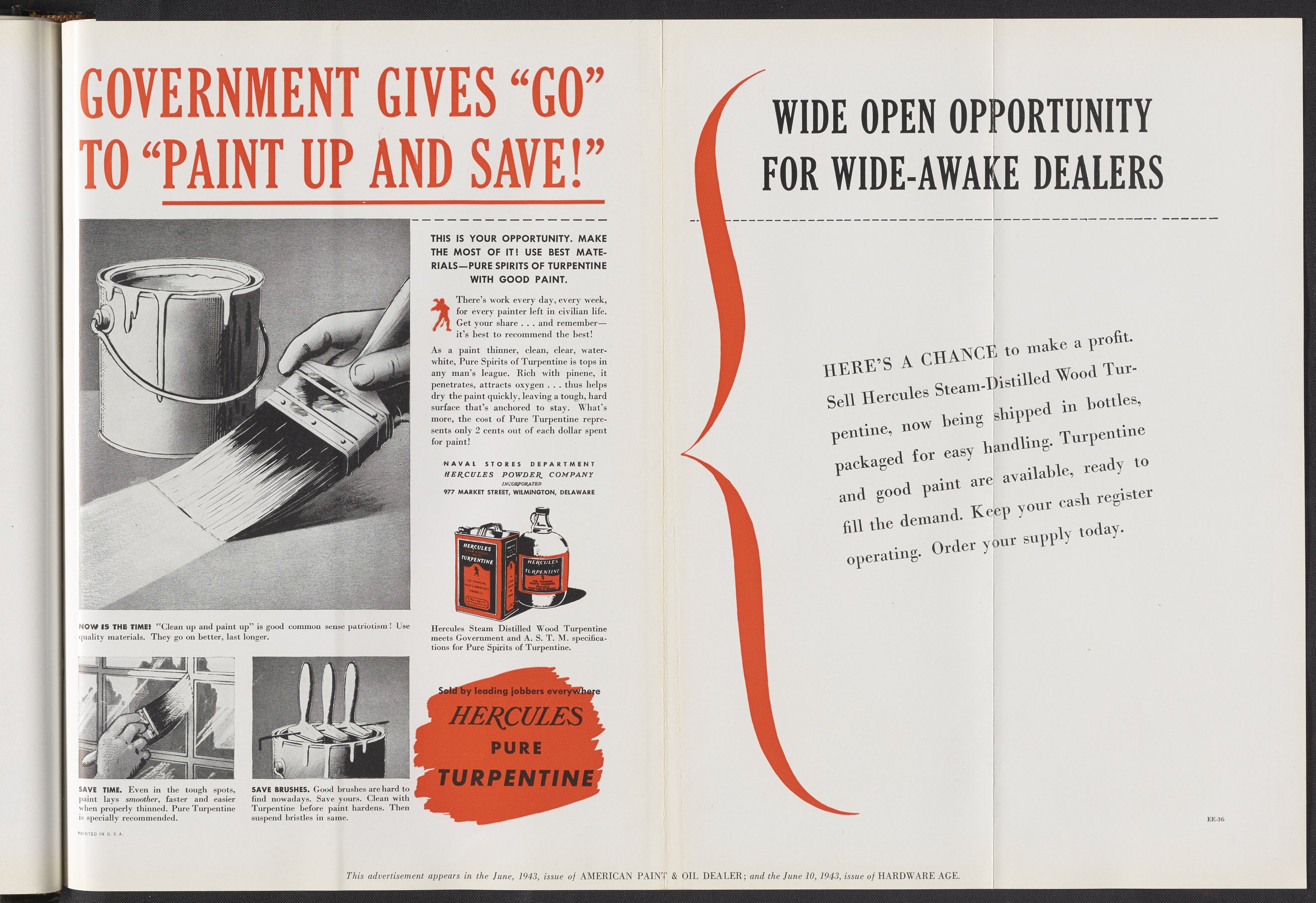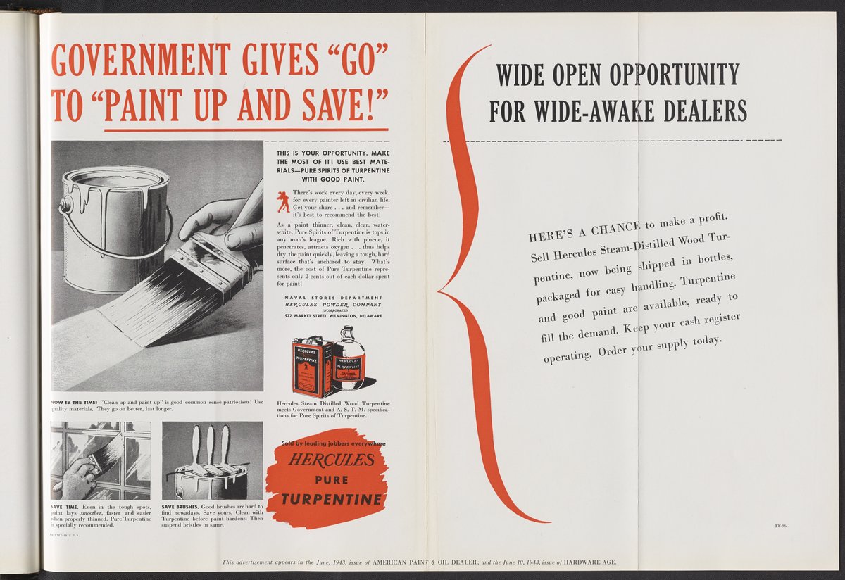 Hercules Incorporated. “Government Gives ‘Go’ to ‘Paint Up and Save!".” 1943 Hercules Advertisements, 1943. Records of Hercules Incorporated, Volume 1943. Science History Institute. Philadelphia. https://digital.sciencehistory.org/works/g445cd88c.