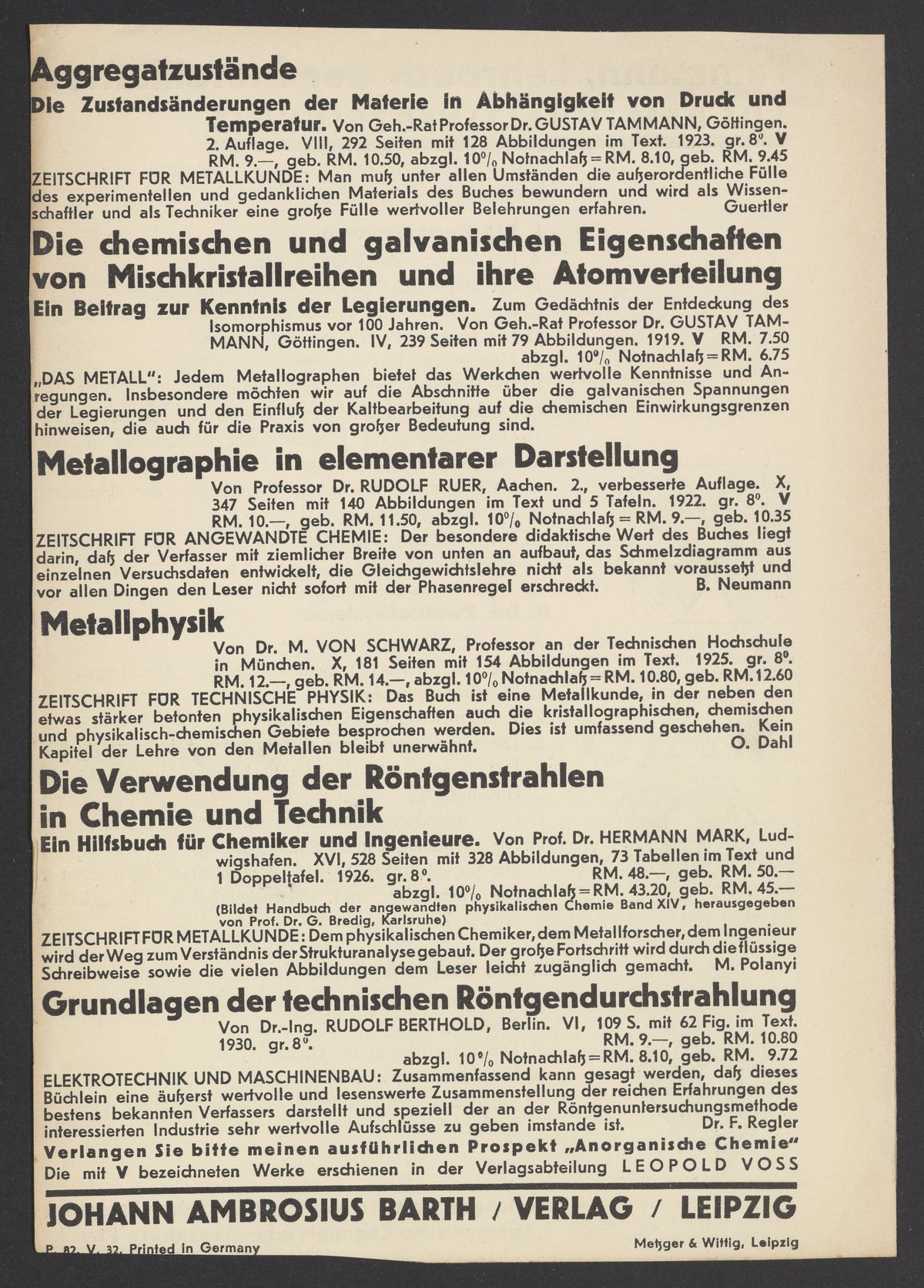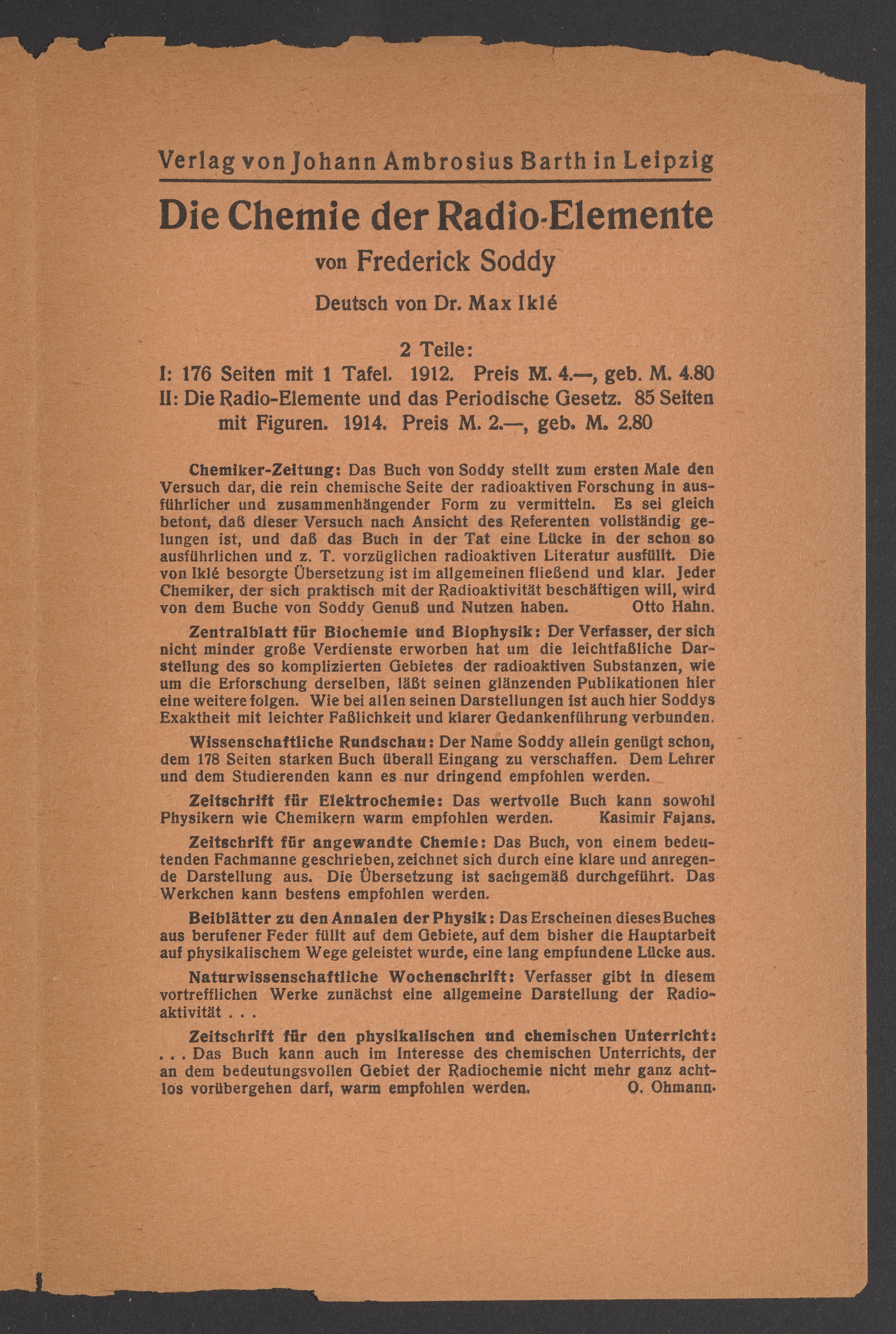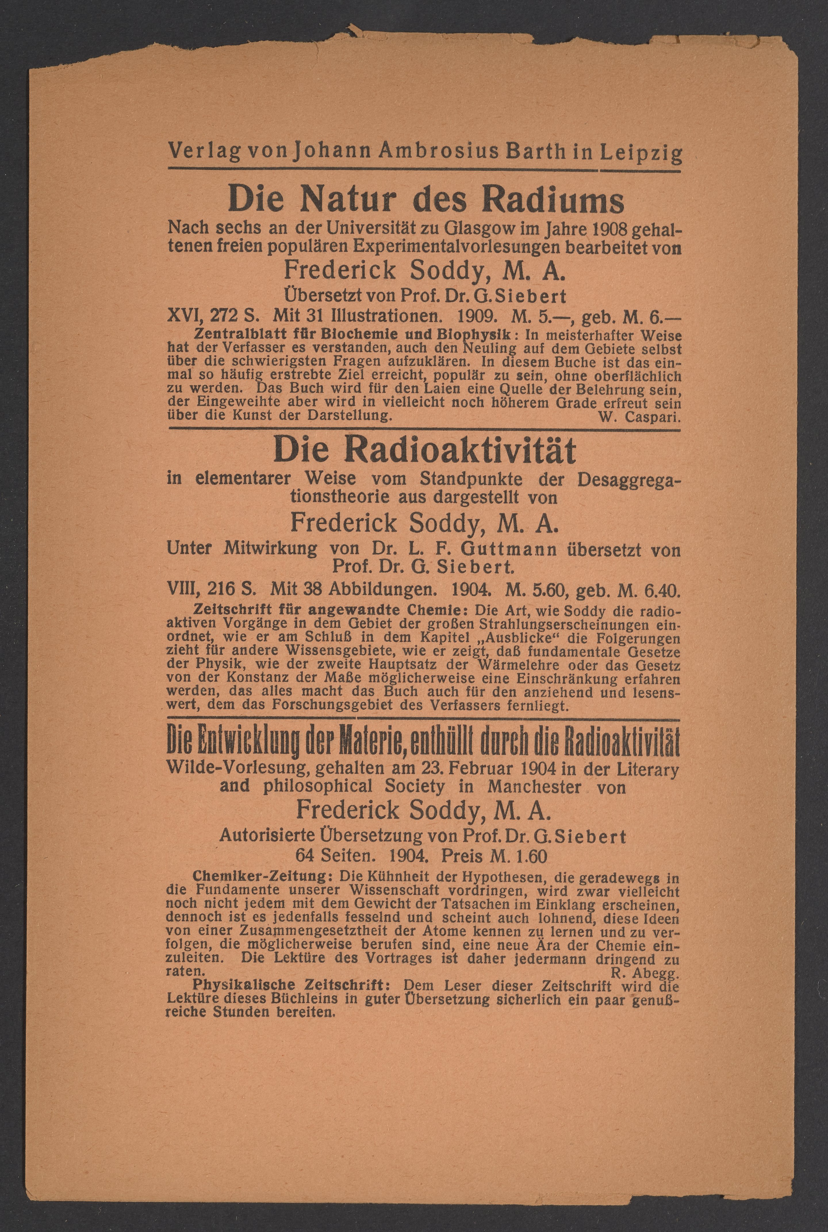 Titles listed in the advertisments include Kurzes Handbuch der Kohlenhydrate by Bernhard Tollens (1841-1918), titles by Sir Oliver Joseph Lodge (1851-1940), Die Chemie der Radio-Elemente by Frederick Soddy (1877-1956), and Lehrbuch der Metallkunde Chemie und Physik der Metalle und ihrer Legierungen by Gustav Tammann (1861-1938).