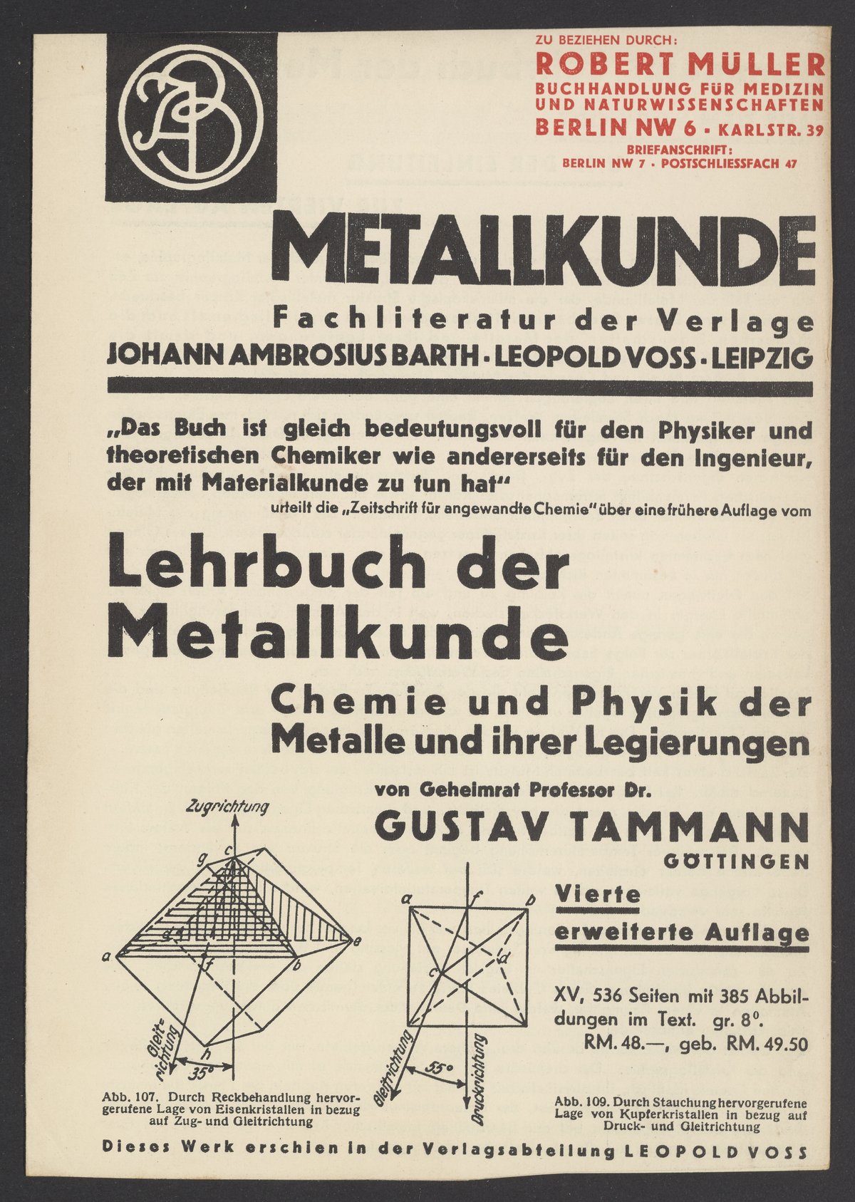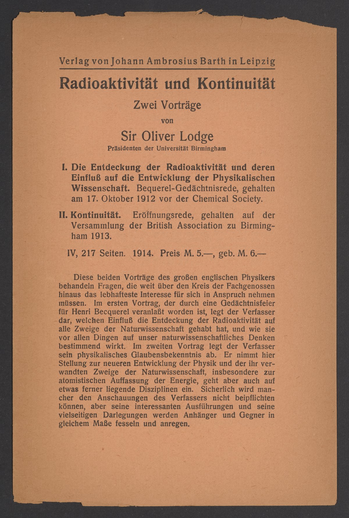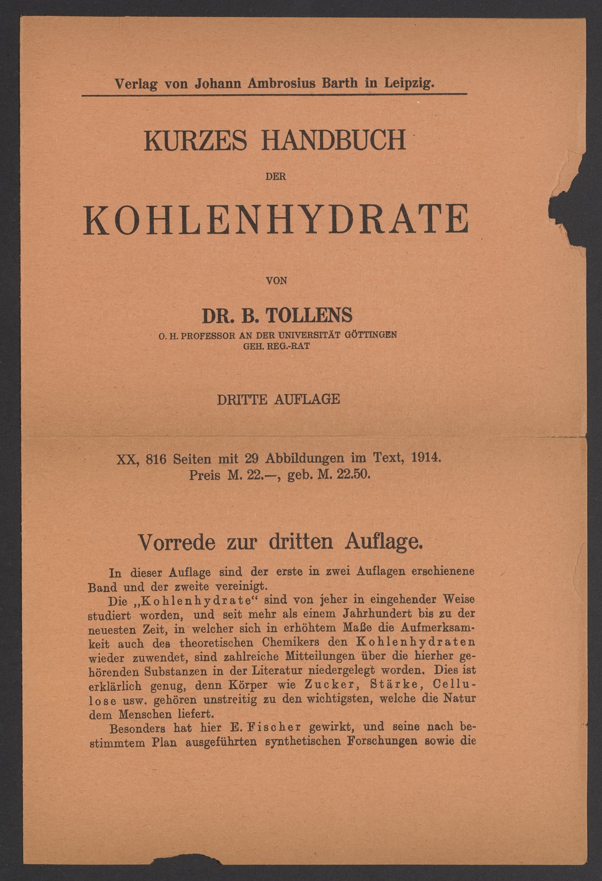 Titles listed in the advertisments include Kurzes Handbuch der Kohlenhydrate by Bernhard Tollens (1841-1918), titles by Sir Oliver Joseph Lodge (1851-1940), Die Chemie der Radio-Elemente by Frederick Soddy (1877-1956), and Lehrbuch der Metallkunde Chemie und Physik der Metalle und ihrer Legierungen by Gustav Tammann (1861-1938).