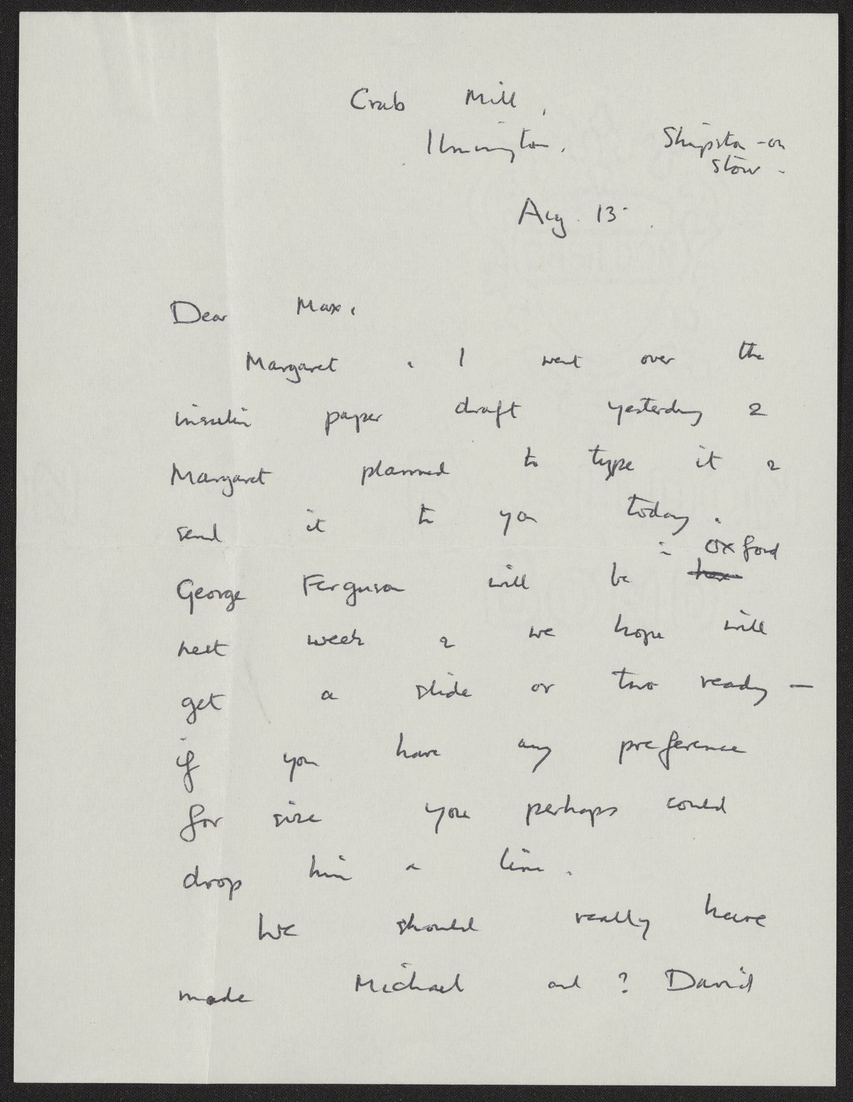 Letter from Dorothy Hodgkin to Max Perutz, August 13, 1963