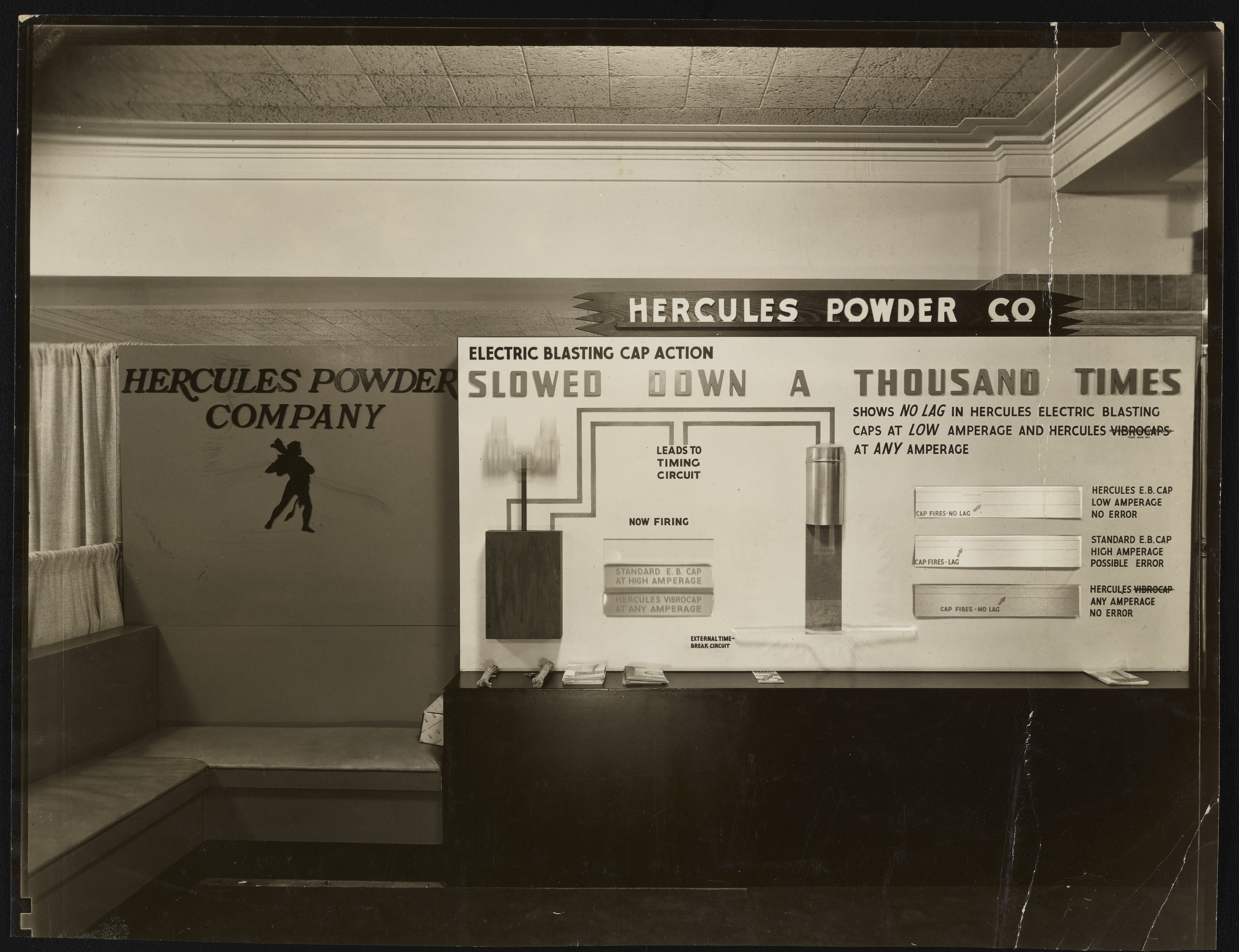 General view of an exhibition display promoting electric blasting caps manufactured and sold by the Hercules Powder Company.