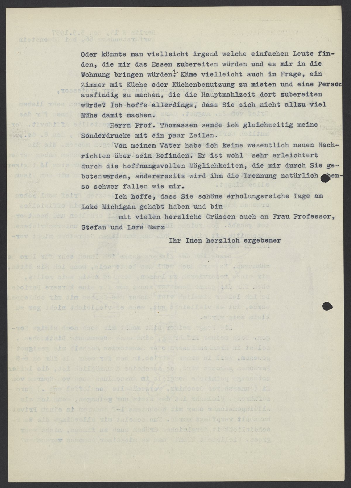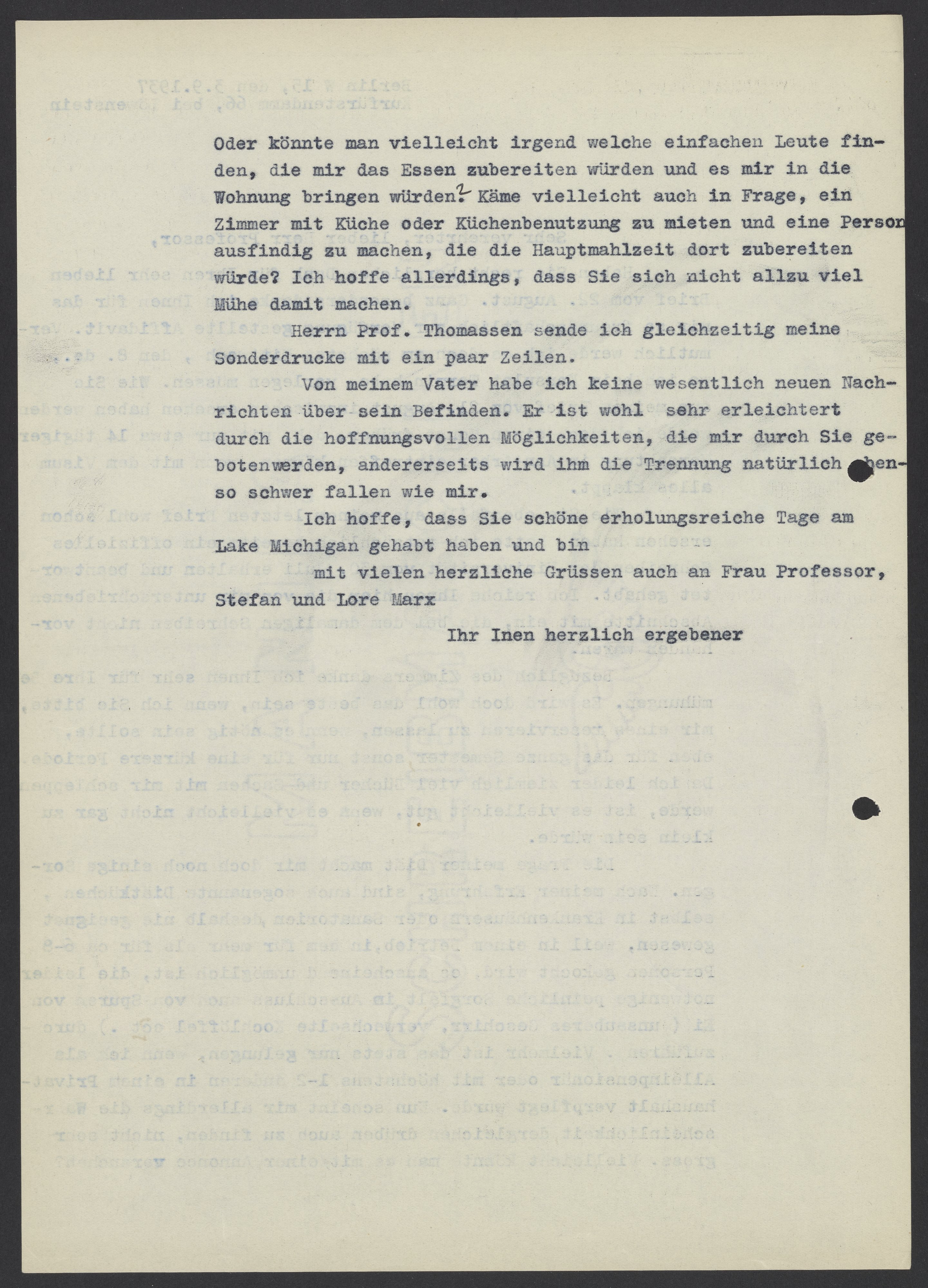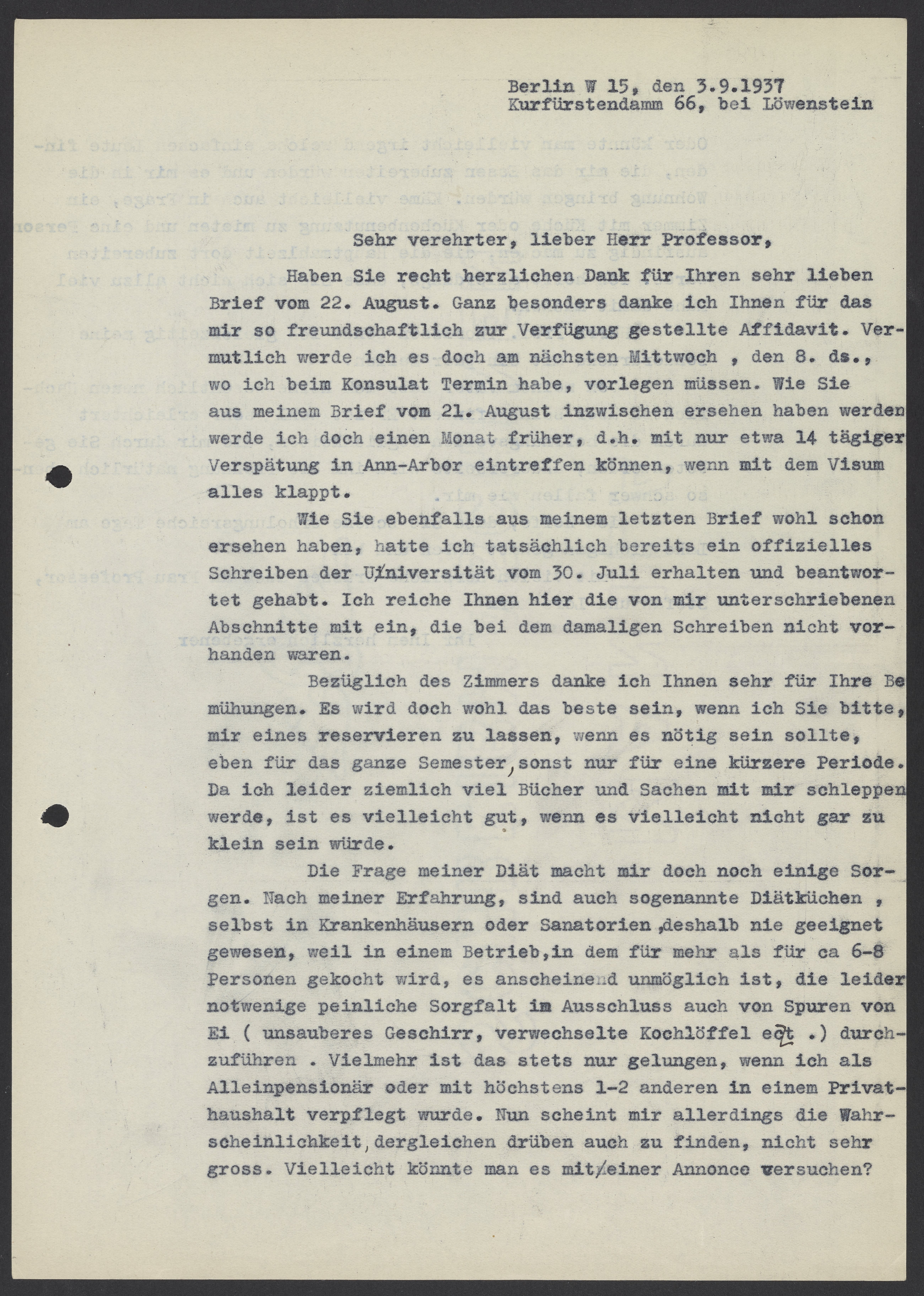 Letter from Max Bredig to Kasimir Fajans, September 3, 1937