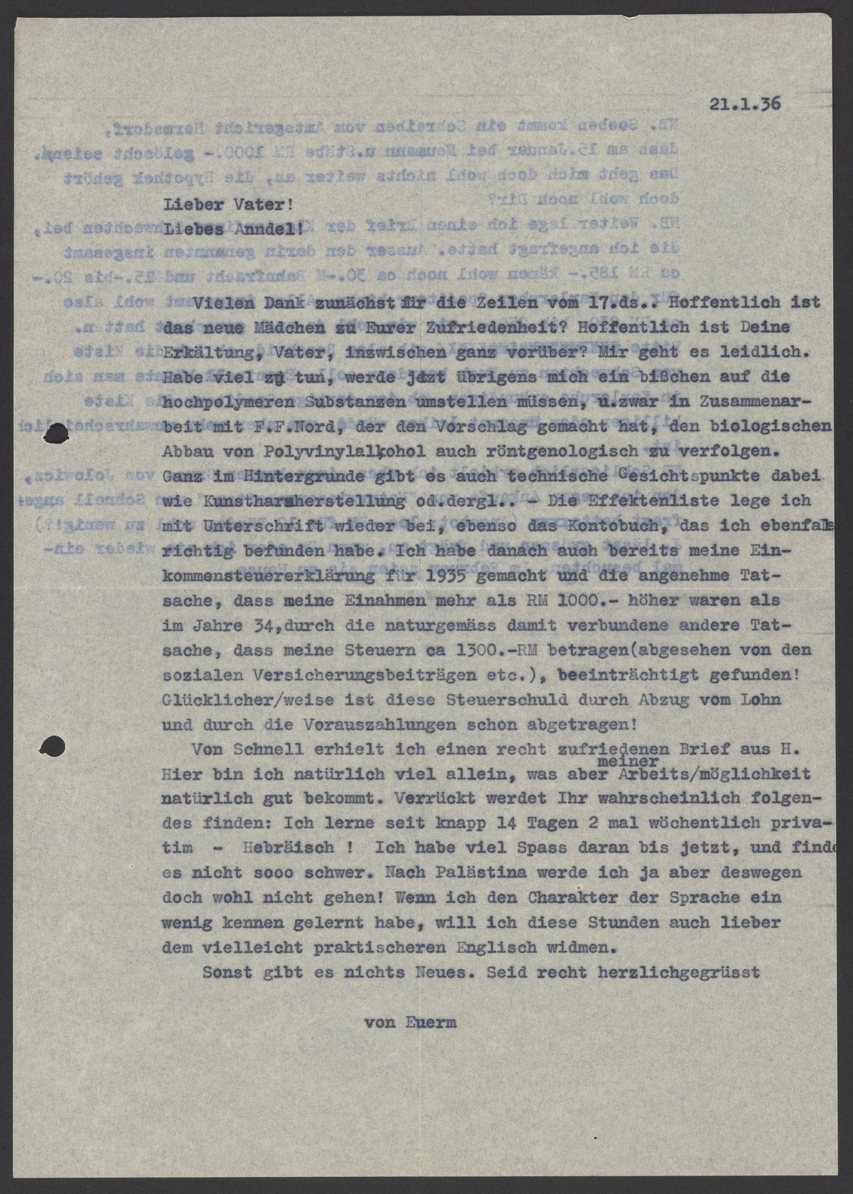 Thank you first for your letter from the 17th of this month. Hopefully you like your new maid? Father, hopefully your cold is completely gone by now. I'm doing well, but very busy. I will now have to switch to working with high-polymer substances in cooperation with F.F. Nord, who proposed that the biodegradation of polyvinyl alcohol should also be observed with X-ray technology. In addition, technical aspects like synthetic resin production are also involved. I already filed my income tax return for 1935. My income was 10,000 RM higher than in 1934 (apart from the insurance contributions etc.), and thus I had to pay 1,300 RM in taxes. Fortunately, this tax liability has already been paid off by deducting my wages and paying in advance.