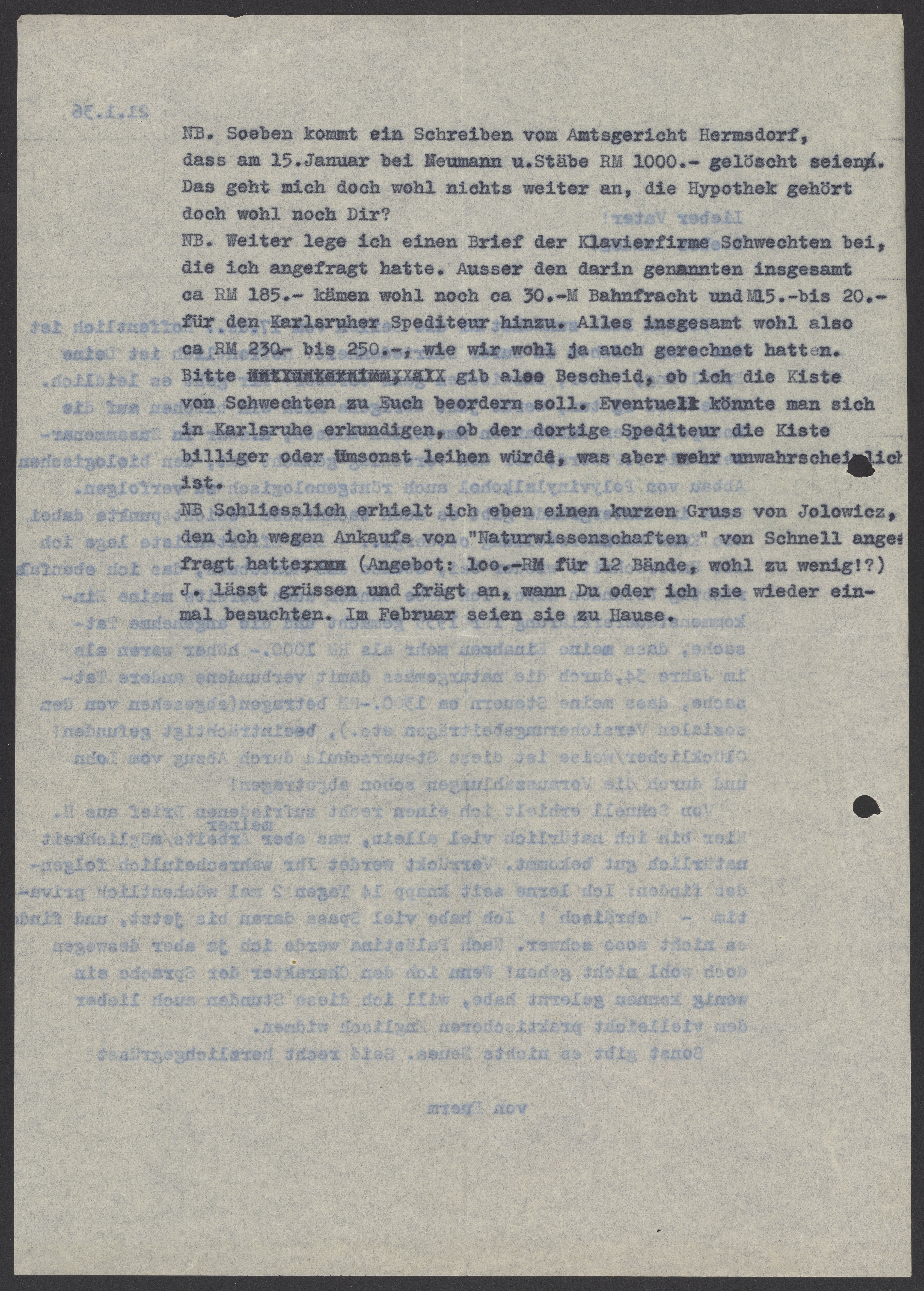 NB. Soeben kommt ein Schreiben vom Amtsgericht Hermsdorf, dass an 15. Januar bei Neumann u. Stäbe RM 1000.- gelöscht seien. Das geht mich doch wohl nichts weiter an, die Hypothek gehört doch wohl noch Dir?