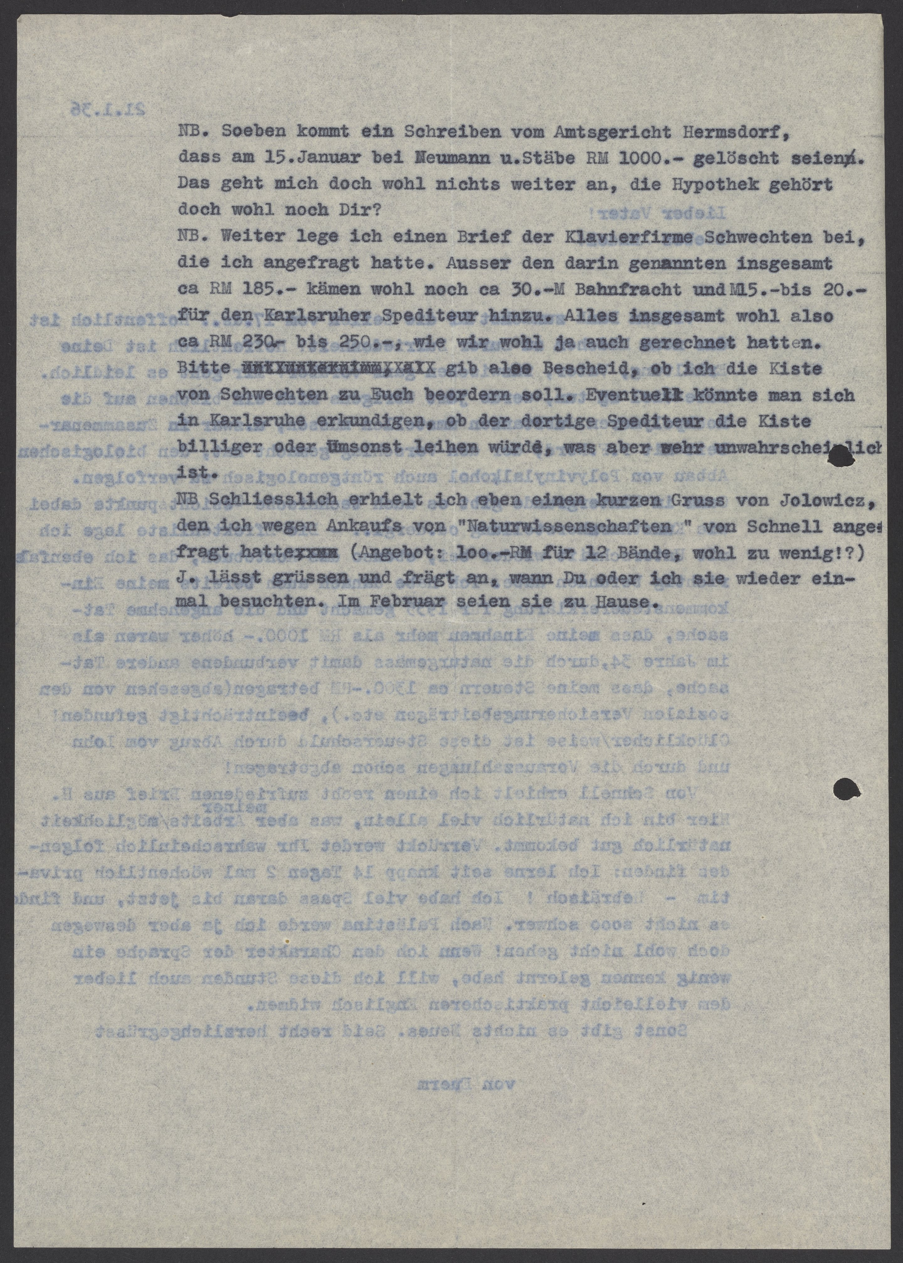 NB Schliesslich erhielt ich eben einen kurzen Gruss von Jolowicz, den ich wegen Ankaufs von "Naturwissenschaften" von Schnell angefragt hatte (Angebot: 100.-RM für 12 Bände, wohl zu wenig!?) J. lässt grüssen und fragt an, wann Du oder ich sie wieder einmal besuchten. Im Februar seien sie zu Hause.