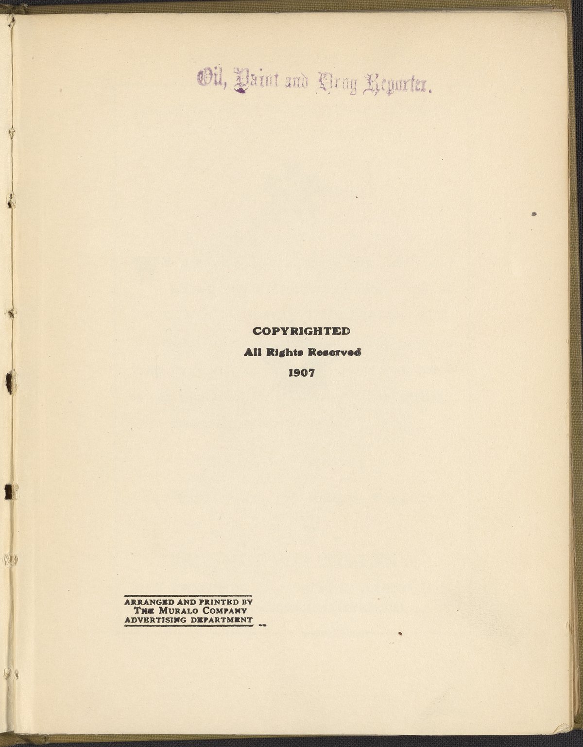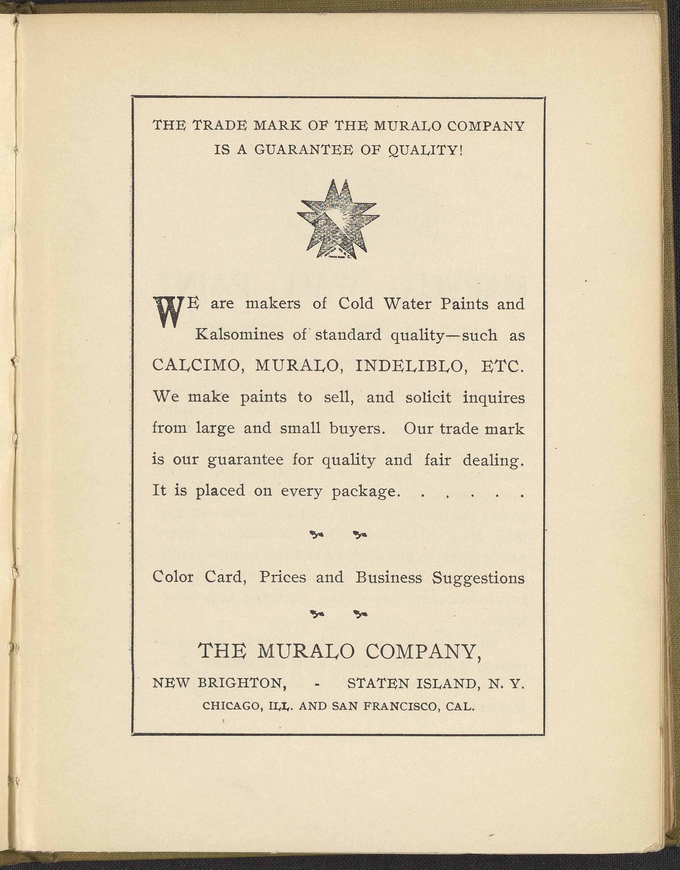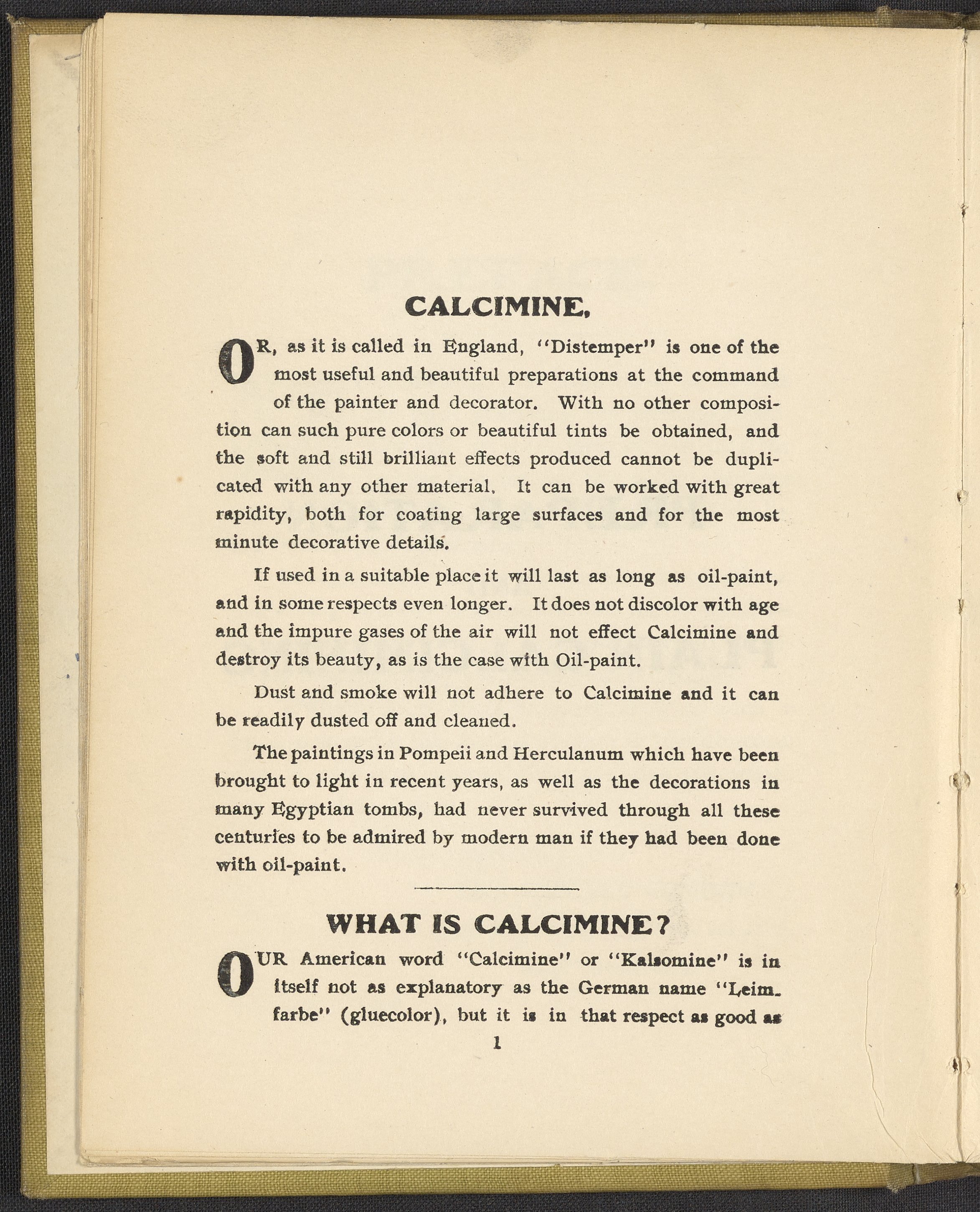 Small JPG1200 x 1535px — 521 KBFull-sized JPG2278 x 2914px — 1.6 MBOriginal fileTIFF — 2278 x 2914px — 19.1 MBVolume describes the properties, varieties, and application process of calcimine wall color treatment. The work includes color plates showing color relationships, Calcimo brand wall colors for sale from the Muralo company, and decorative schemes. The frontispiece depicts a black-and-white portrait of the author. Work is digitized in its entirety.